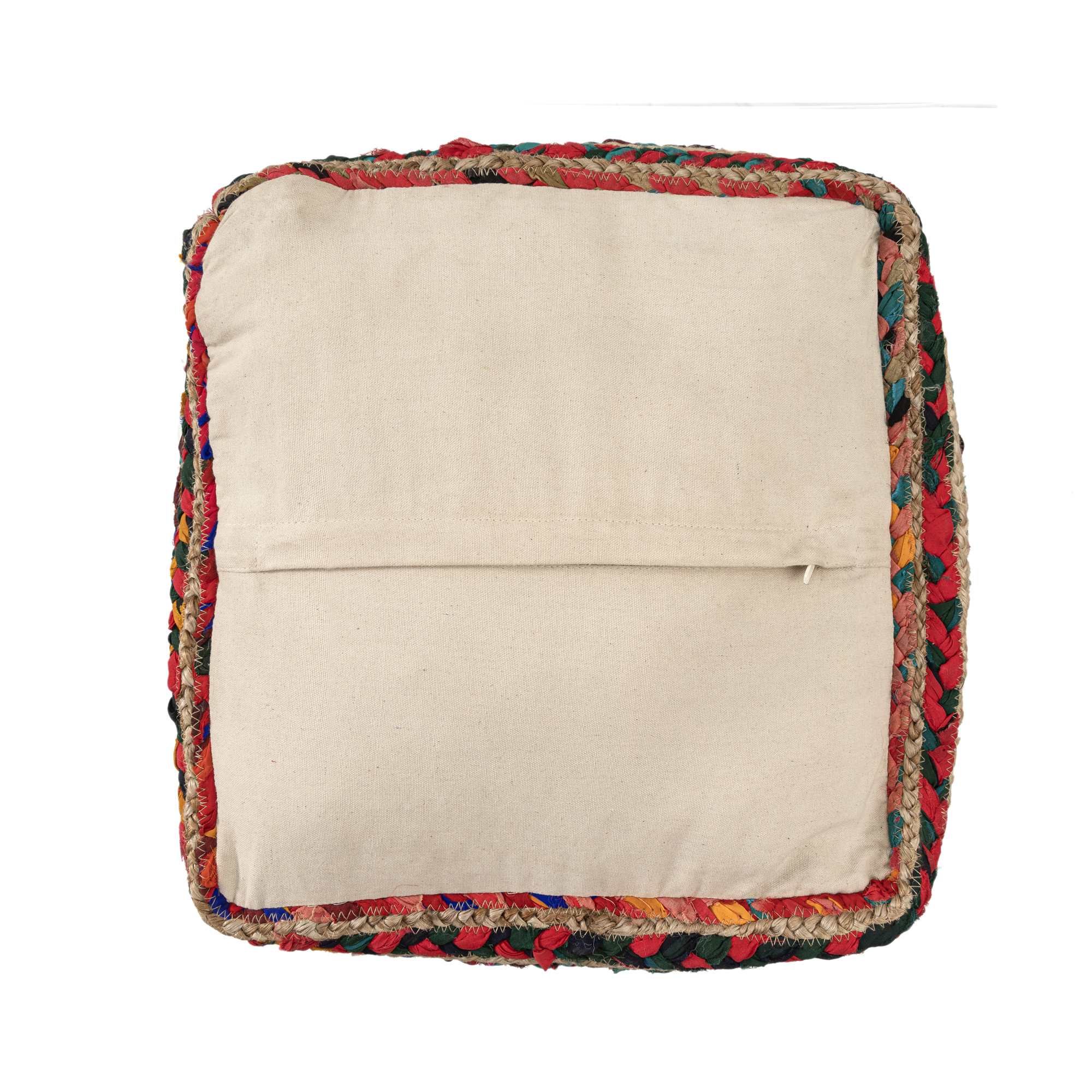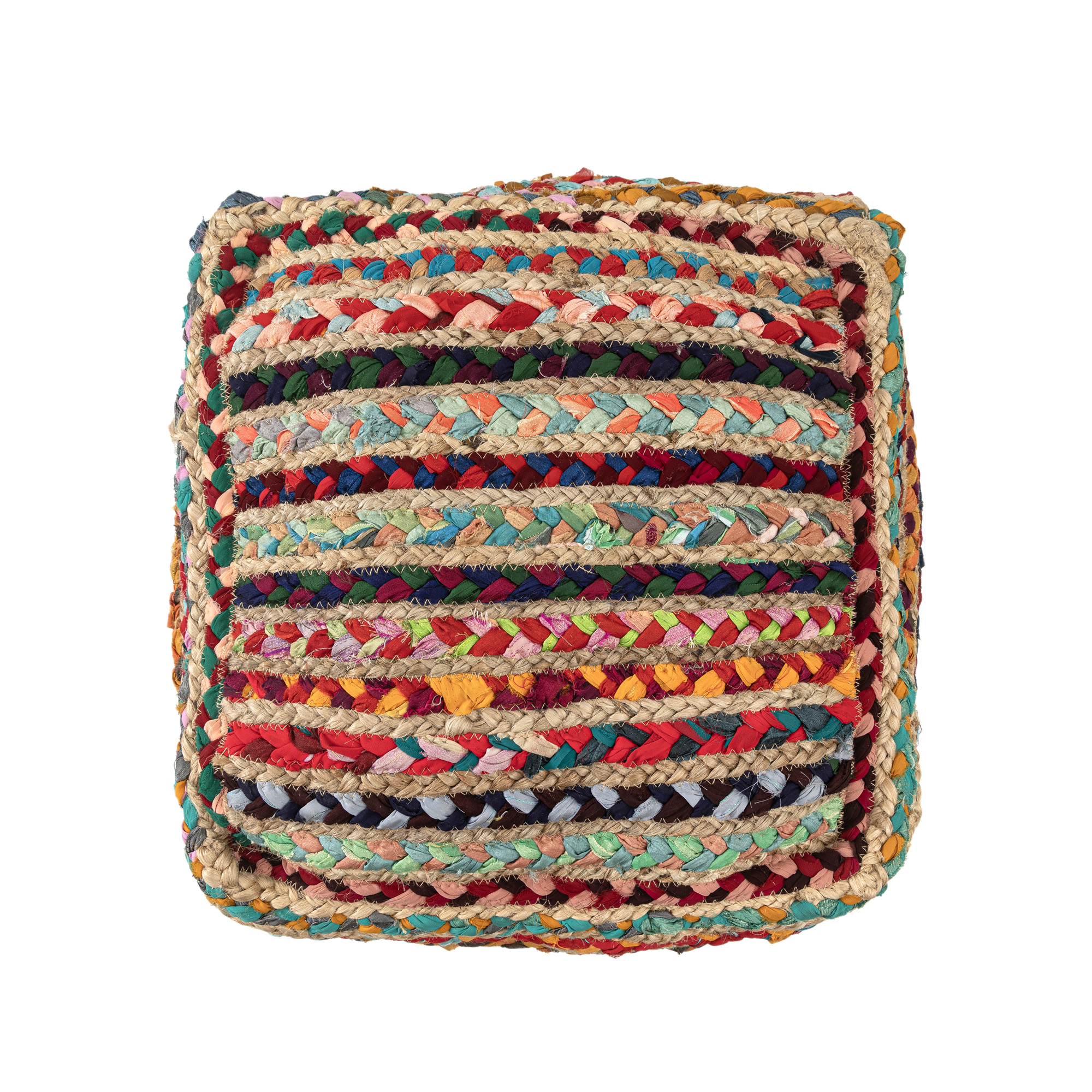 This exquisite piece is meticulously hand-braided in India, combining 50% jute and 50% polyester for a durable and stylish finish. Its striped pattern and Bohemian eclectic design make it a versatile addition to various transitional and casual interiors. Use it as an ottoman, extra seating, or a chic accent piece. The Square pouf features a multicolor palette, adding a vibrant touch to your decor. Filled with EPS balls for comfort and support, Ideal for creating a cozy, laid-back atmosphere, this chindi pouf blends functionality with artistic flair, making it a must-have for any home.