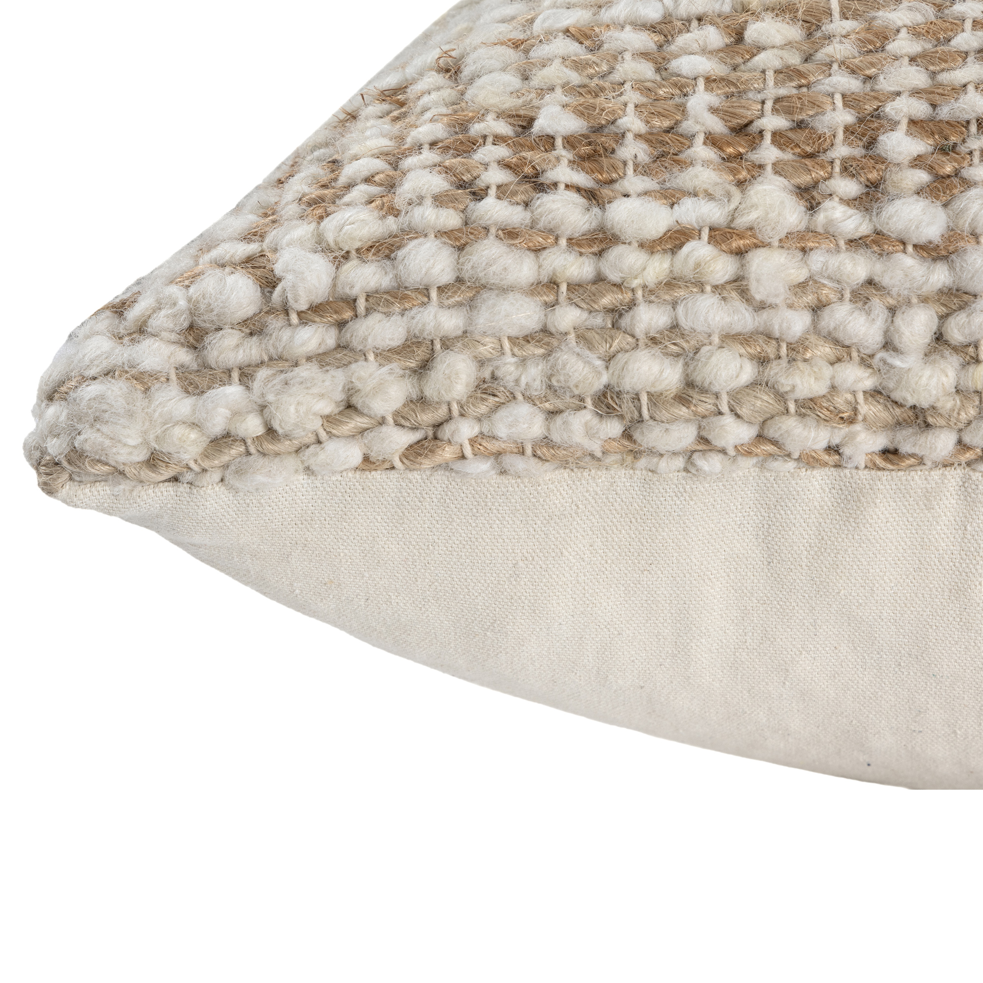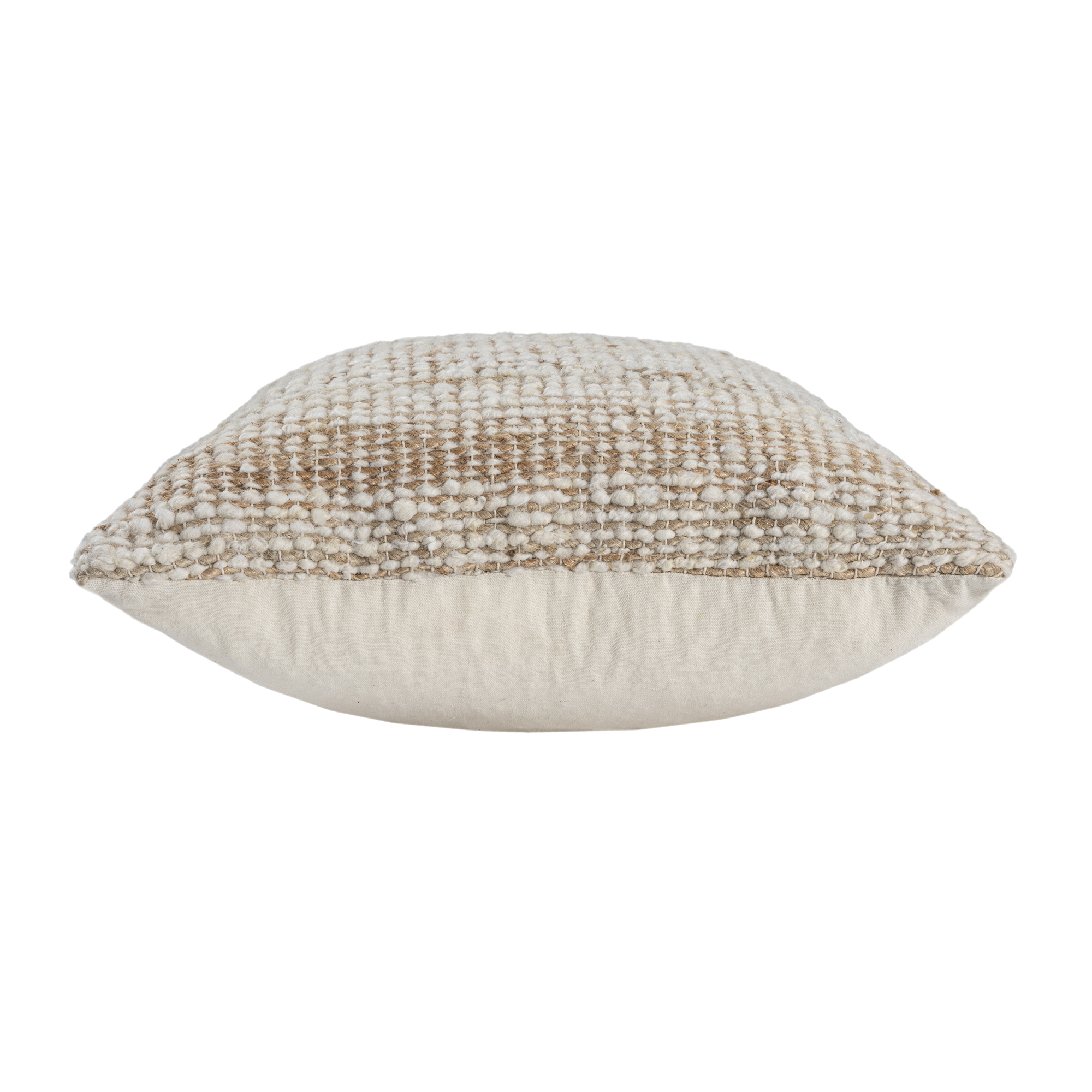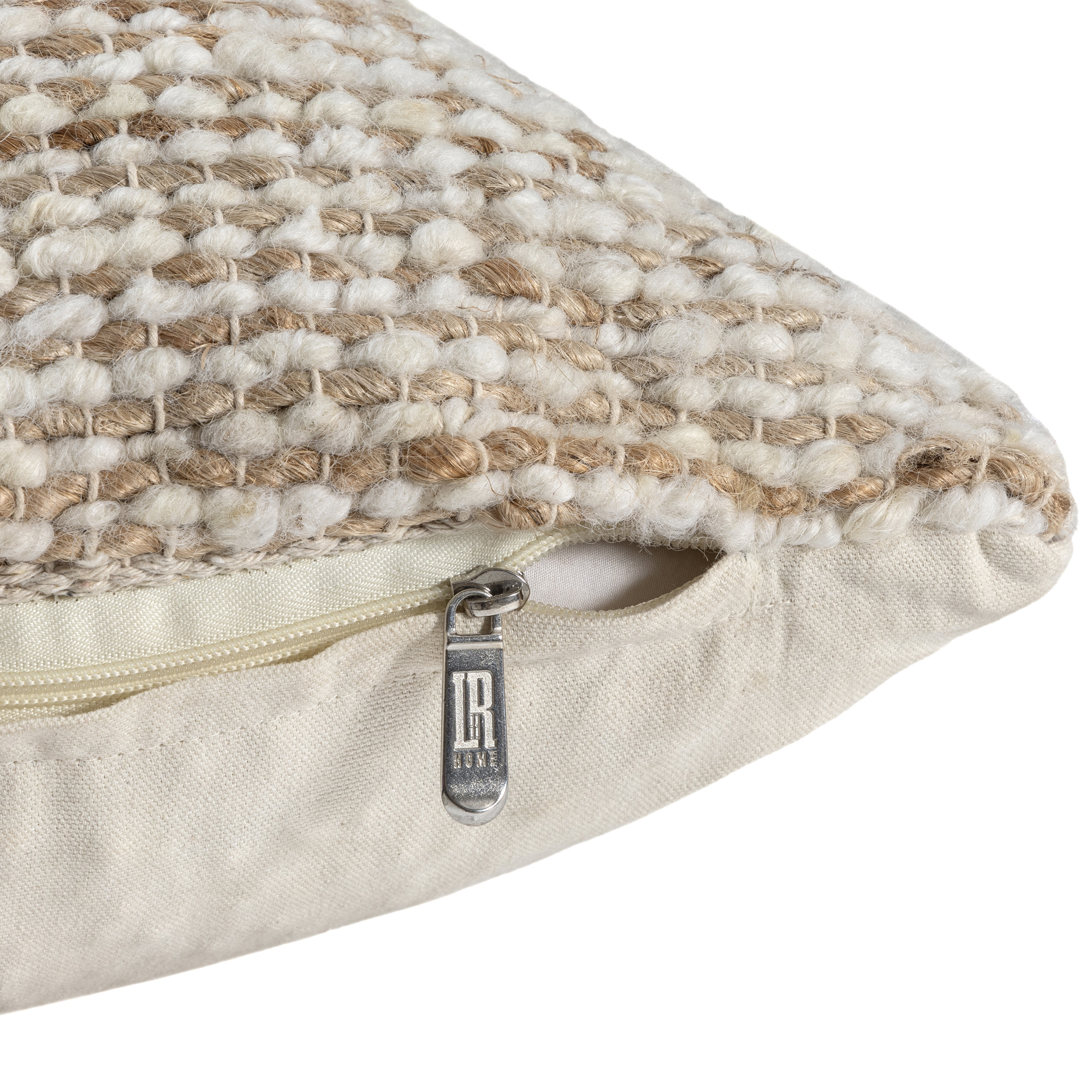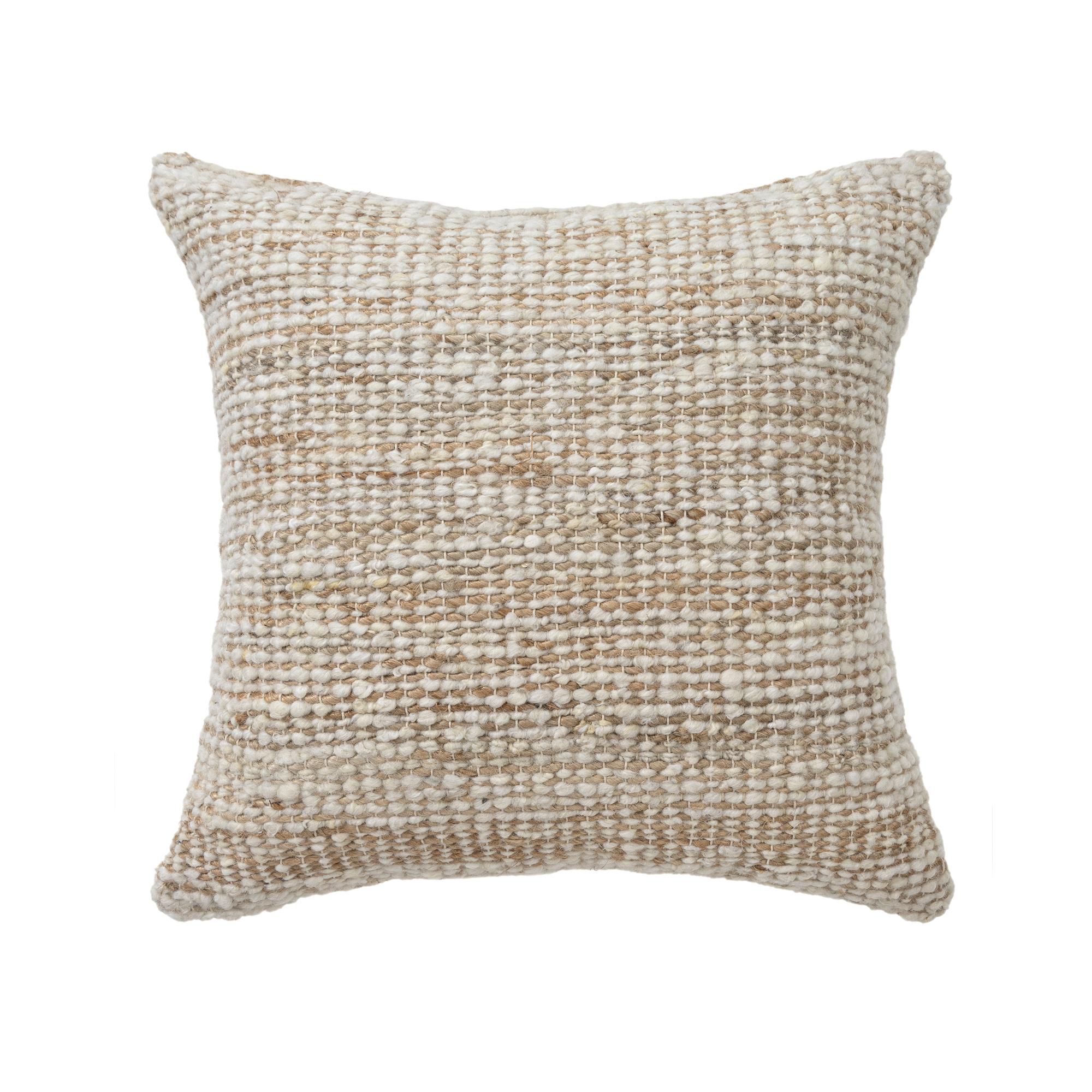 Bring rustic elegance to your space with this hand-woven distressed pillow cover in brown and ivory. Made in India from a durable blend of 60% wool, 35% jute, and 5% cotton, it features a subtle striped front and solid beige back. The natural fibers offer a soft yet resilient texture, ideal for farmhouse and transitional decor. A hidden zipper closure ensures easy insert placement (insert not included) and a clean, polished look.