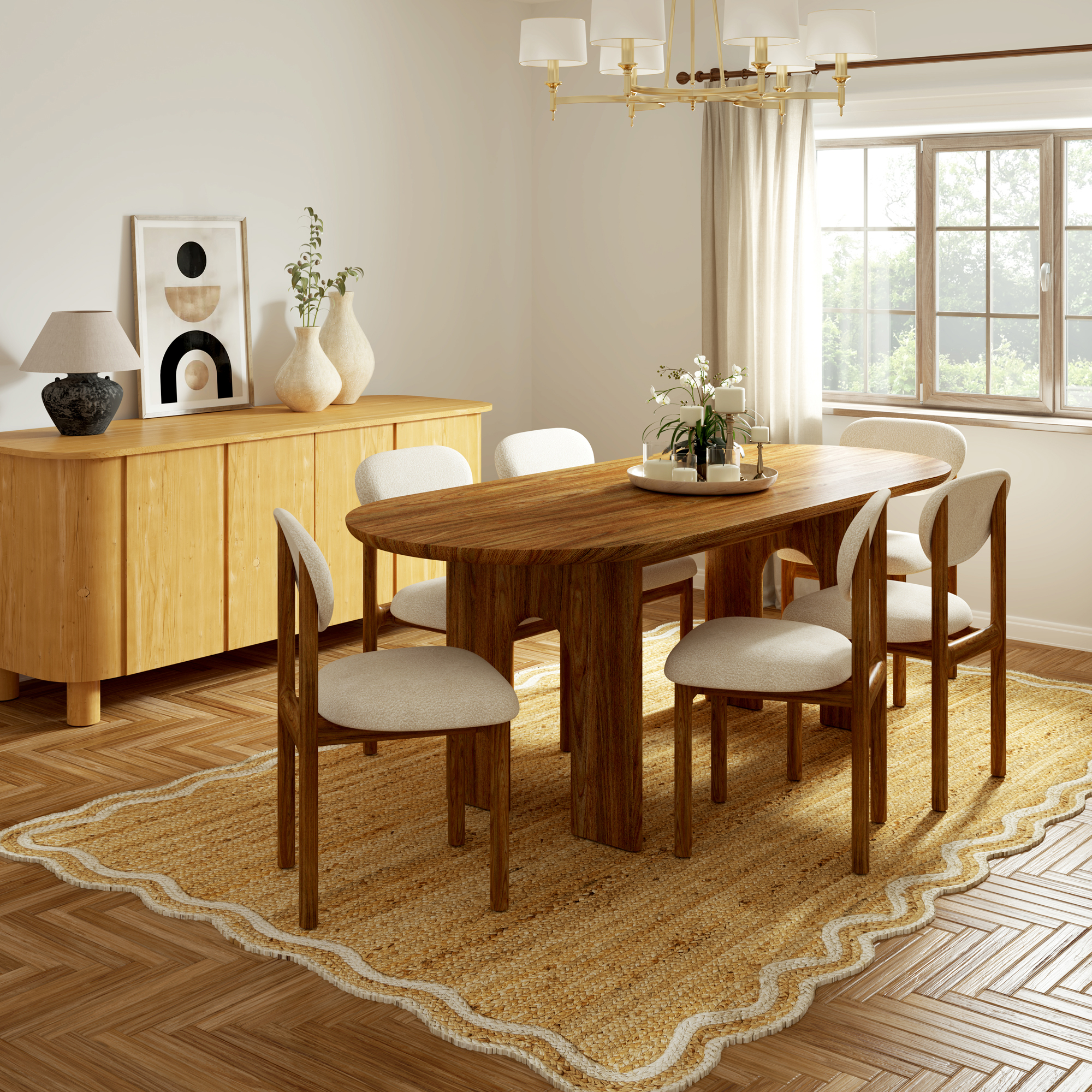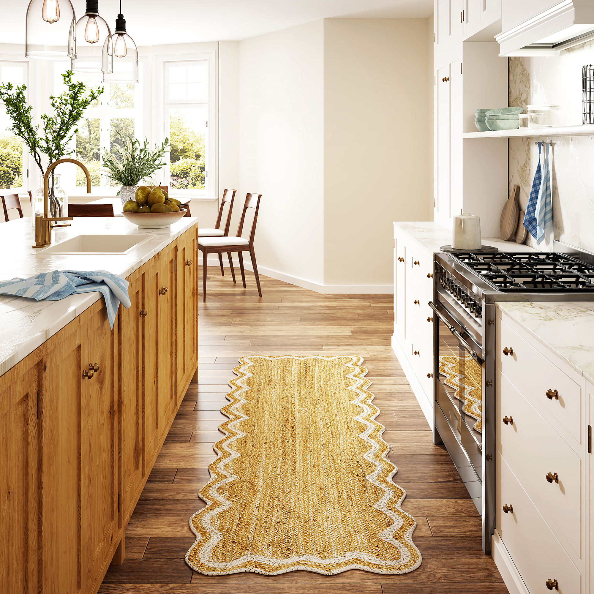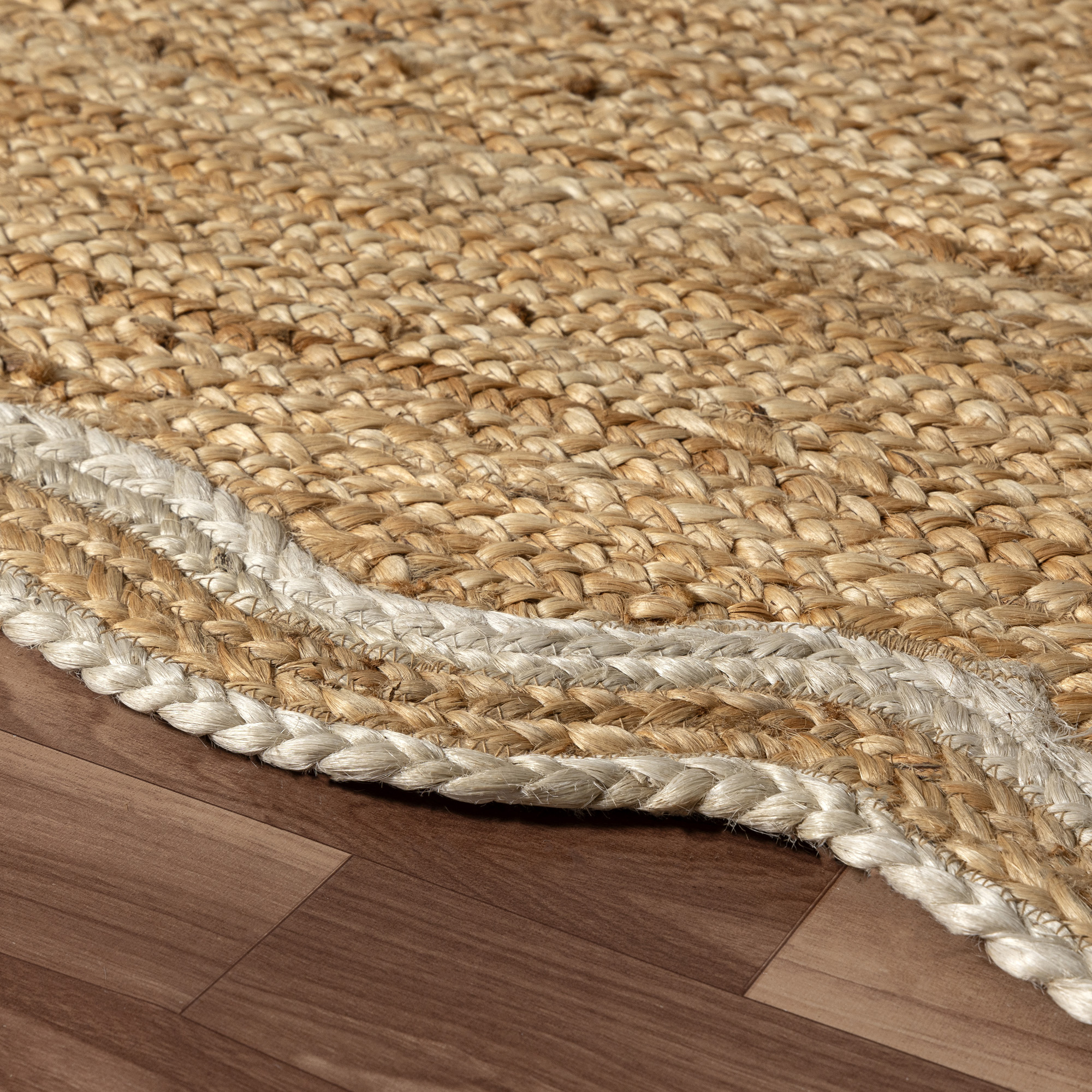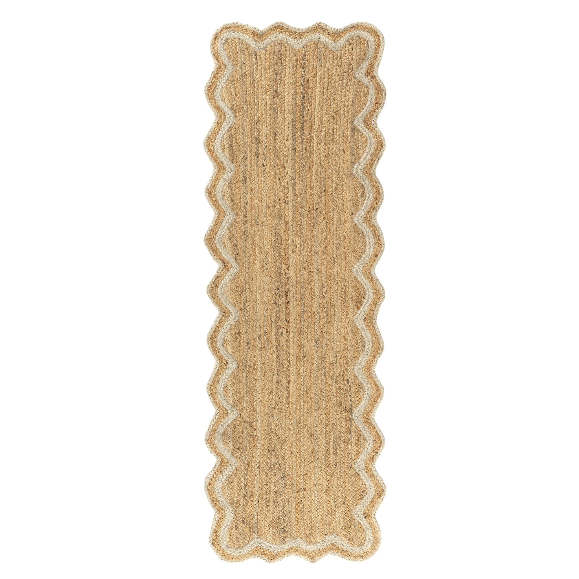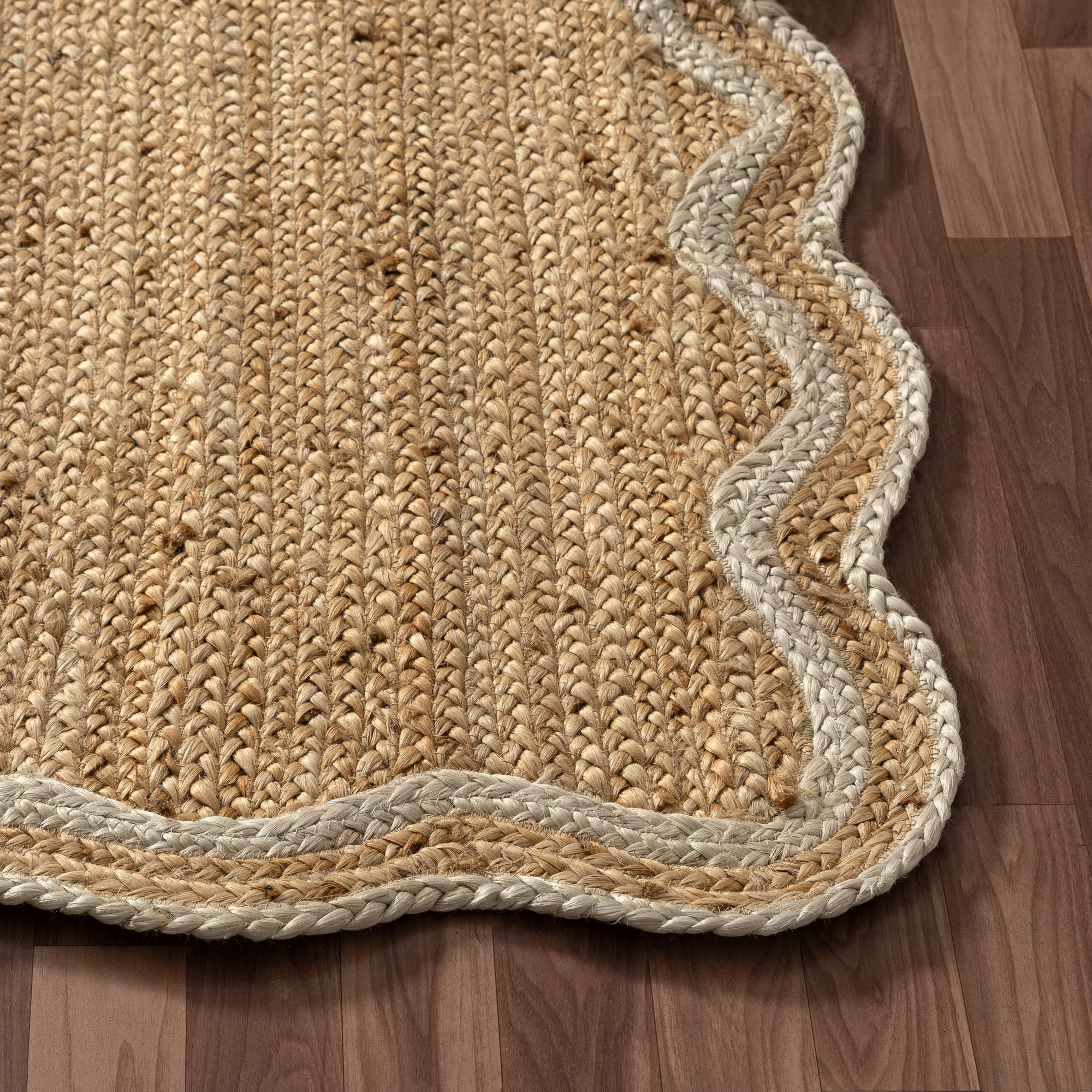 Enhance your space with this hand-braided jute area rug in natural brown and ivory. Crafted from 100% natural jute, this eco-friendly rug features a double ivory border and decorative scalloped edges, perfect for farmhouse, bohemian, and coastal décor. The durable braided construction adds rich texture and a soft yet sturdy feel underfoot. A clear latex non-slip backing keeps the rug in place and helps the scalloped edges lay flat. Ideal for living rooms, bedrooms, dorms, or apartments, this rug suits adults, kids, and transitional spaces alike. Designed to maintain its shape and beauty over time.