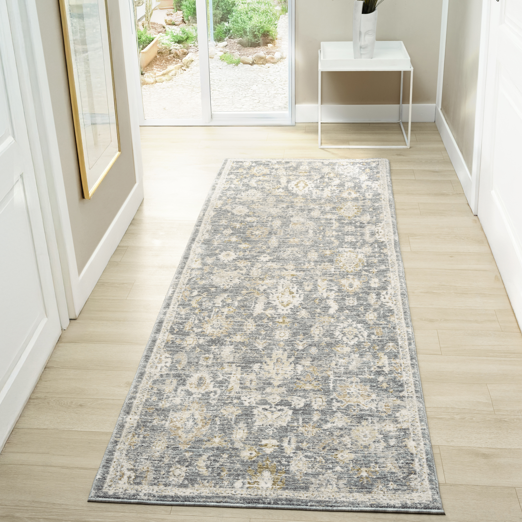 Transform your space with this area rug, designed to bring warmth, charm, and timeless appeal to your home, apartment, or dorm. Crafted with a distressed floral damask design in shades of cream, ivory, and blue, it blends vintage inspiration with traditional elegance, making it an ideal accent for transitional or farmhouse decor. The soft polyester pile ensures both comfort underfoot and durability for everyday use in high-traffic areas. Perfectly sized at 2’3″ x 3’6″ for hallways, kitchens, bathrooms, or entryways, this rug adds a refined and inviting touch to any room.