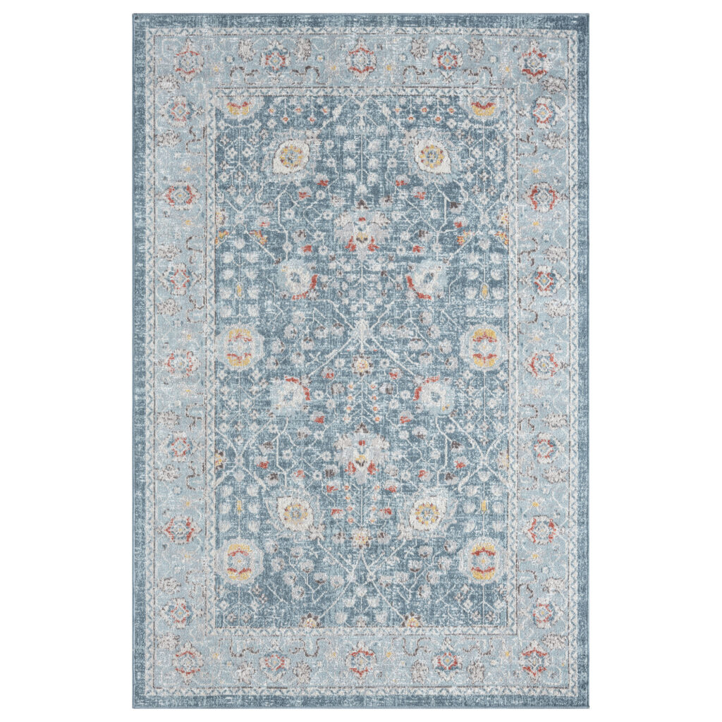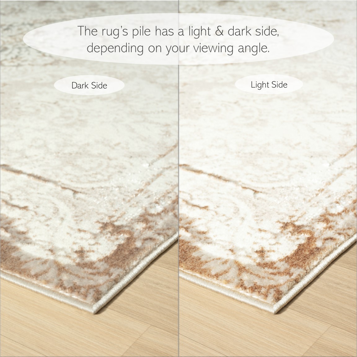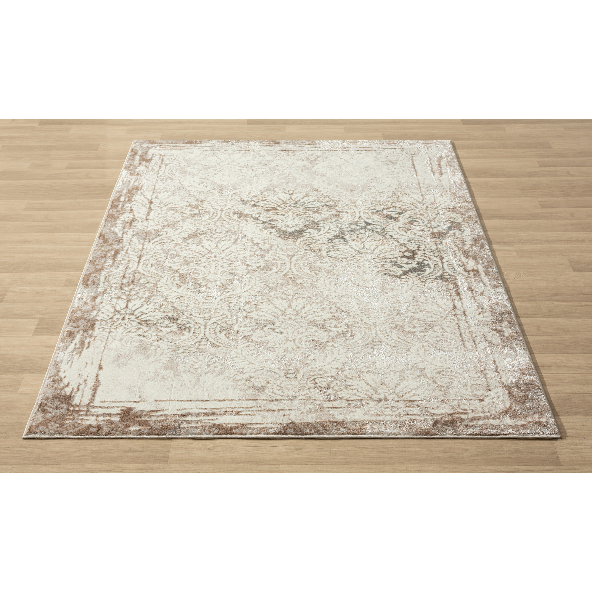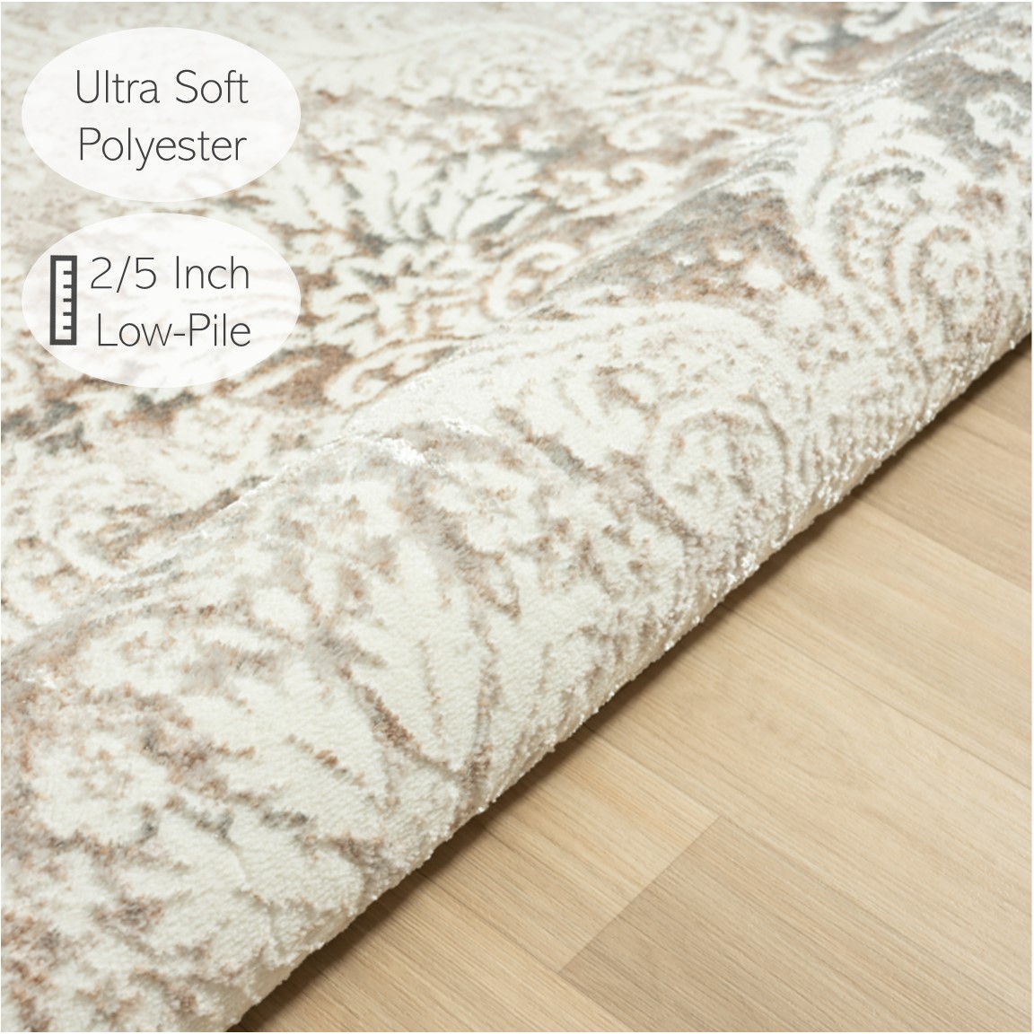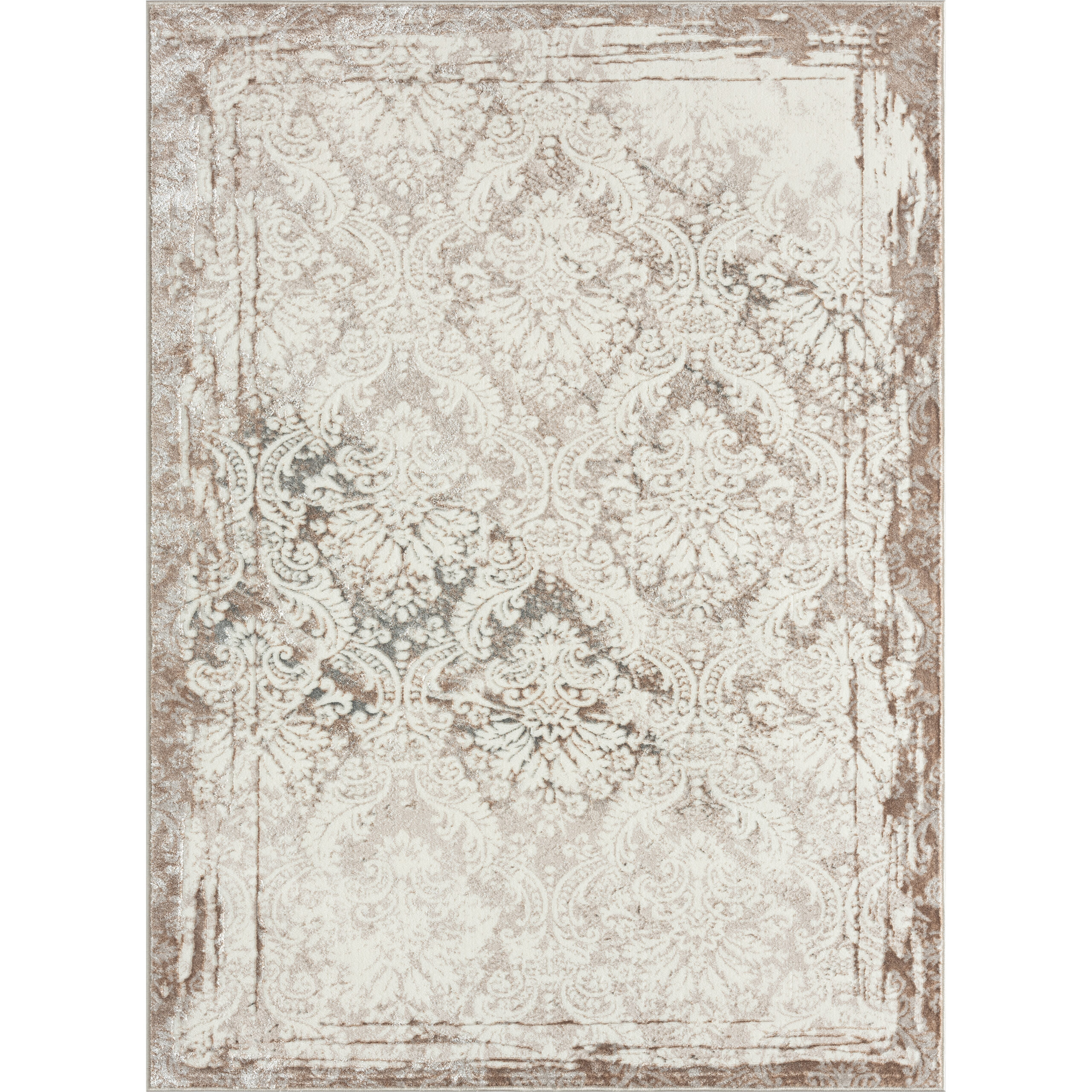 Introduce warmth and style to your living space with this charming area rug. A large-scale bordered damask pattern graces this piece in shades of gray, beige, and cream, creating an eye-catching foundation for entryways, hallways, kitchens, bathrooms, and any indoor area. Each rug is power-loomed using traditional techniques out of polyester fibers with a cotton backing, which allow you to enjoy high-end design without sacrificing comfort or durability. Perfect for a wide range of décor styles and ages including adult, teen, tween, and kids, this beautiful rug will do well in any area of your home. The polyester pile of this rug provides a shimmering effect at different angles. The performance materials are fade, stain, and moisture resistant making it ideal for high-traffic areas and homes with pets or children.