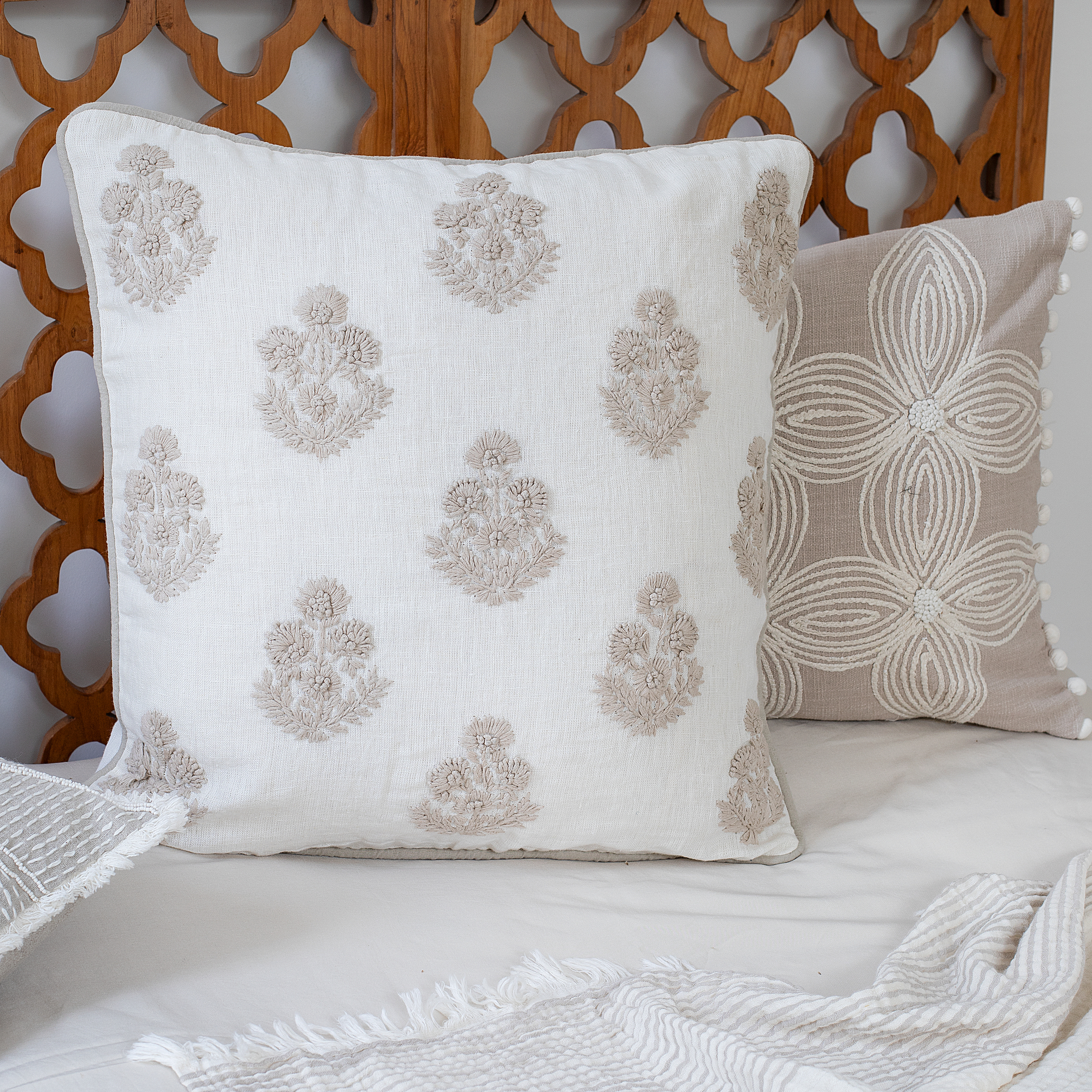 Add extra style to your living room or bedroom with this lovely throw pillow. Flaunting elegant neutral tones, you can easily blend this piece with the rest of your decor. Intricately crafted in India using 100% linen, this throw pillow will surely last for years.
