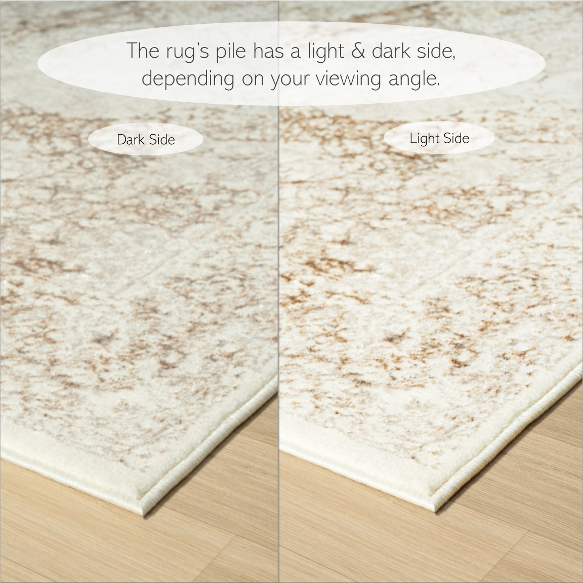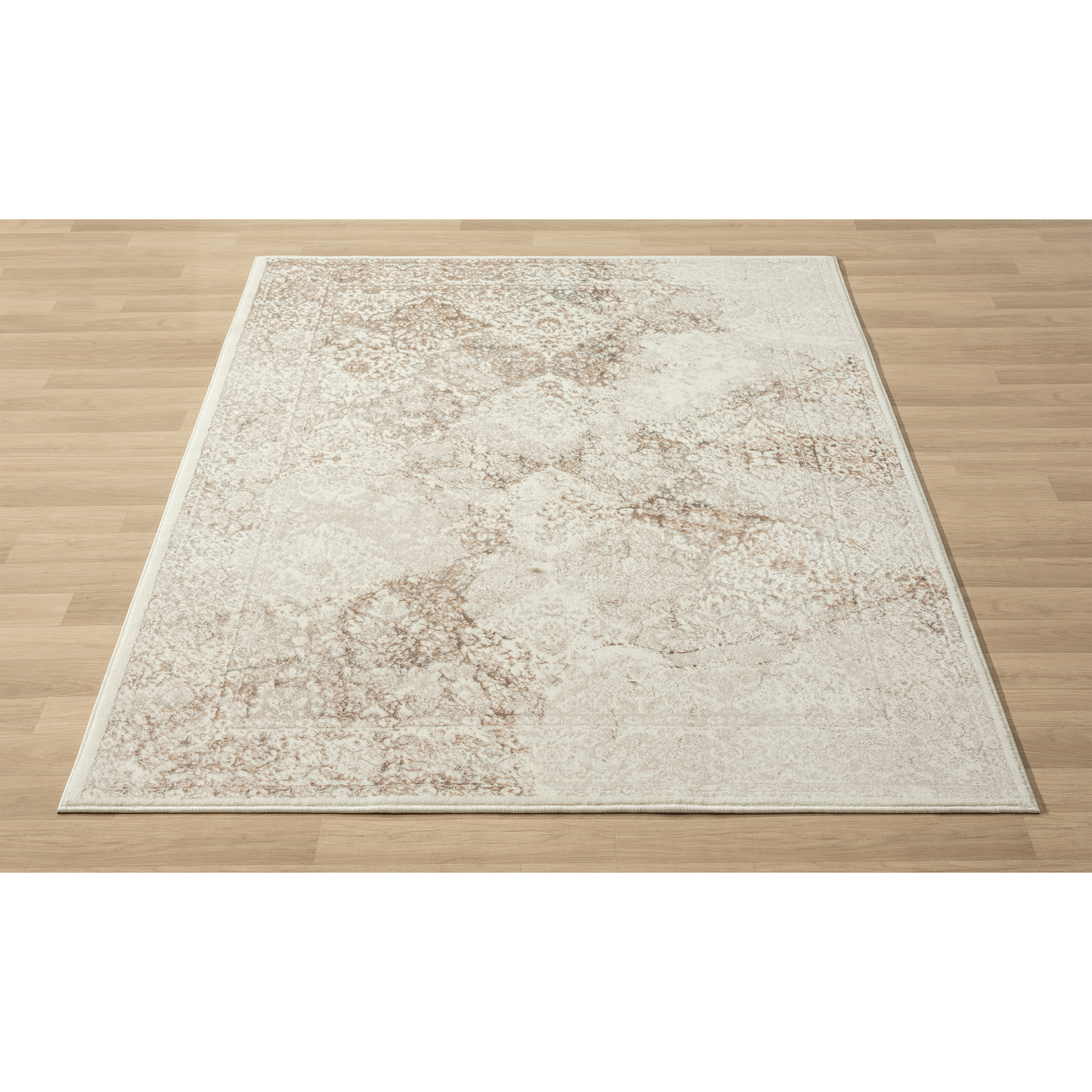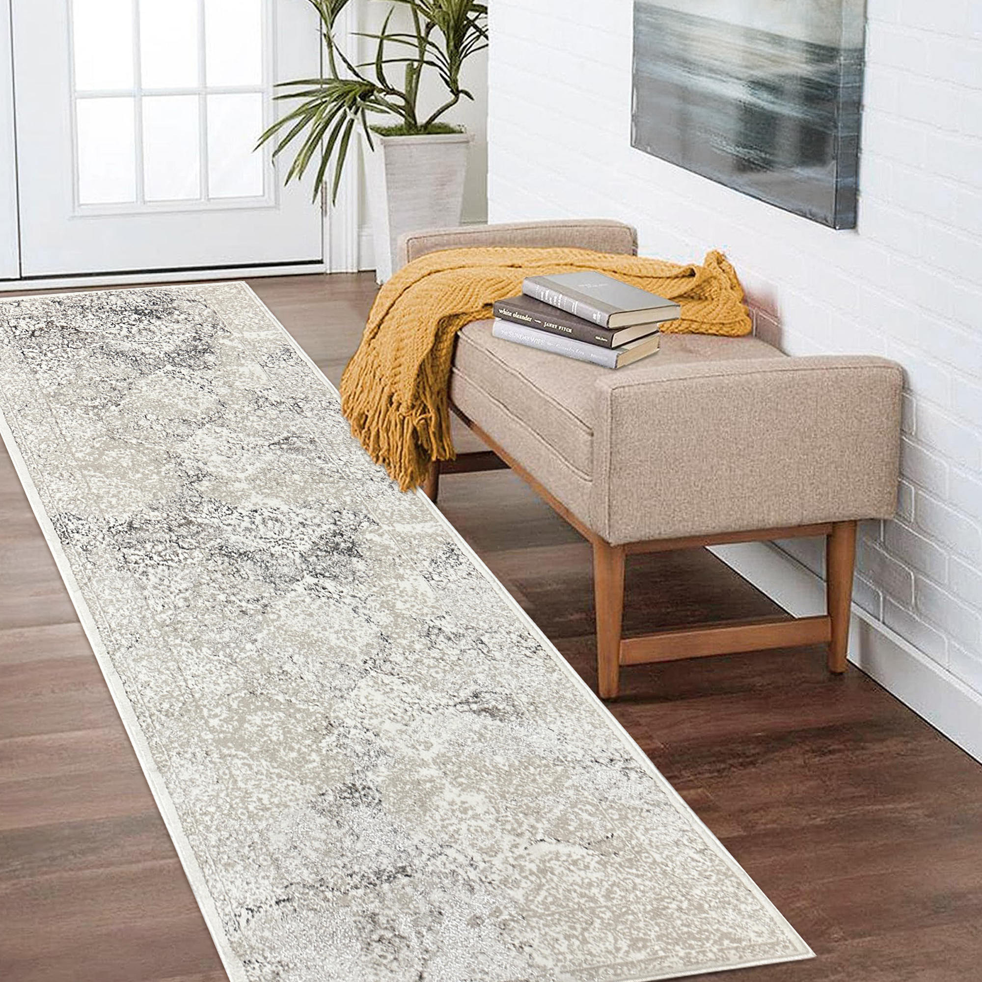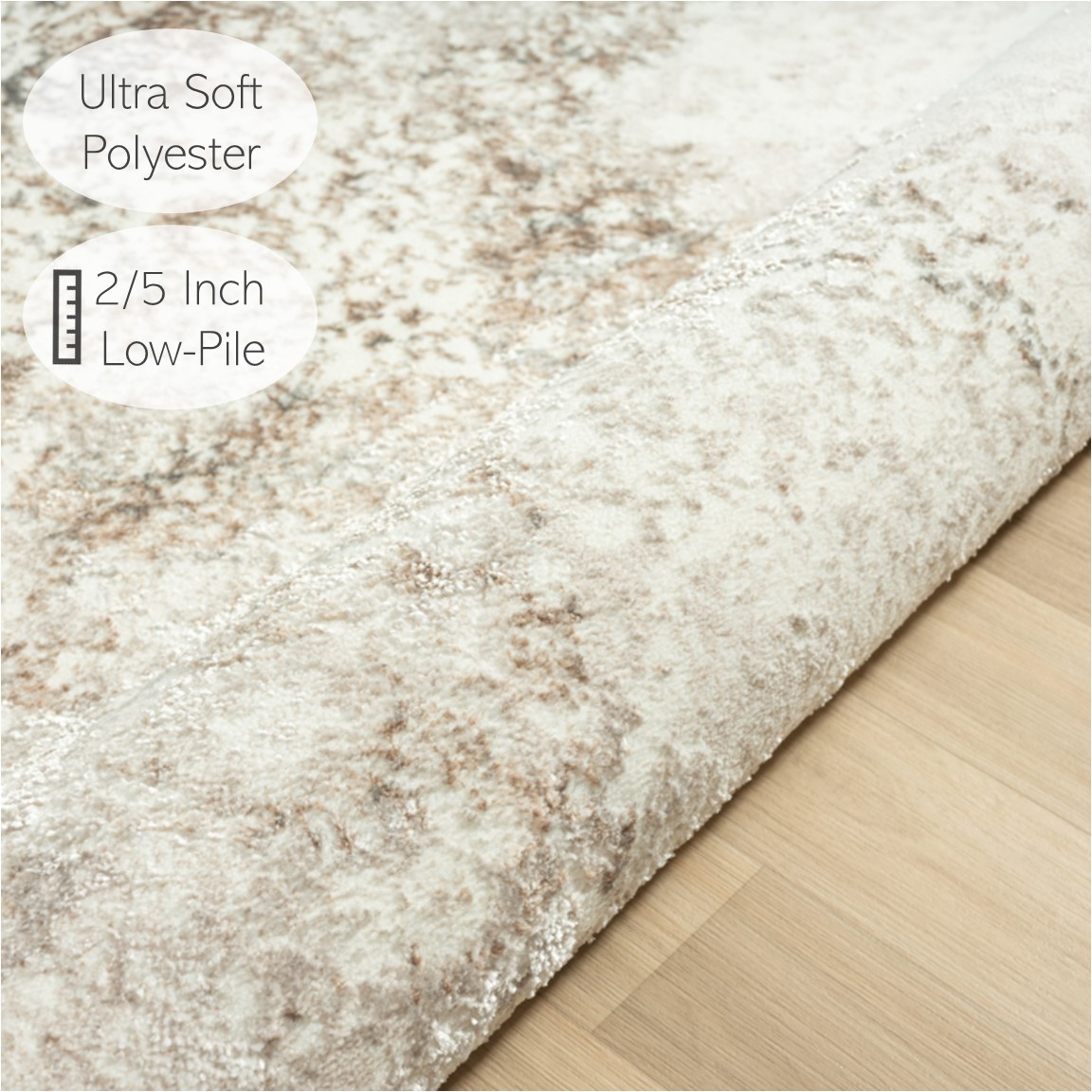 Introduce warmth and style to your living space with this charming area rug. A large-scale bordered damask pattern graces this piece in shades of gray, beige, and cream, creating an eye-catching foundation for entryways, hallways, kitchens, bathrooms, and any indoor area. Each rug is power-loomed using traditional techniques out of polyester fibers with a cotton backing, which allow you to enjoy high-end design without sacrificing comfort or durability. Perfect for a wide range of décor styles and ages including adult, teen, tween, and kids, this beautiful rug will do well in any area of your home. The polyester pile of this rug provides a shimmering effect at different angles. The performance materials are fade, stain, and moisture resistant making it ideal for high-traffic areas and homes with pets or children.