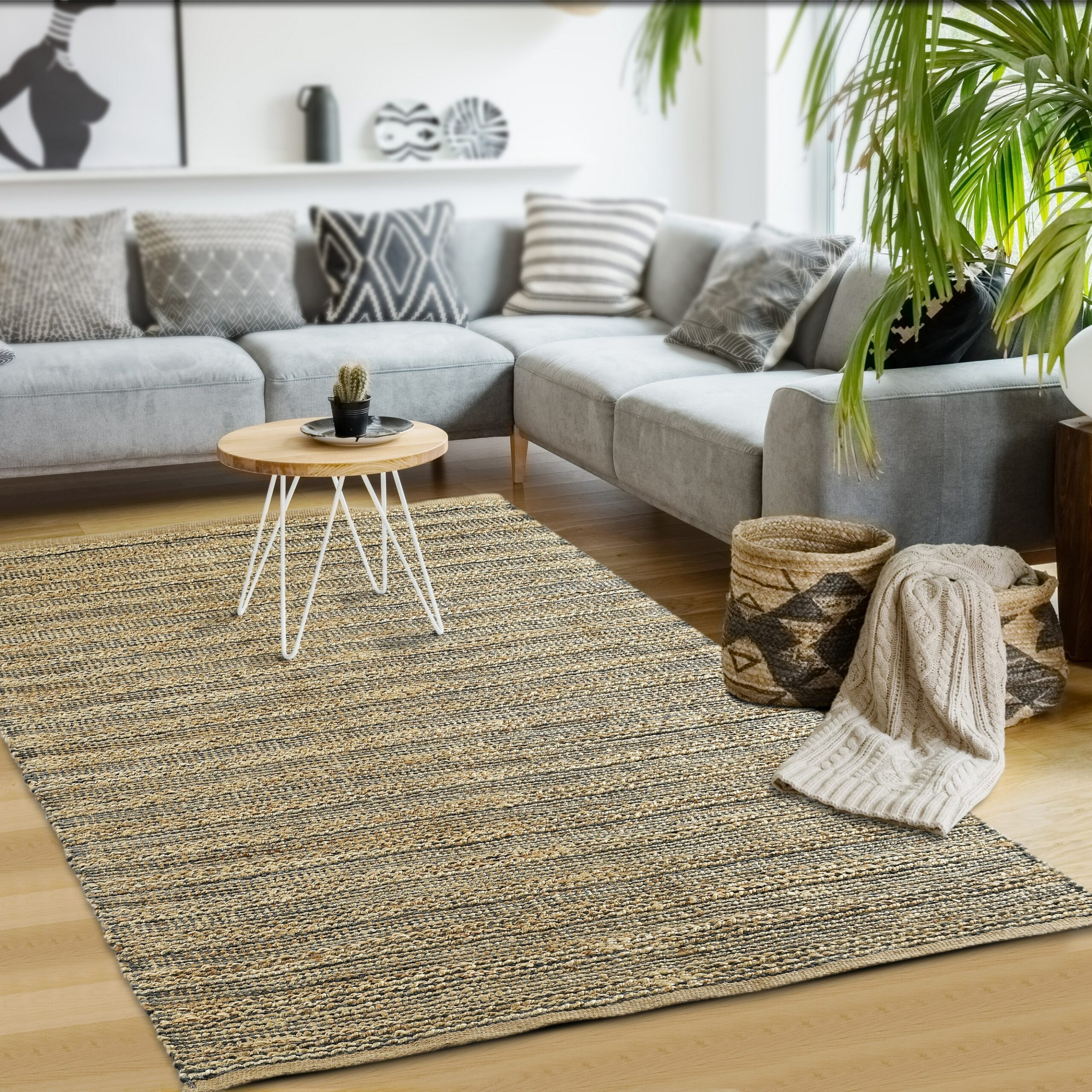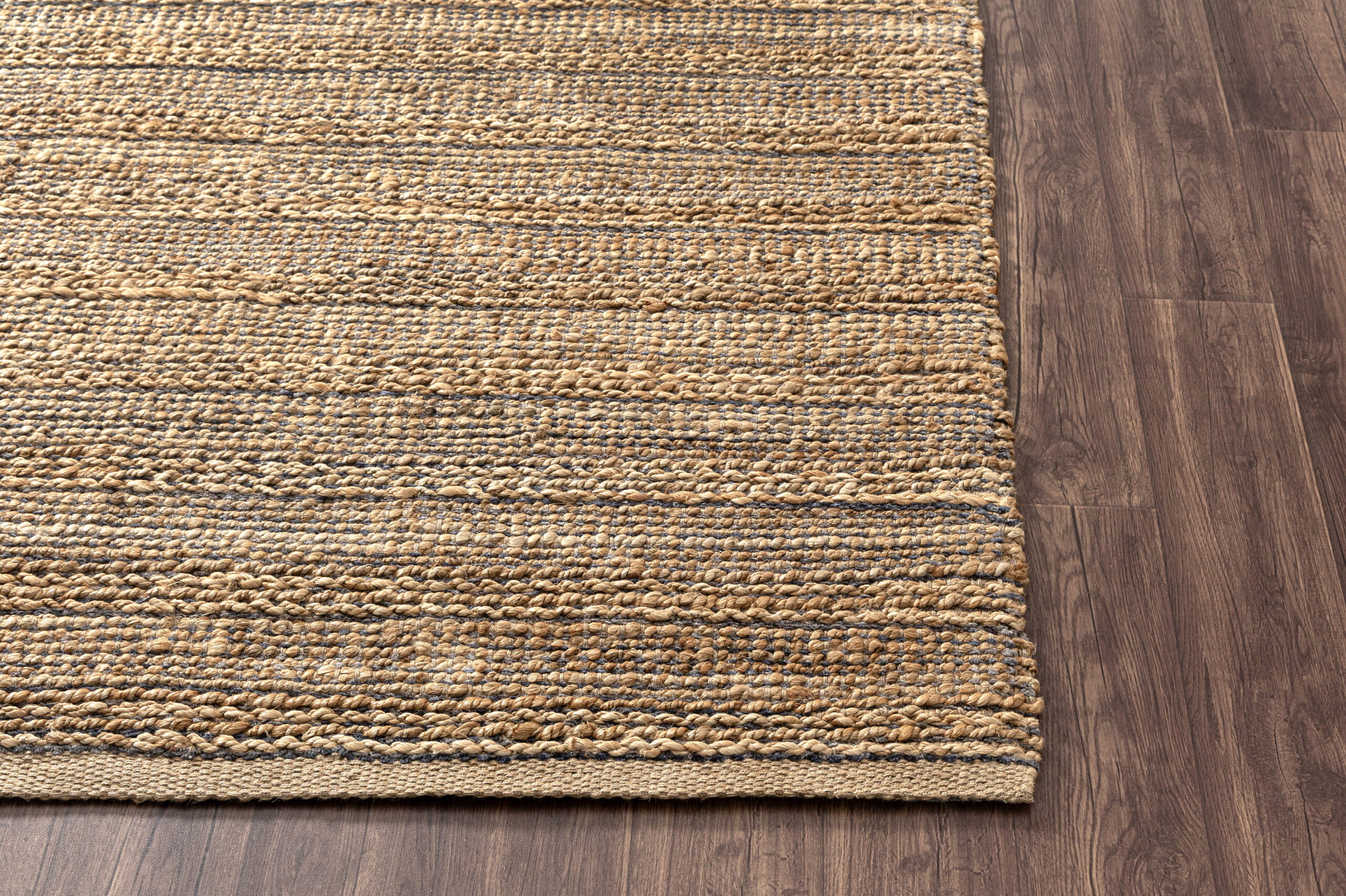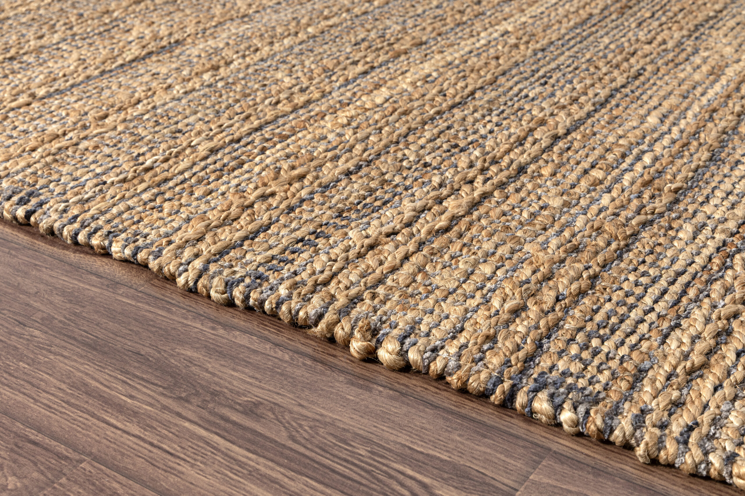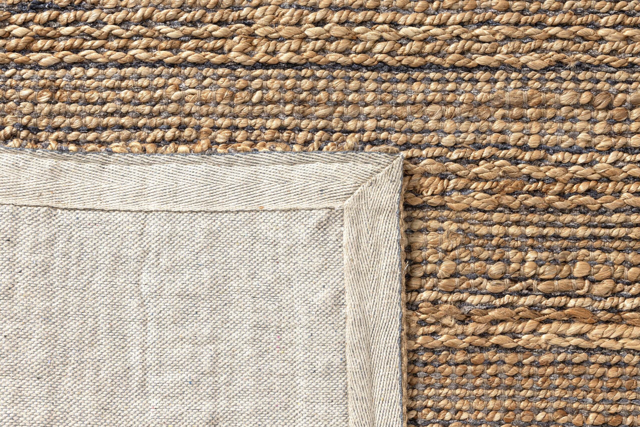 Bring natural texture and color into your home with this beautiful handmade jute area rug. This piece features intricately woven stripes of jute and soft chenille in shades of gray and black creating an eye-catching foundation for entryways, hallways, bedrooms, and bathrooms. Available in multiple color and size options to accomodate any space in your home, apartment, or dorm. Each rug is hand-woven using traditional techniques out of chenille and natural jute fibers with a cotton backing, which allow you to enjoy high-end design without sacrificing comfort or durability. The resilient materials and tightly woven construction ensure that this rug will maintain its shape and appearance for years to come.