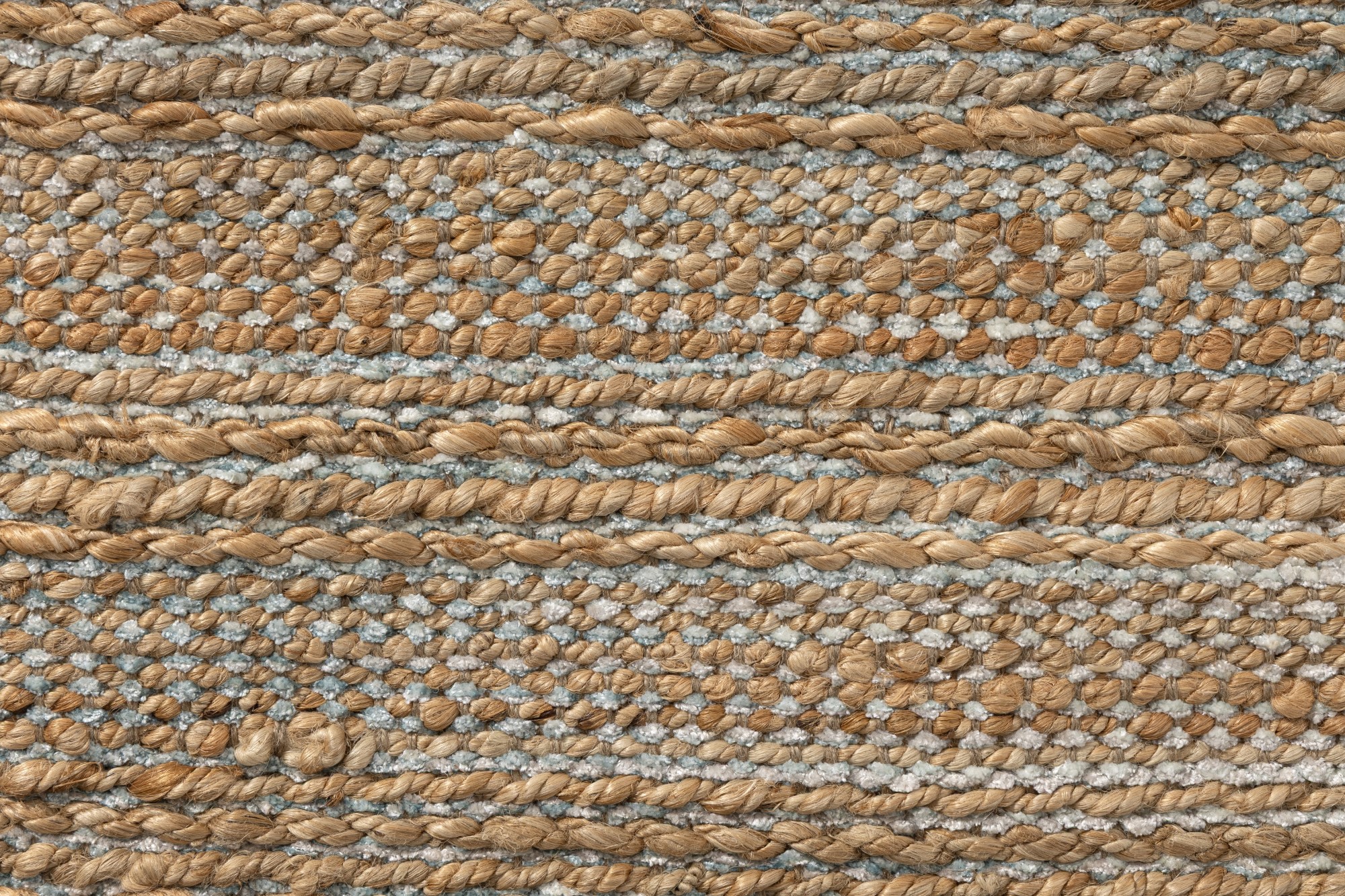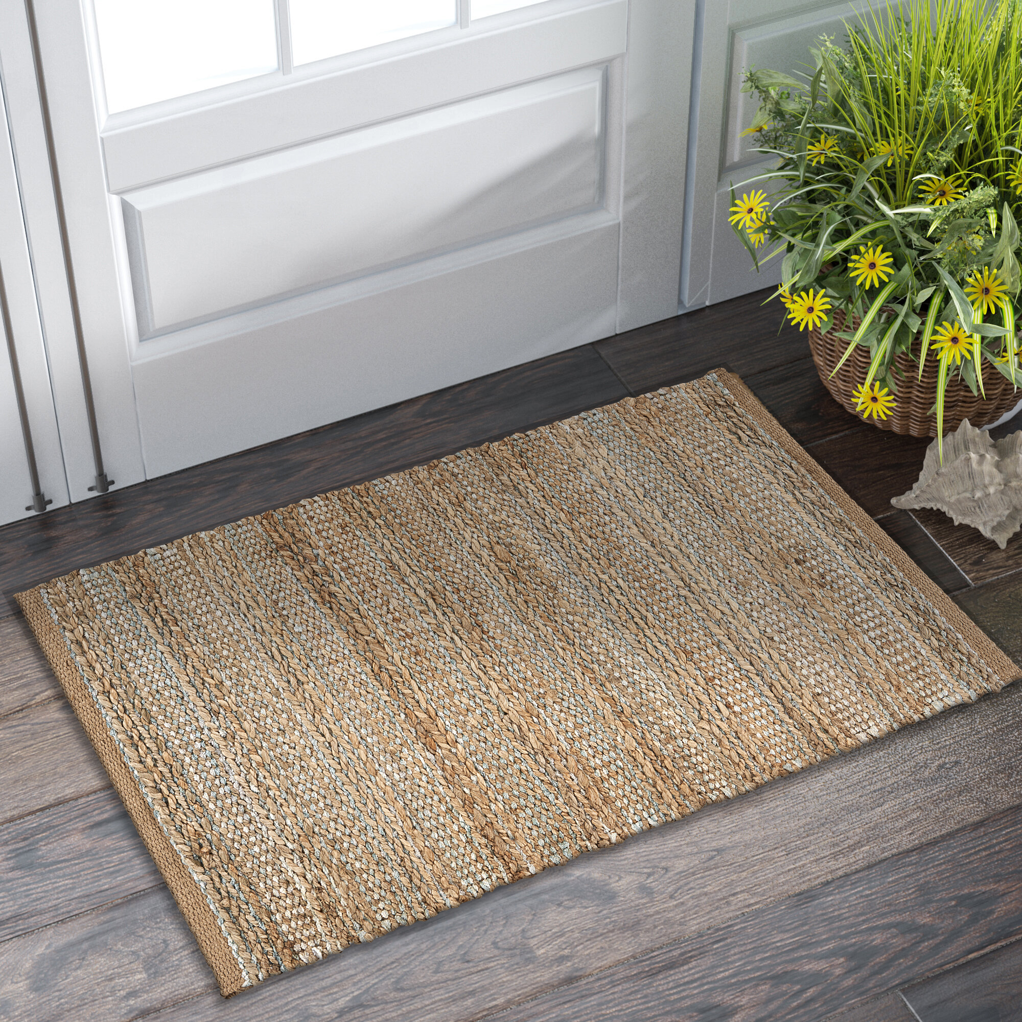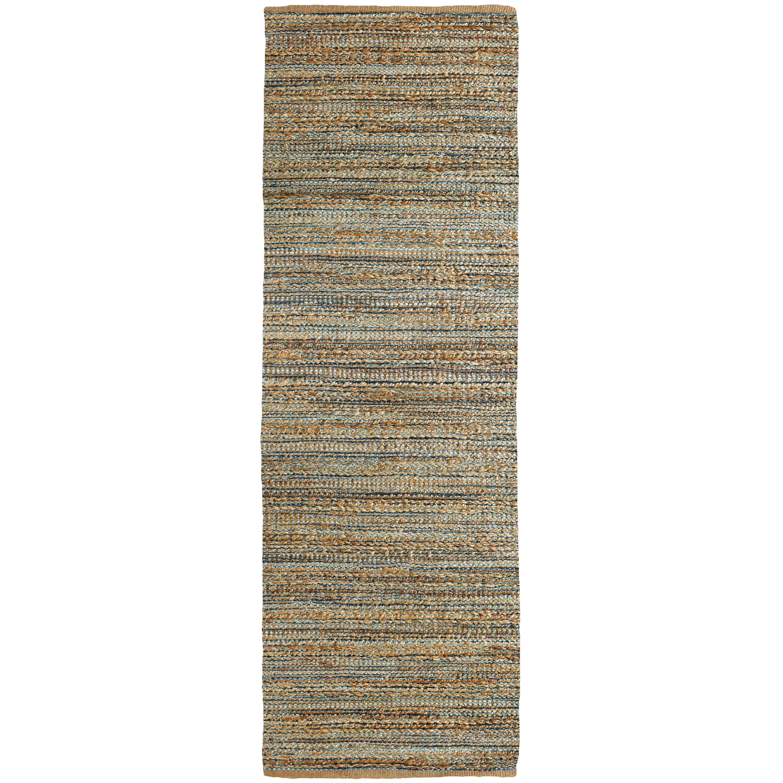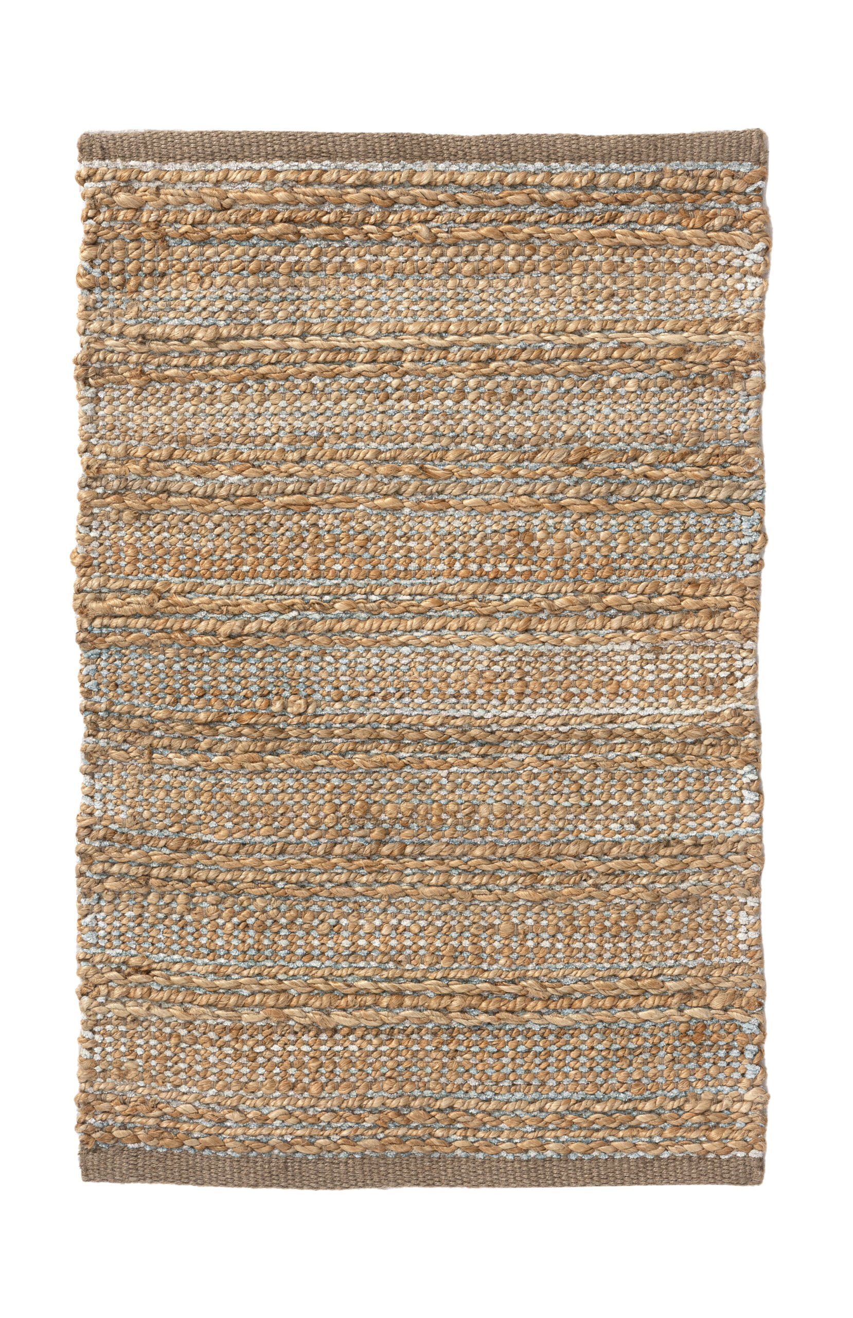 Bring natural texture and color into your home with this beautiful handmade jute area rug. This piece features intricately woven stripes of jute and soft chenille in shades of light blue creating an eye-catching foundation for entryways, hallways, bedrooms, and bathrooms. Available in multiple color and size options to accomodate any space in your home, apartment, or dorm. Each rug is hand-woven using traditional techniques out of chenille and natural jute fibers with a cotton backing, which allow you to enjoy high-end design without sacrificing comfort or durability. The resilient materials and tightly woven construction ensure that this rug will maintain its shape and appearance for years to come.