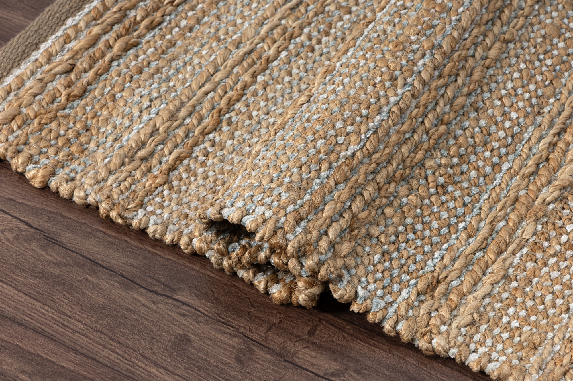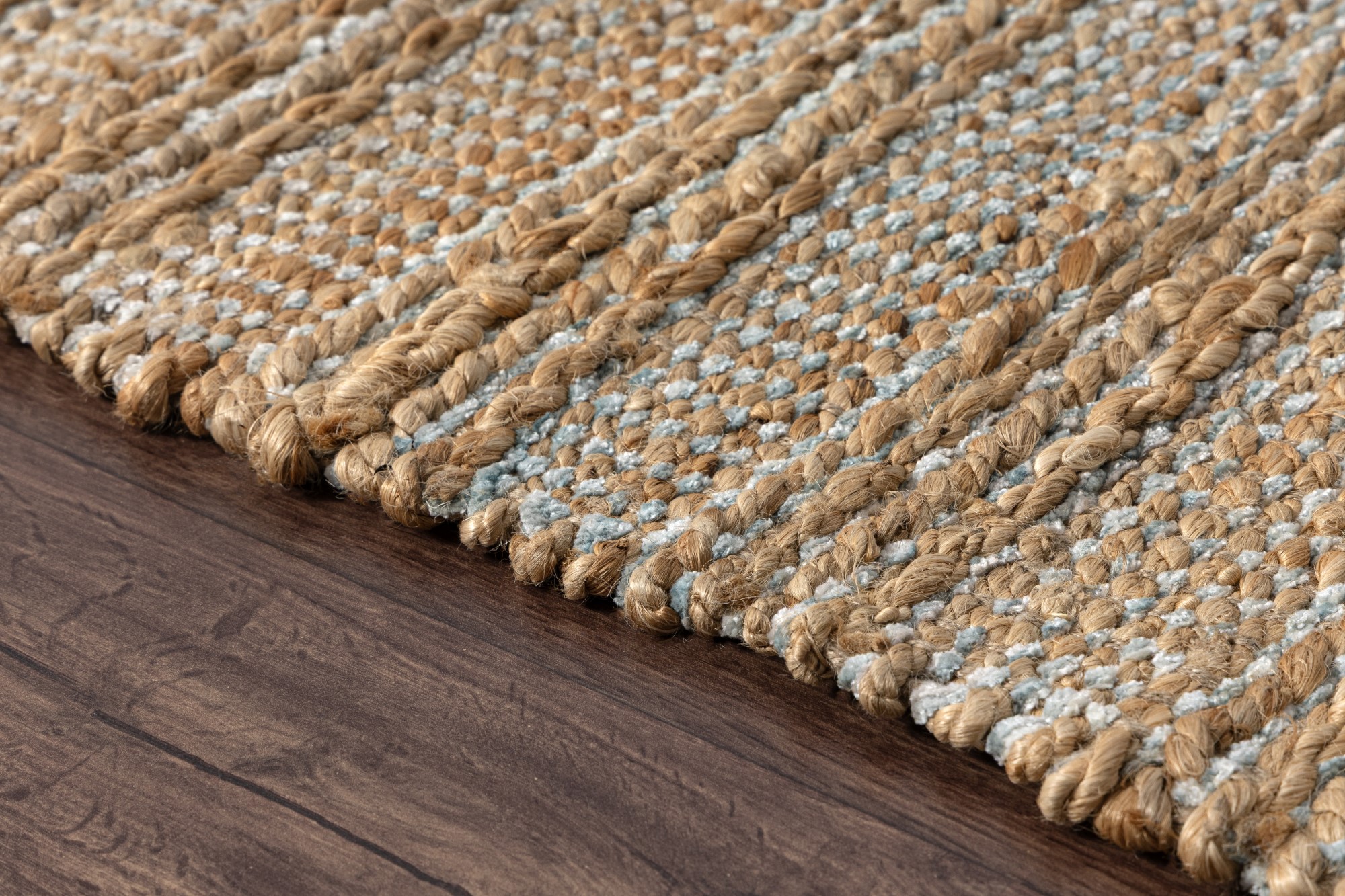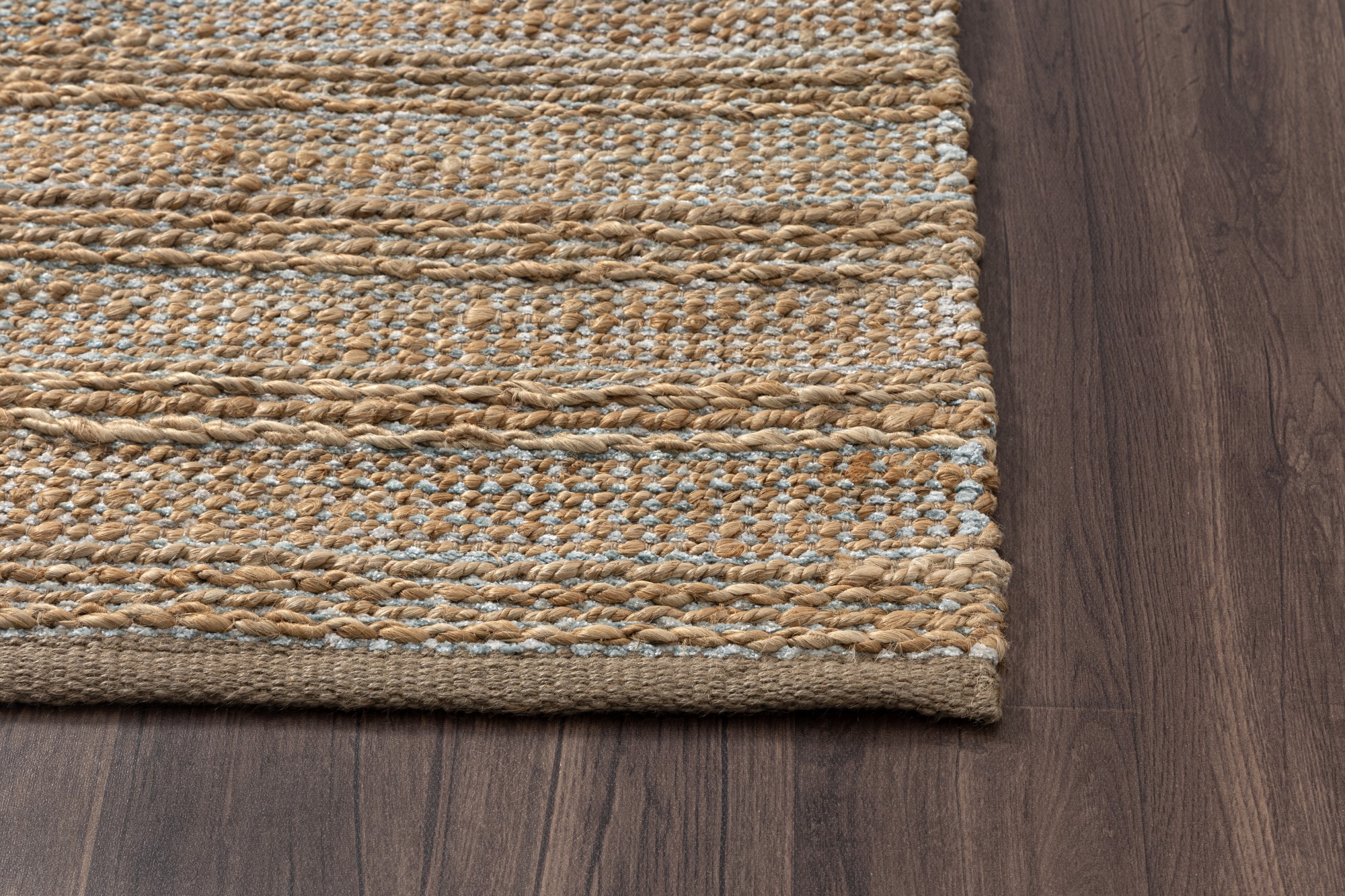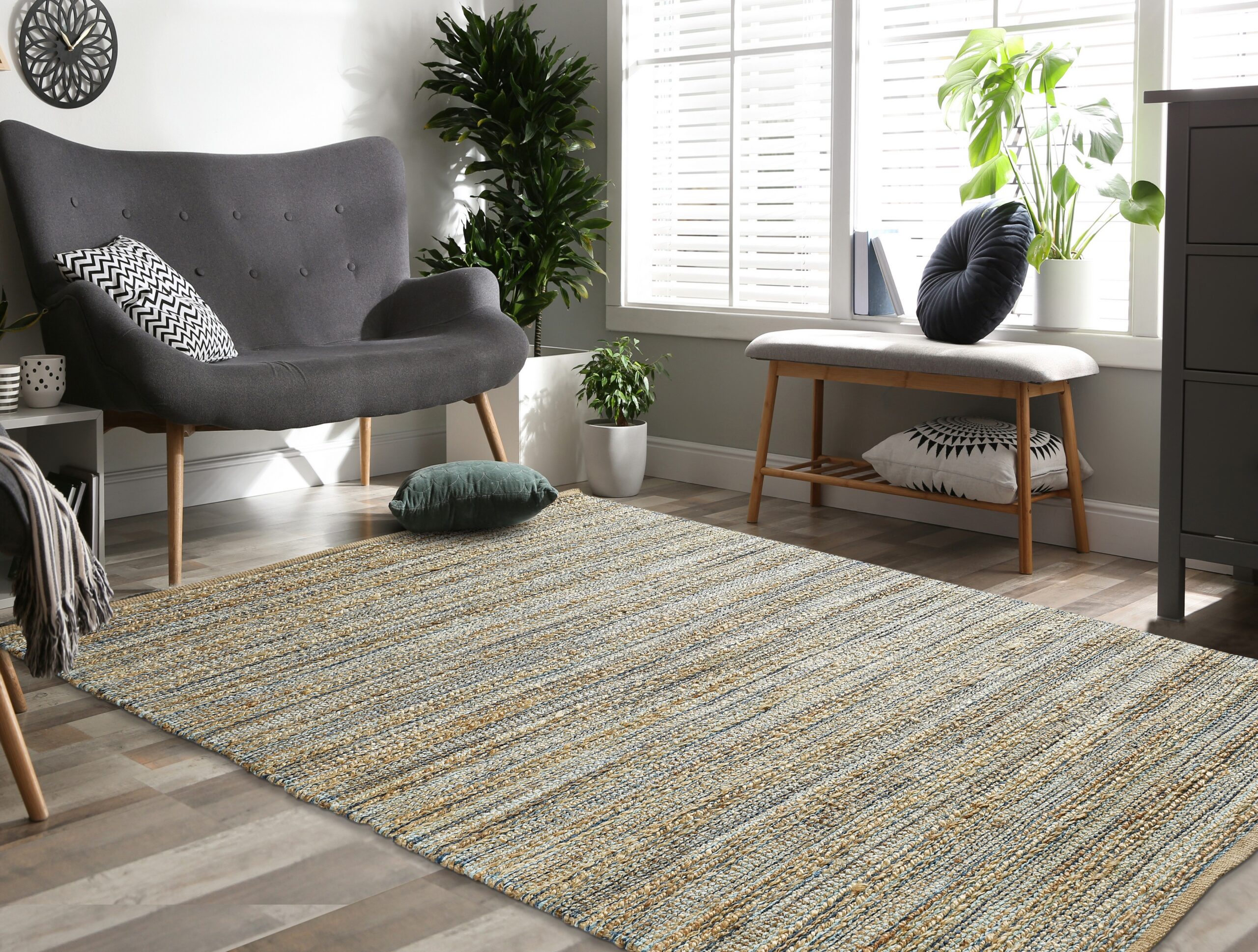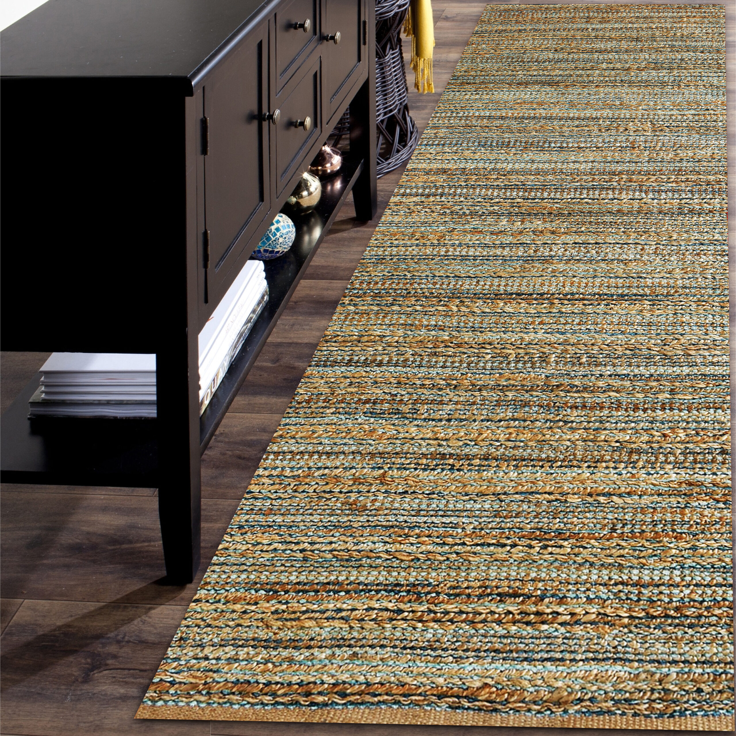 Bring natural texture and color into your home with this beautiful handmade jute area rug. This piece features intricately woven stripes of jute and soft chenille in shades of light blue creating an eye-catching foundation for entryways, hallways, bedrooms, and bathrooms. Available in multiple color and size options to accomodate any space in your home, apartment, or dorm. Each rug is hand-woven using traditional techniques out of chenille and natural jute fibers with a cotton backing, which allow you to enjoy high-end design without sacrificing comfort or durability. The resilient materials and tightly woven construction ensure that this rug will maintain its shape and appearance for years to come.