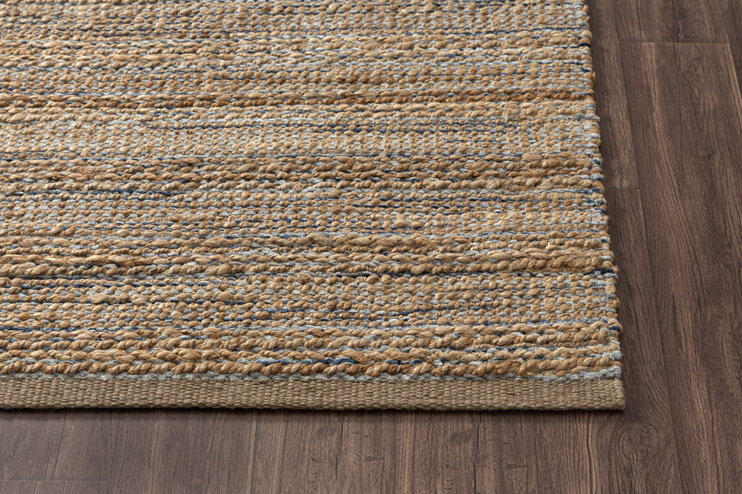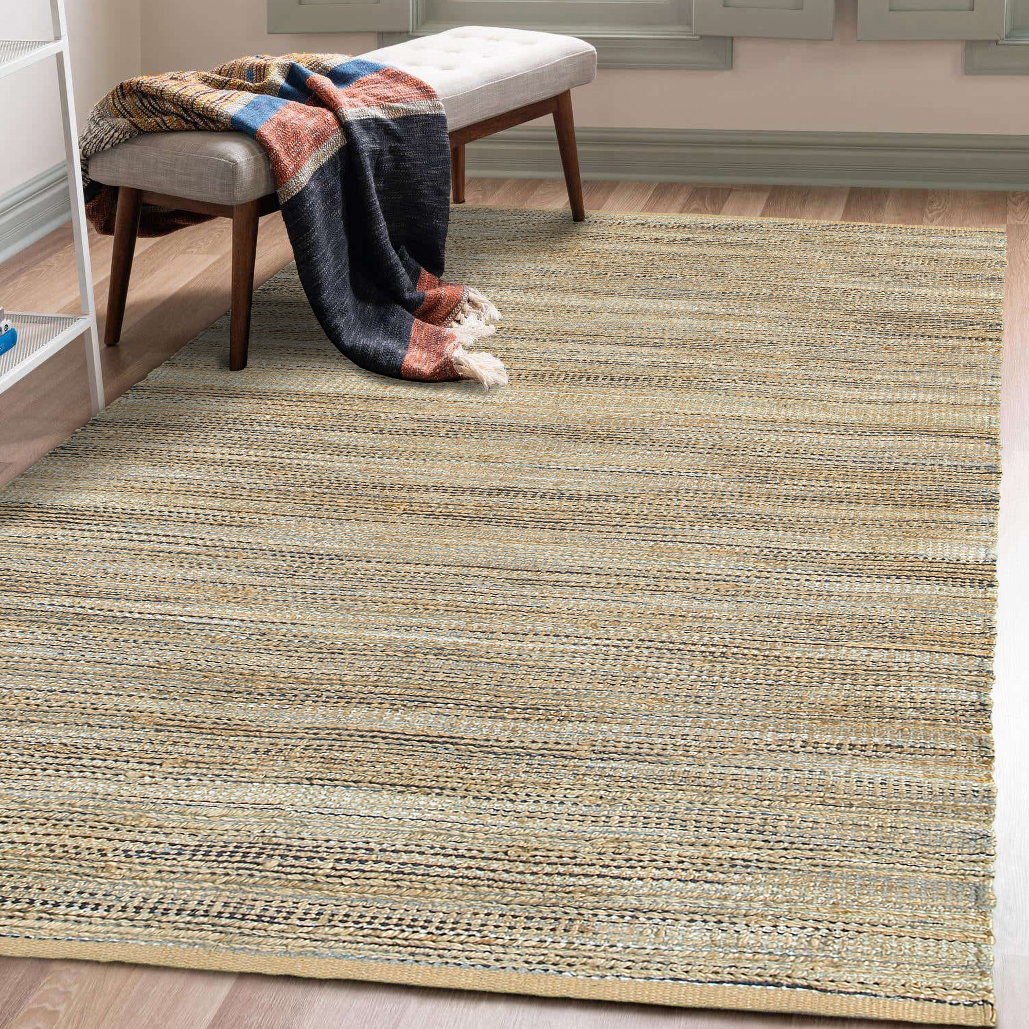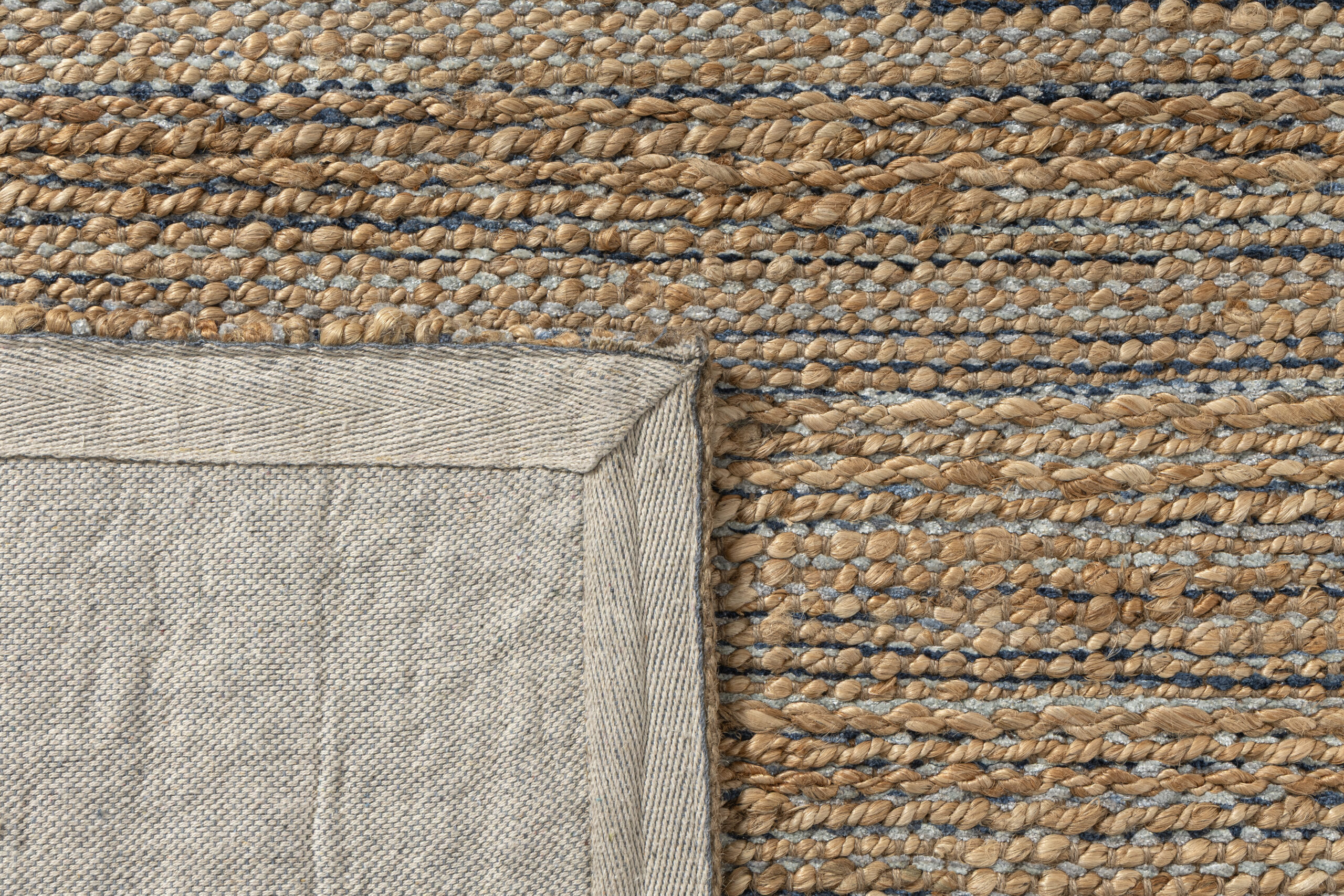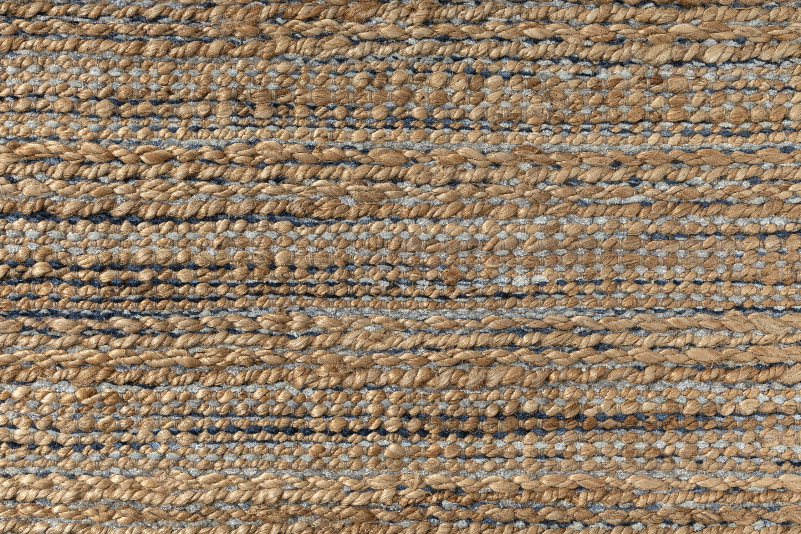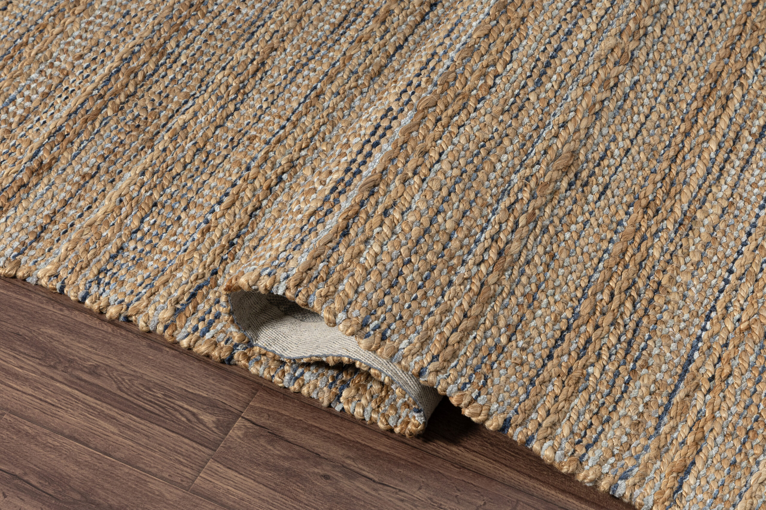Bring natural texture and color into your home with this beautiful handmade jute area rug. This piece features intricately woven stripes of jute and soft chenille in shades of blue and gray creating an eye-catching foundation for entryways, hallways, bedrooms, and bathrooms. Available in multiple color and size options to accomodate any space in your home, apartment, or dorm. Each rug is hand-woven using traditional techniques out of chenille and natural jute fibers with a cotton backing, which allow you to enjoy high-end design without sacrificing comfort or durability. The resilient materials and tightly woven construction ensure that this rug will maintain its shape and appearance for years to come.