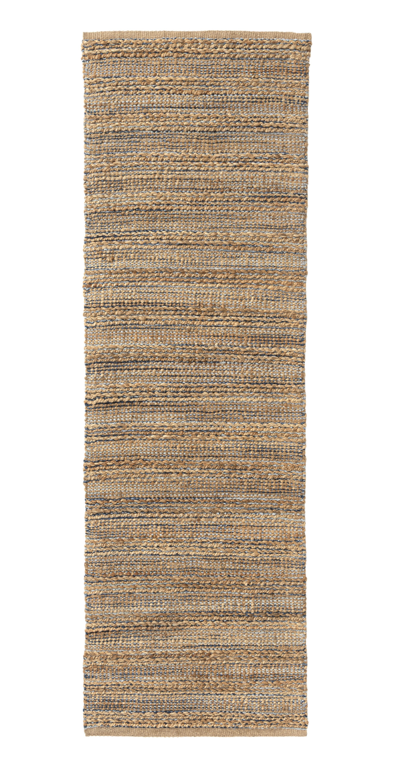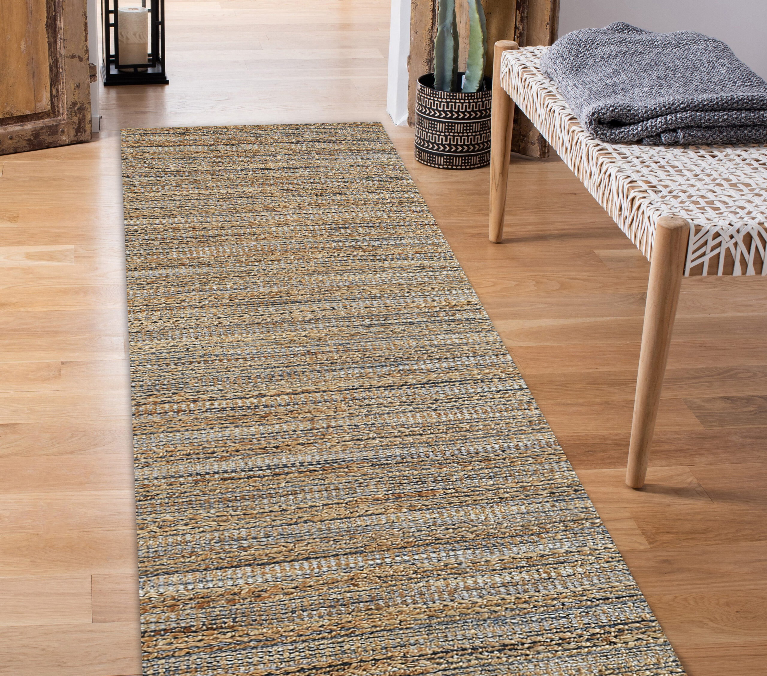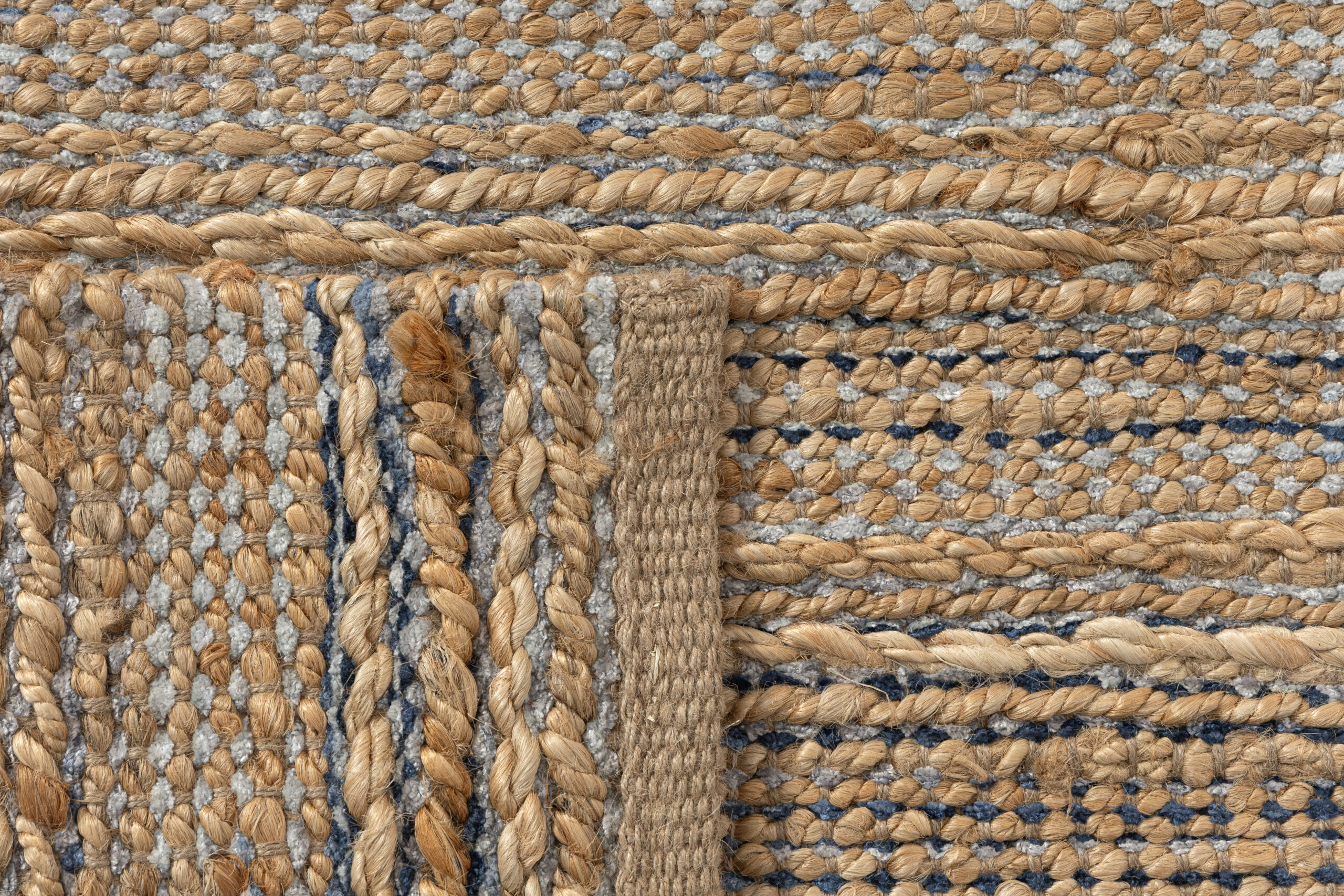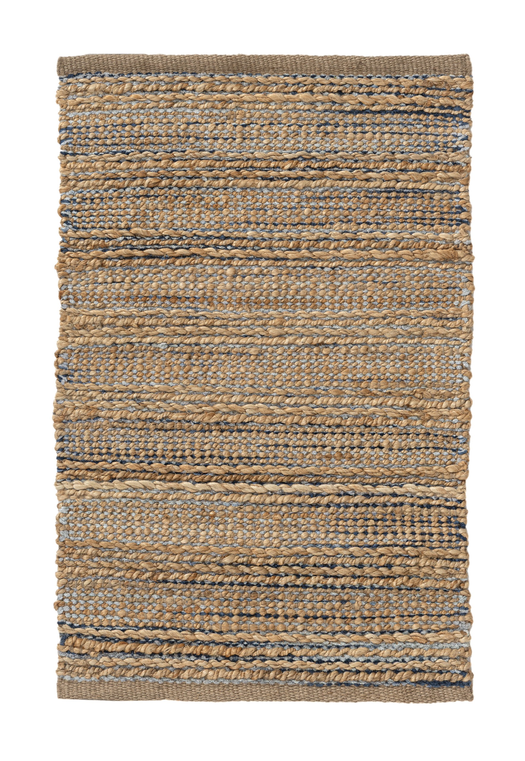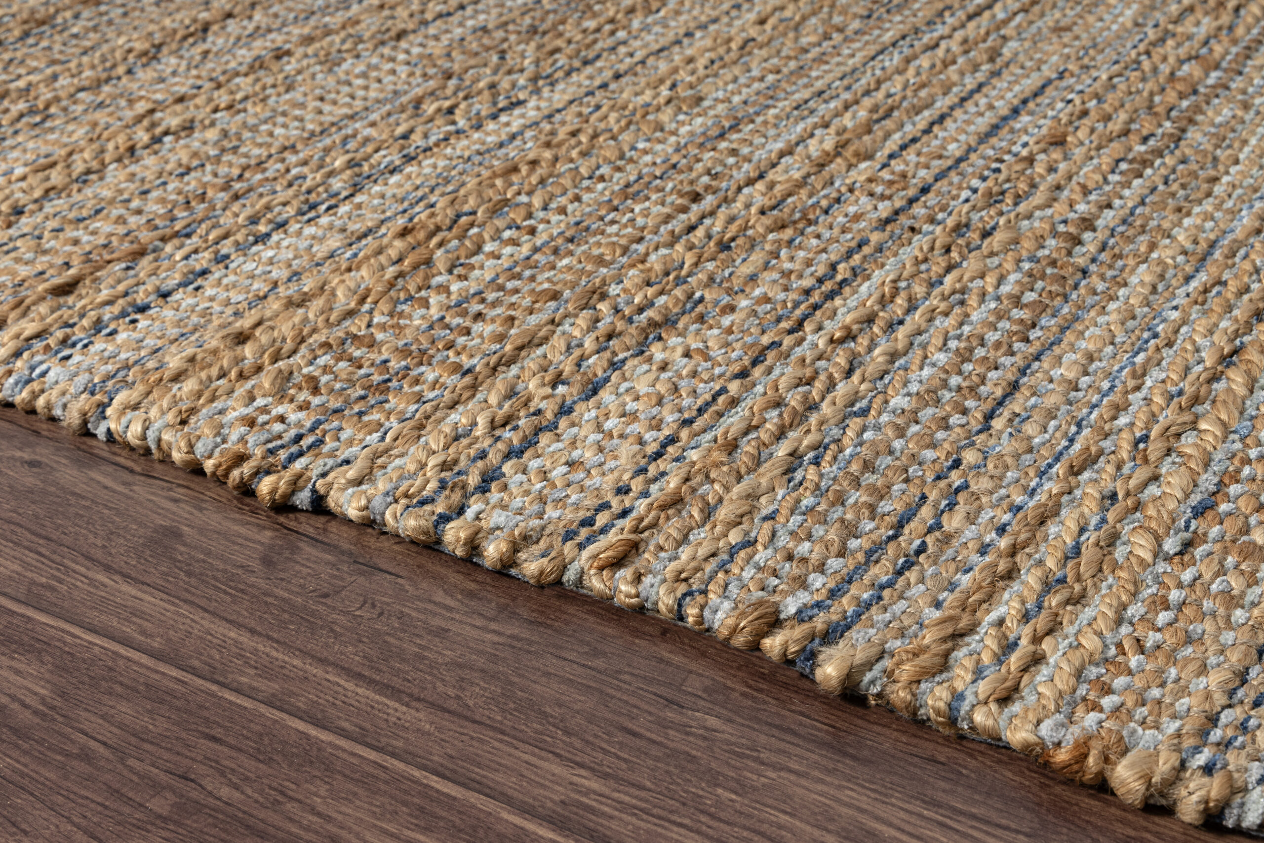 Bring natural texture and color into your home with this beautiful handmade jute area rug. This piece features intricately woven stripes of jute and soft chenille in shades of blue and gray creating an eye-catching foundation for entryways, hallways, bedrooms, and bathrooms. Available in multiple color and size options to accomodate any space in your home, apartment, or dorm. Each rug is hand-woven using traditional techniques out of chenille and natural jute fibers with a cotton backing, which allow you to enjoy high-end design without sacrificing comfort or durability. The resilient materials and tightly woven construction ensure that this rug will maintain its shape and appearance for years to come.