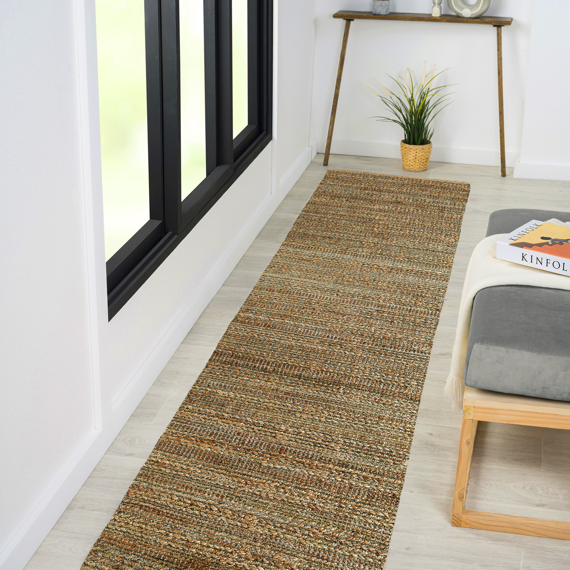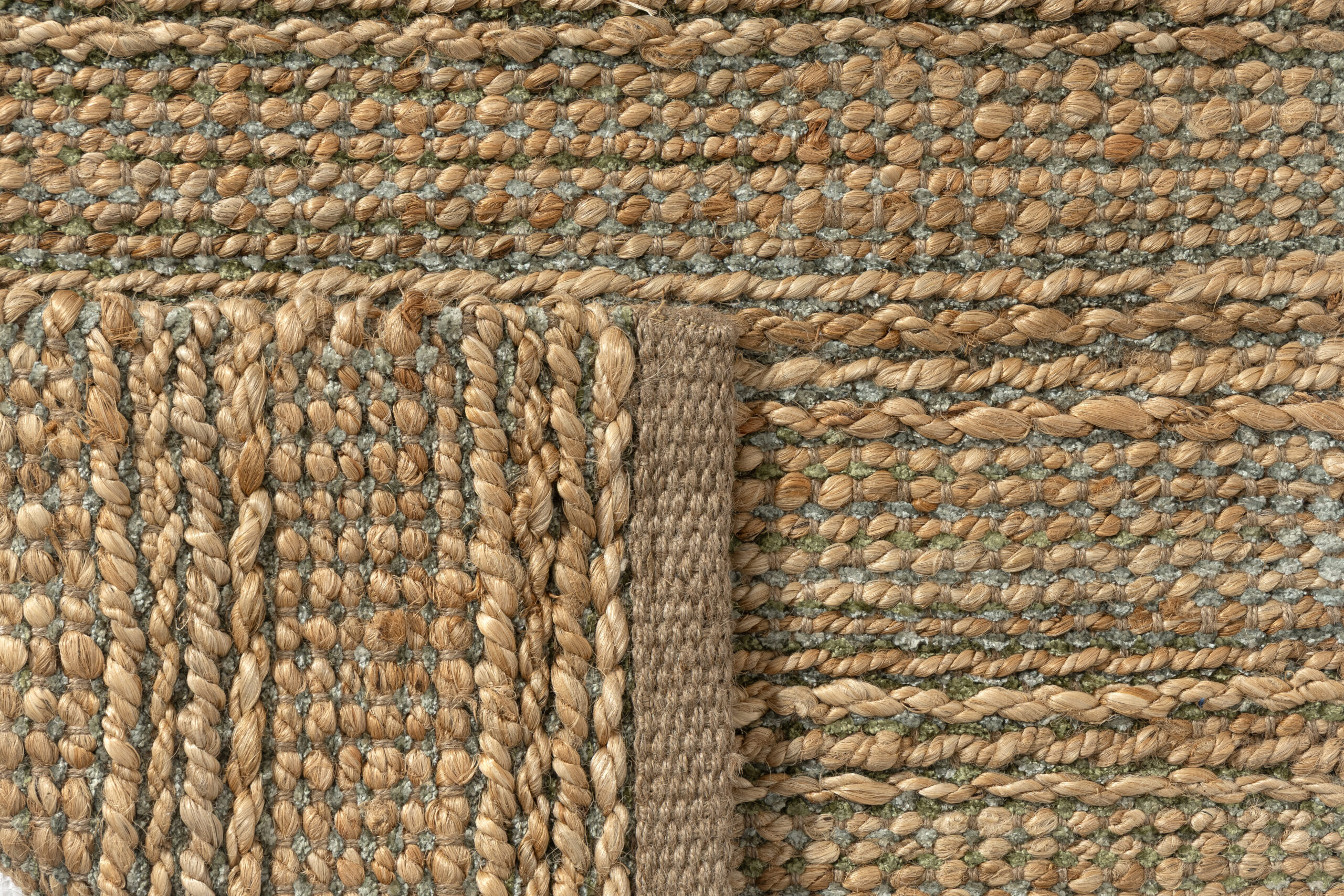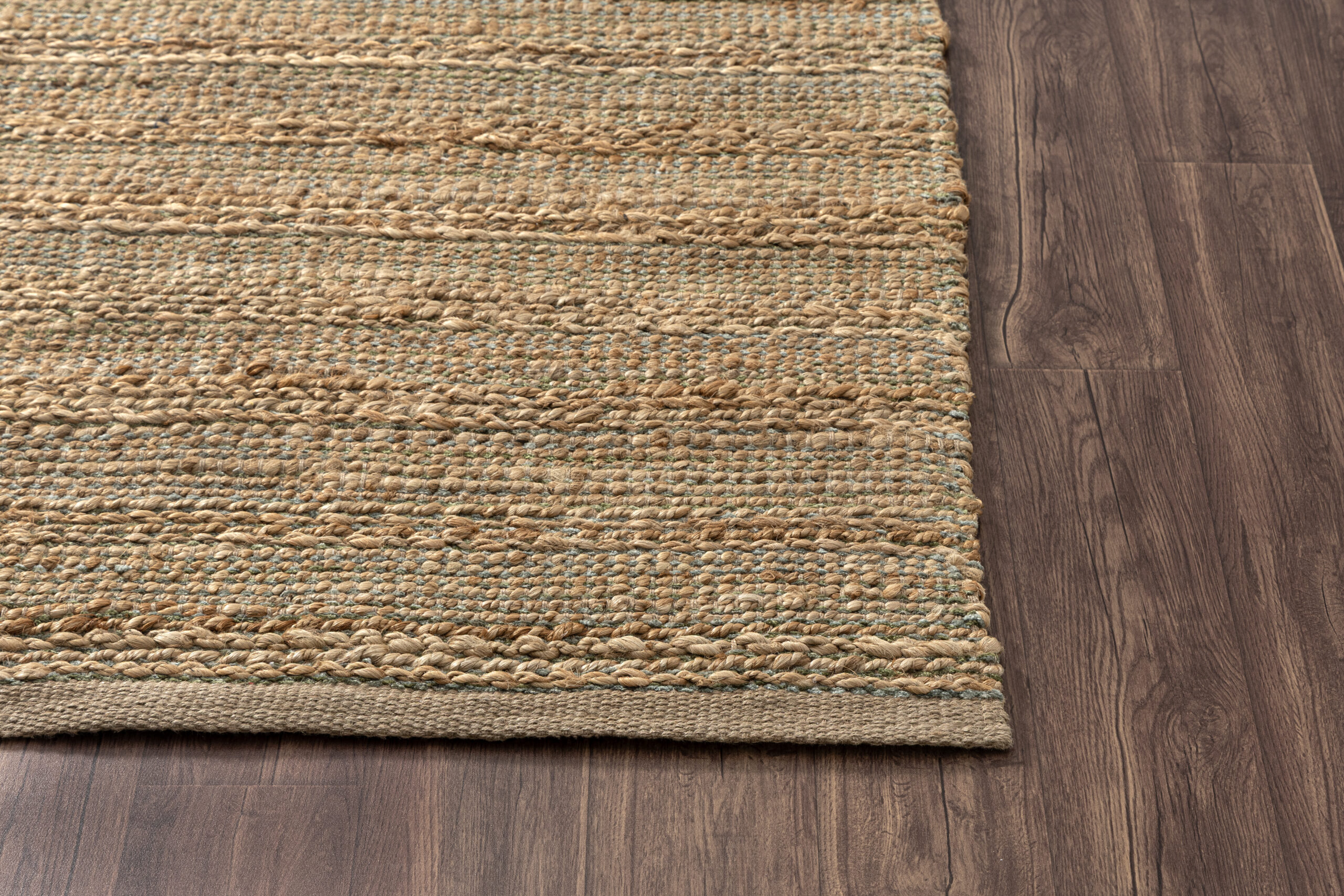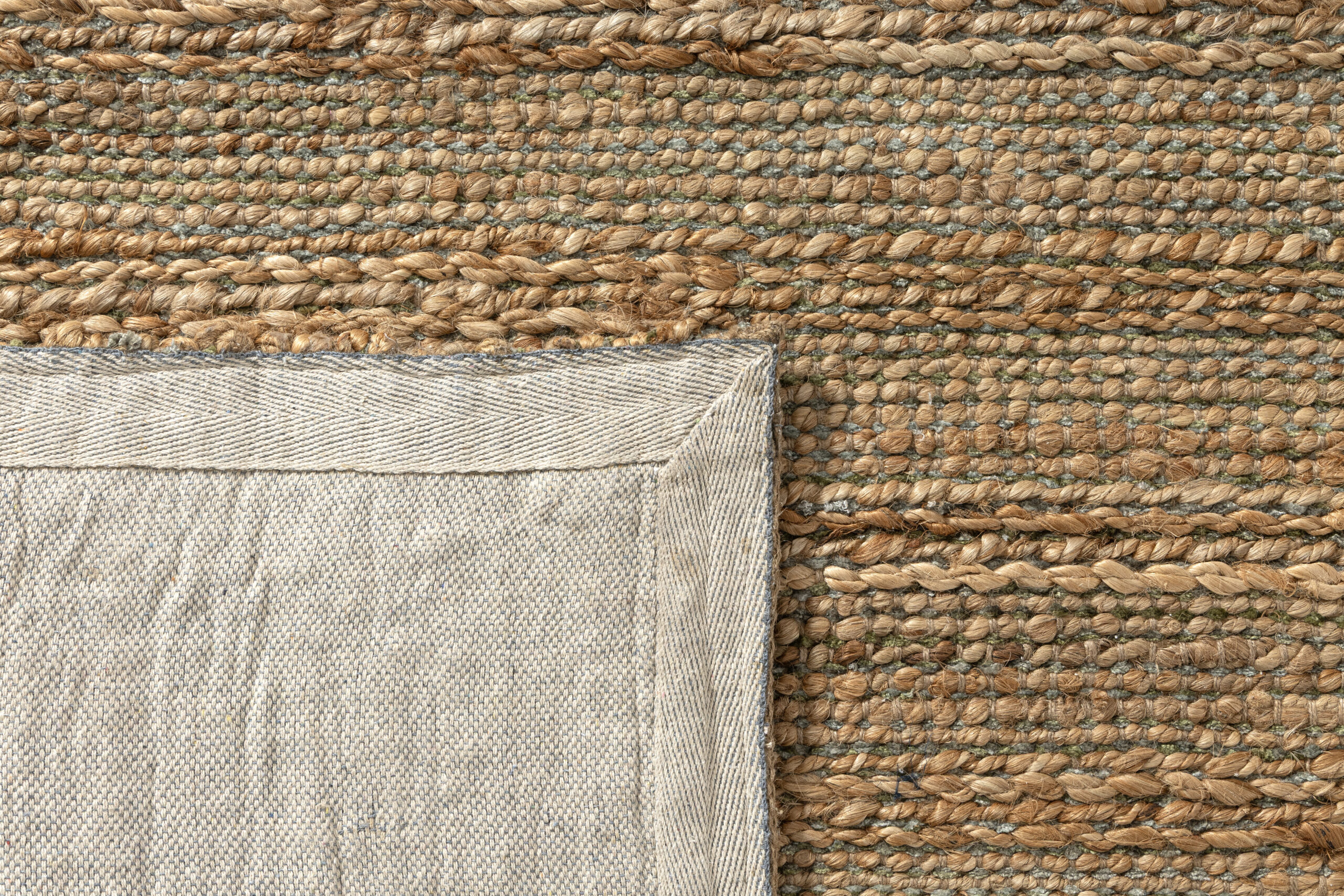 Bring natural texture and color into your home with this beautiful handmade jute area rug. This piece features intricately woven stripes of jute and soft chenille in shades of green, gray, and blue creating an eye-catching foundation for entryways, hallways, bedrooms, and bathrooms. Available in multiple color and size options to accomodate any space in your home, apartment, or dorm. Each rug is hand-woven using traditional techniques out of chenille and natural jute fibers with a cotton backing, which allow you to enjoy high-end design without sacrificing comfort or durability. The resilient materials and tightly woven construction ensure that this rug will maintain its shape and appearance for years to come.