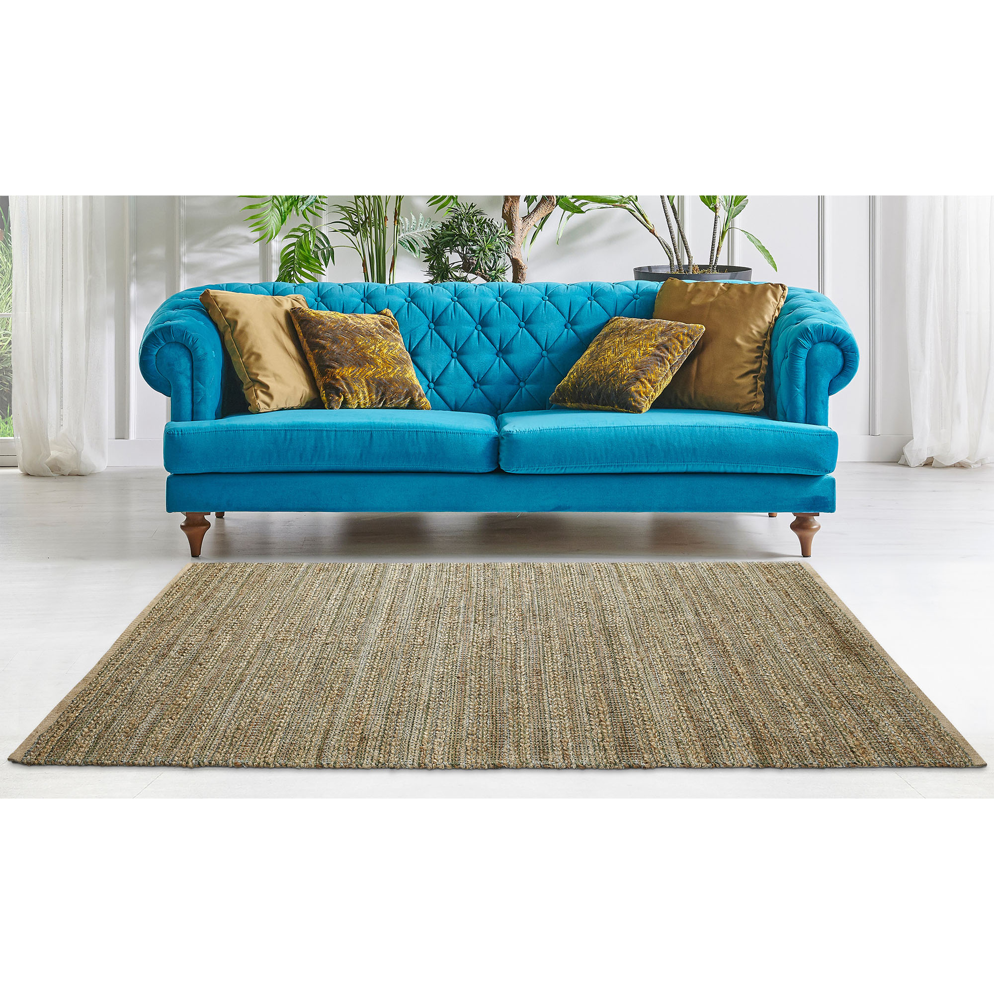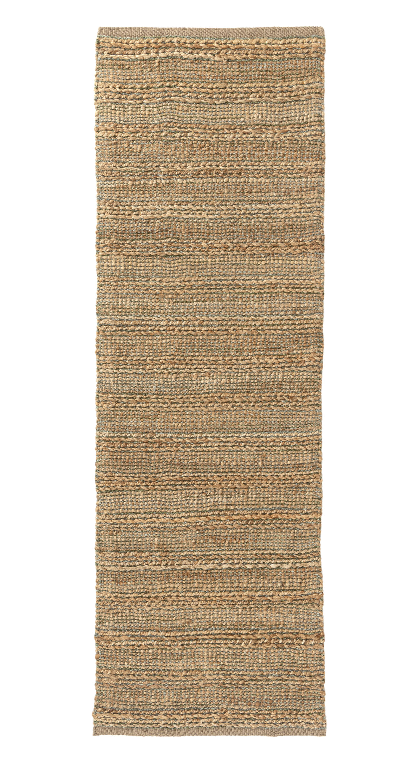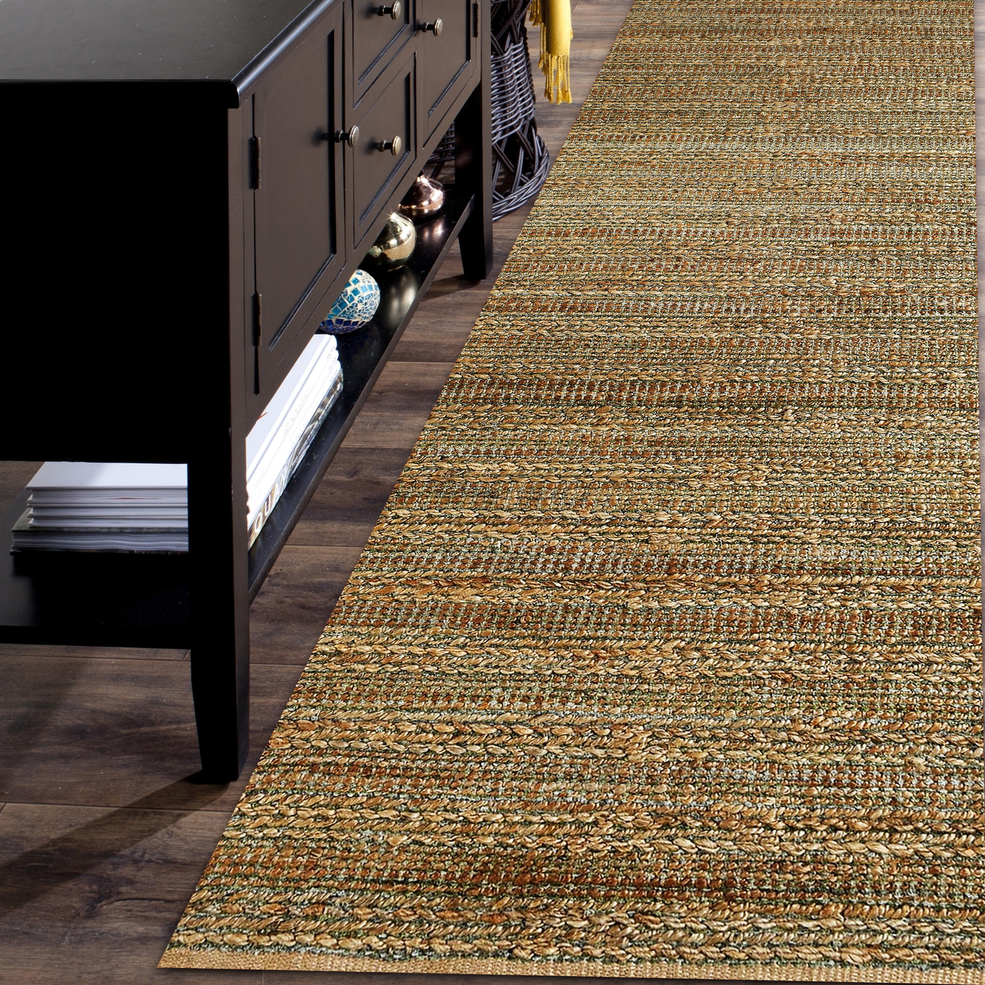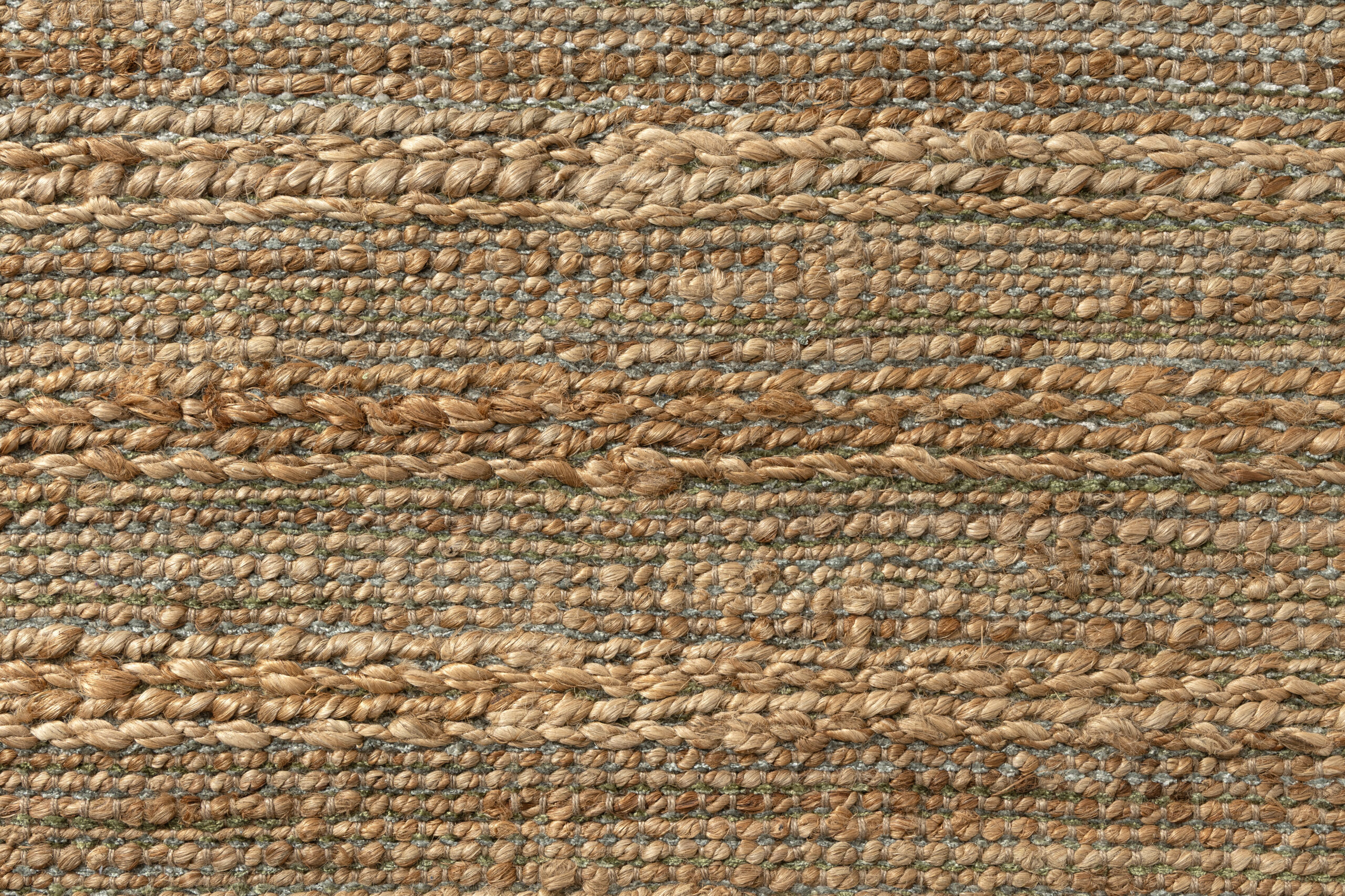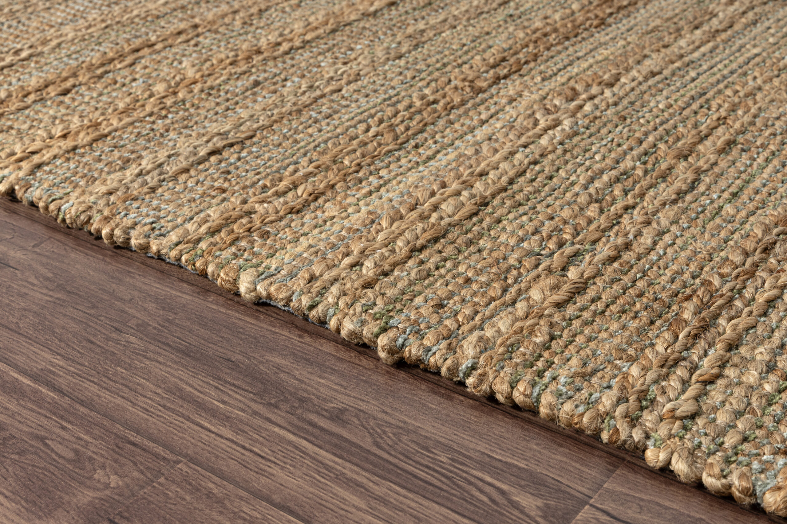 Bring natural texture and color into your home with this beautiful handmade jute area rug. This piece features intricately woven stripes of jute and soft chenille in shades of green, gray, and blue creating an eye-catching foundation for entryways, hallways, bedrooms, and bathrooms. Available in multiple color and size options to accomodate any space in your home, apartment, or dorm. Each rug is hand-woven using traditional techniques out of chenille and natural jute fibers with a cotton backing, which allow you to enjoy high-end design without sacrificing comfort or durability. The resilient materials and tightly woven construction ensure that this rug will maintain its shape and appearance for years to come.