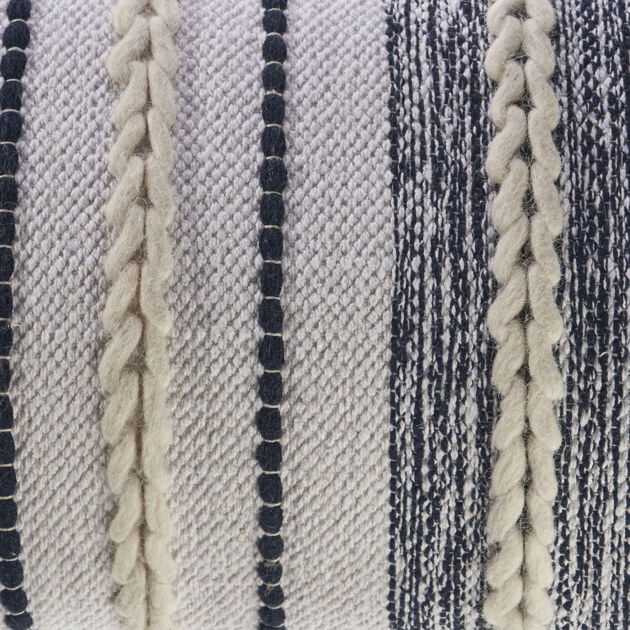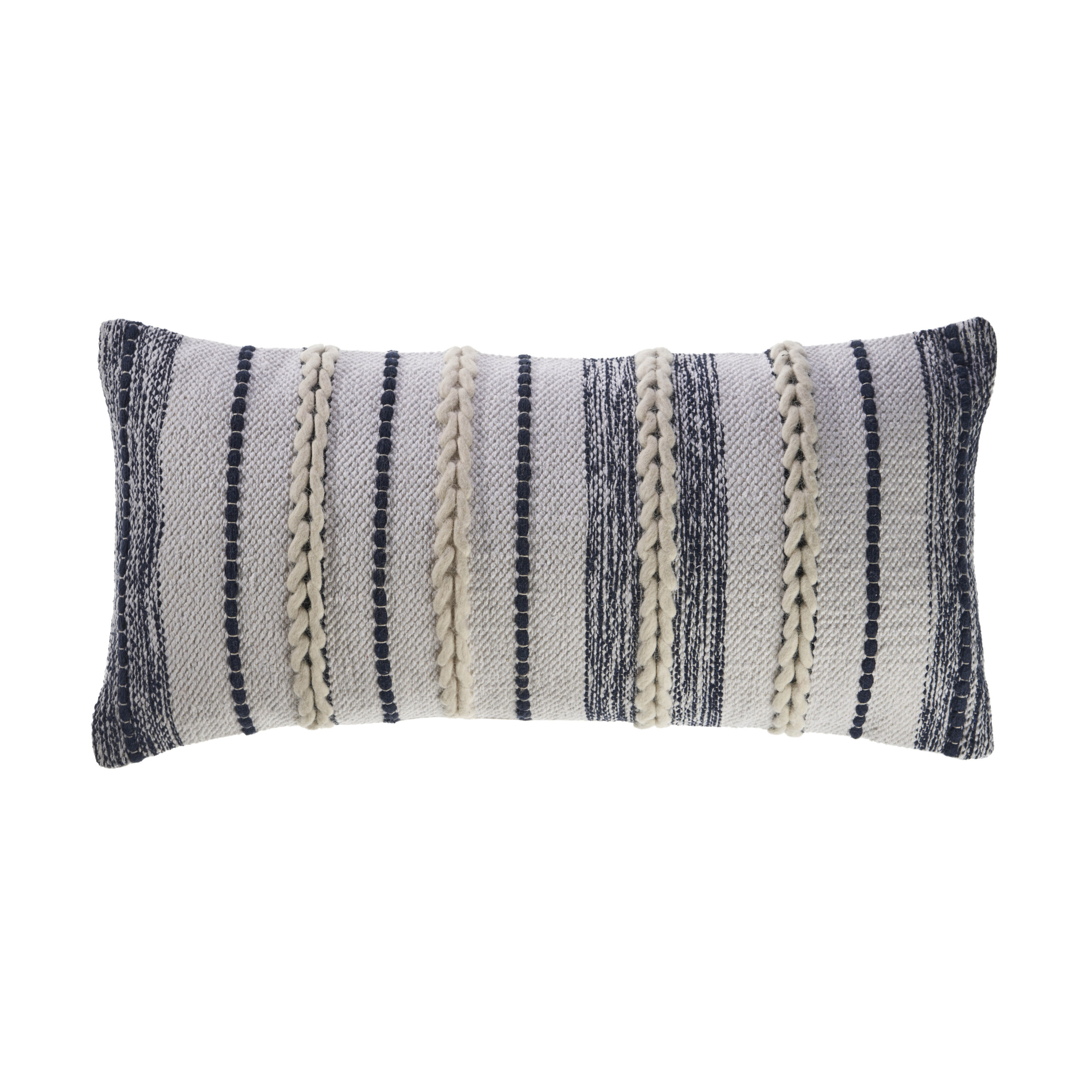 Designed to enhance any room, this pillow cover features intricate stripe patterns and eye-catching details. Soft cream braids blend beautifully with navy woven accents, complementing a variety of decor styles. Gentle to the touch, it can be placed on a bed, couch, or chair to elevate your space. Handcrafted for comfort and style, this pillow cover combines functionality with timeless design.