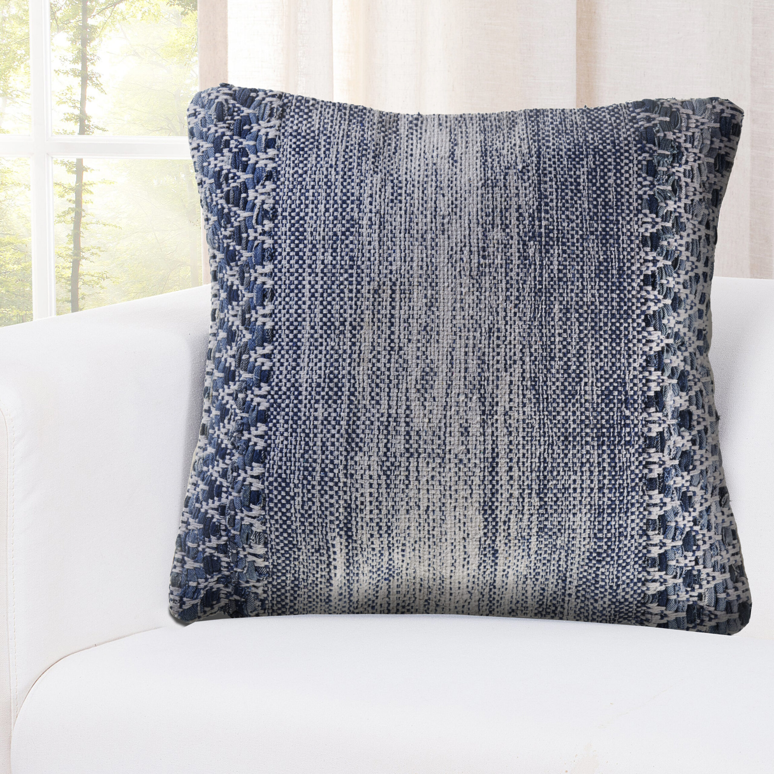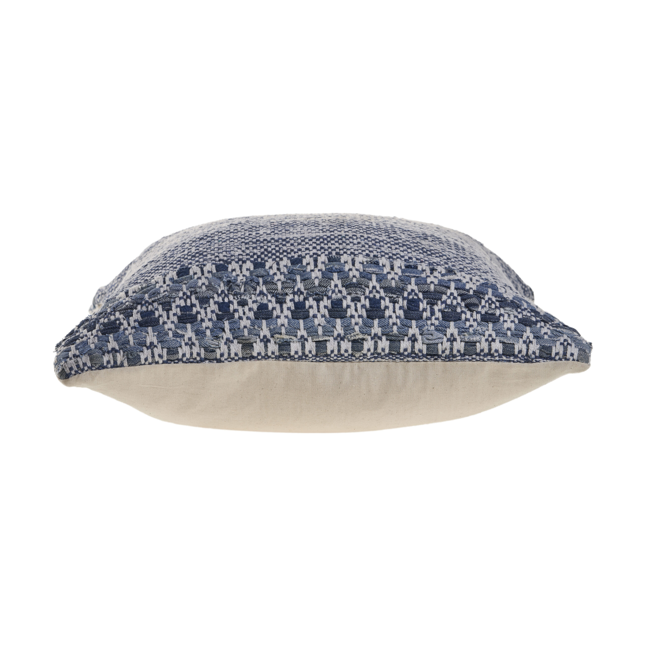 Designed to thrill, our pillow cover will add intricate mastery and eye pleasing designs to any room. Combine wonderful distressed designs with detailed, geometric texturing to make an eye-catching centerpiece for your pillow cover. With soft blues to deep blues and ivory, this piece can be placed within a variety of different style environments. Hand-made with the customer in mind, there is no compromise of comfort and style with this easy to use pillow cover.