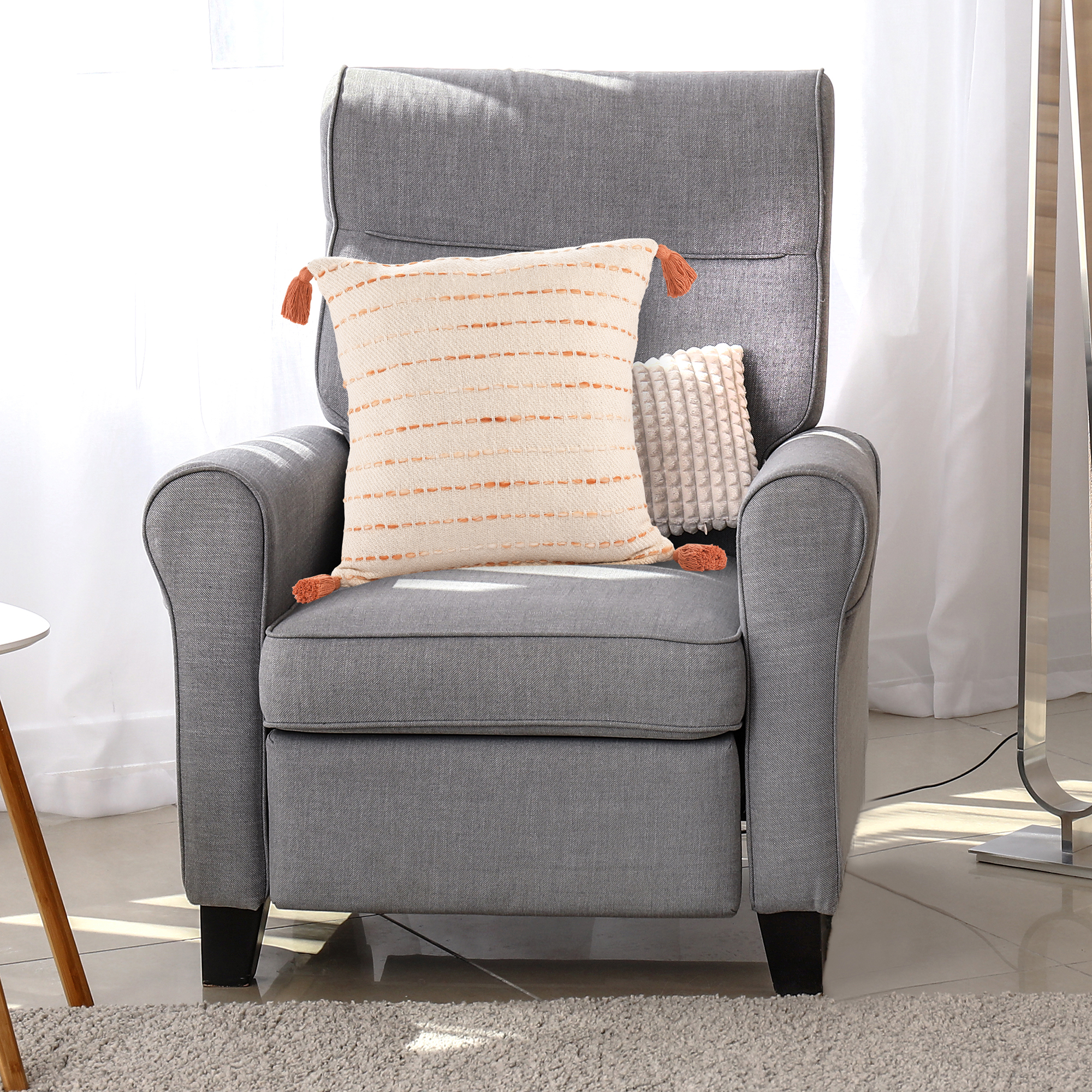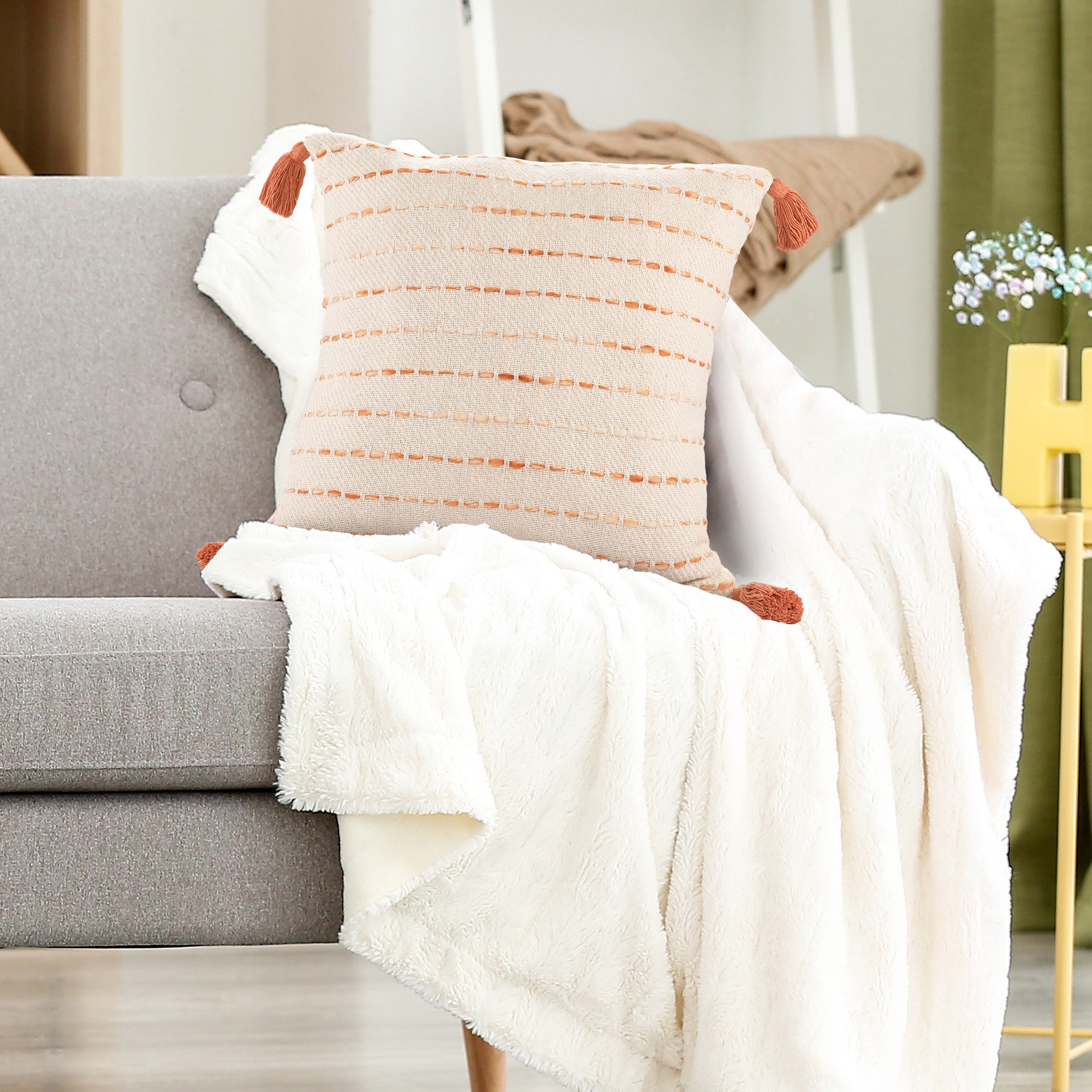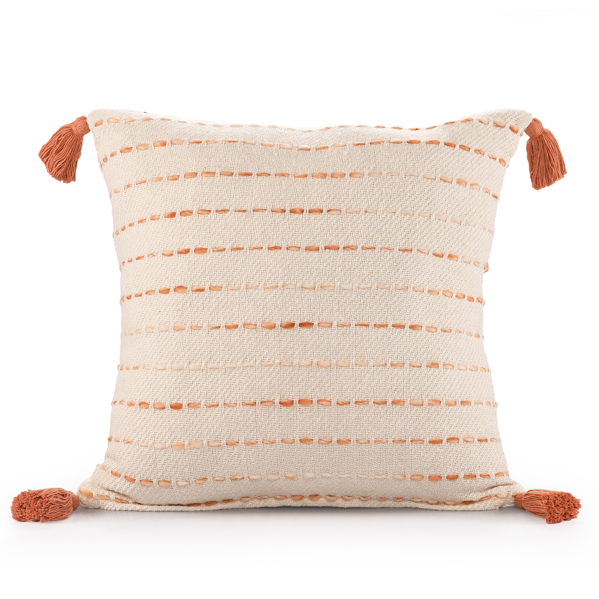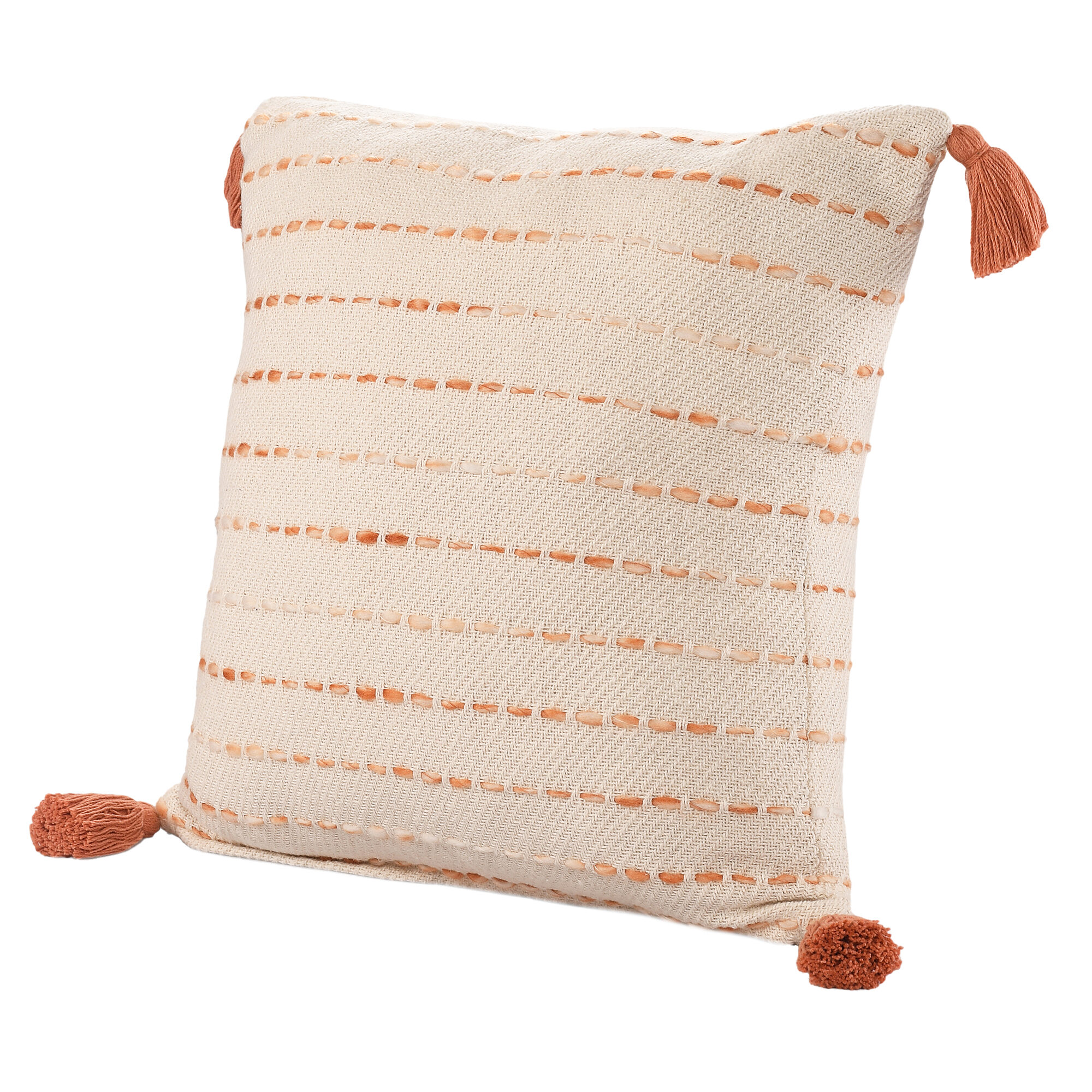 Delicately soft, this handmade decorative throw pillow will be a tasteful addition to any space. Woven of a luxurious cotton blend, this piece features a variegated stripe of color whipstitched on an ivory background complimented by corner tassels. Available in a variety of colors and coordinating throw blankets, this collection is sure to become a favorite for years to come.