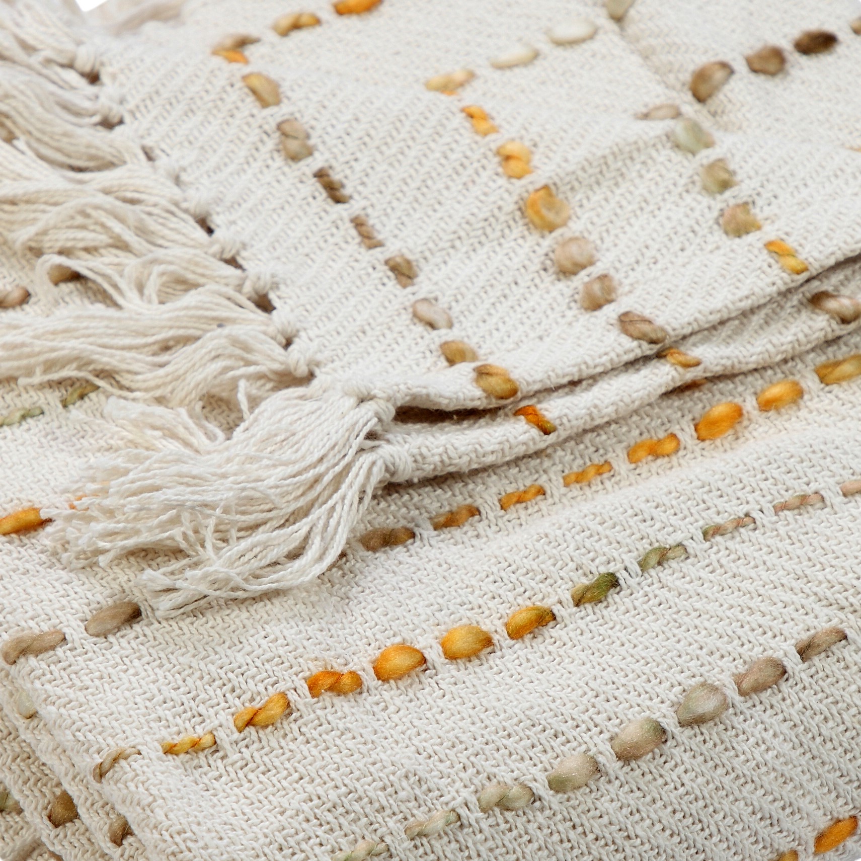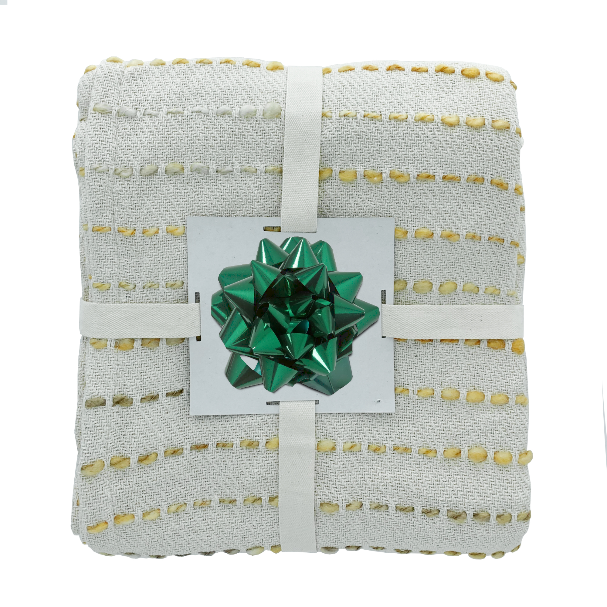 Add a cozy and stylish touch to your home with this handwoven throw blanket. Made in India using a blend of 90% cotton and 10% polyester, this blanket is both soft and durable. The embroidered striped design and fringe accents add a touch of elegance and texture to the piece. Whether you use it as a decorative accent or to snuggle up with on a chilly evening, this throw blanket is sure to become a favorite in your home.