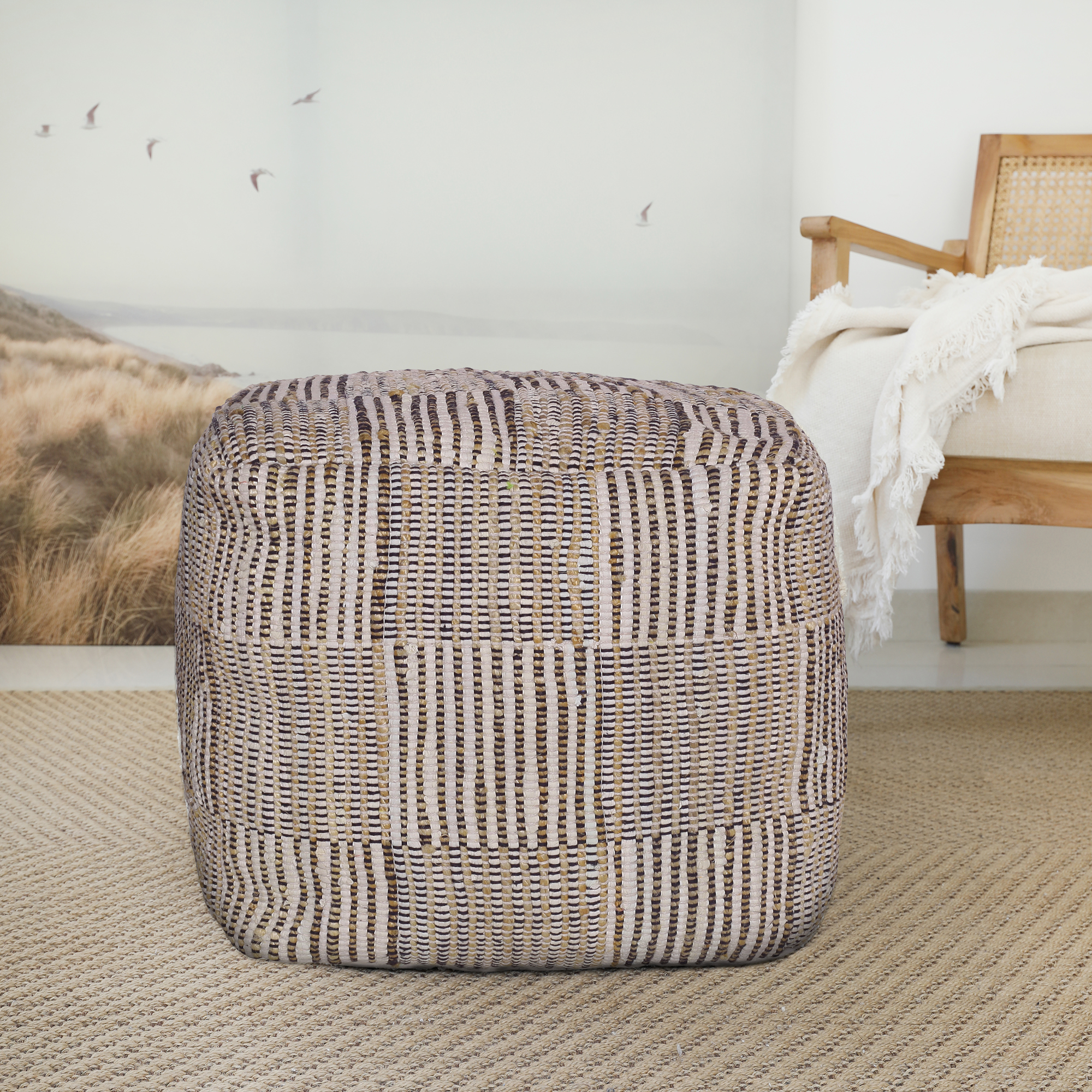 Add style and function to your abode with this practical indoor pouf. Handmade in India, it is crafted using 70% cotton and 30% jute materials, creating a piece that is both soft and durable. Filled with EPS balls, the pouf provides excellent support and comfort, making it perfect for use as a seat or a footrest. The striped and geometric patterns add visual interest, making it a standout addition to any space it occupies.