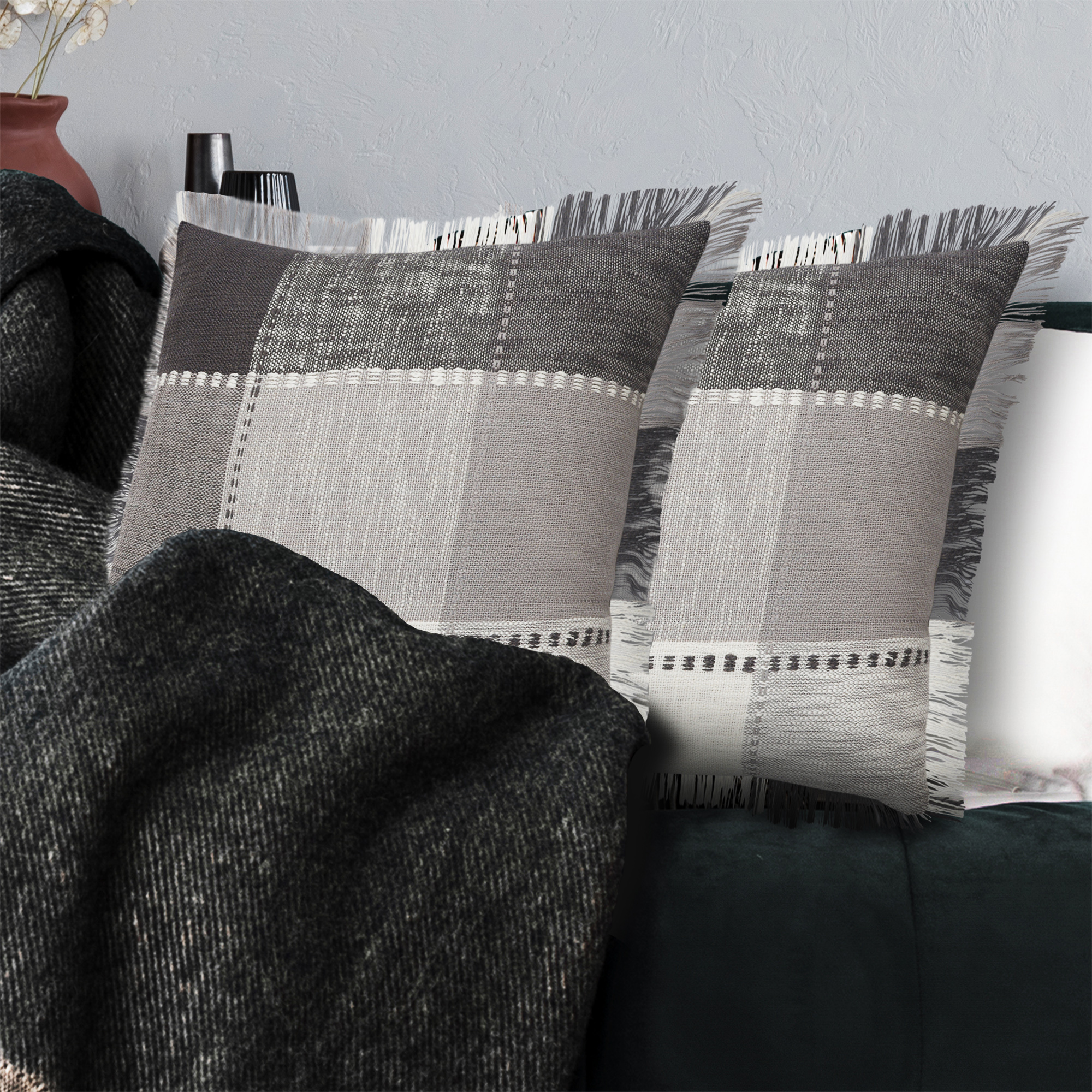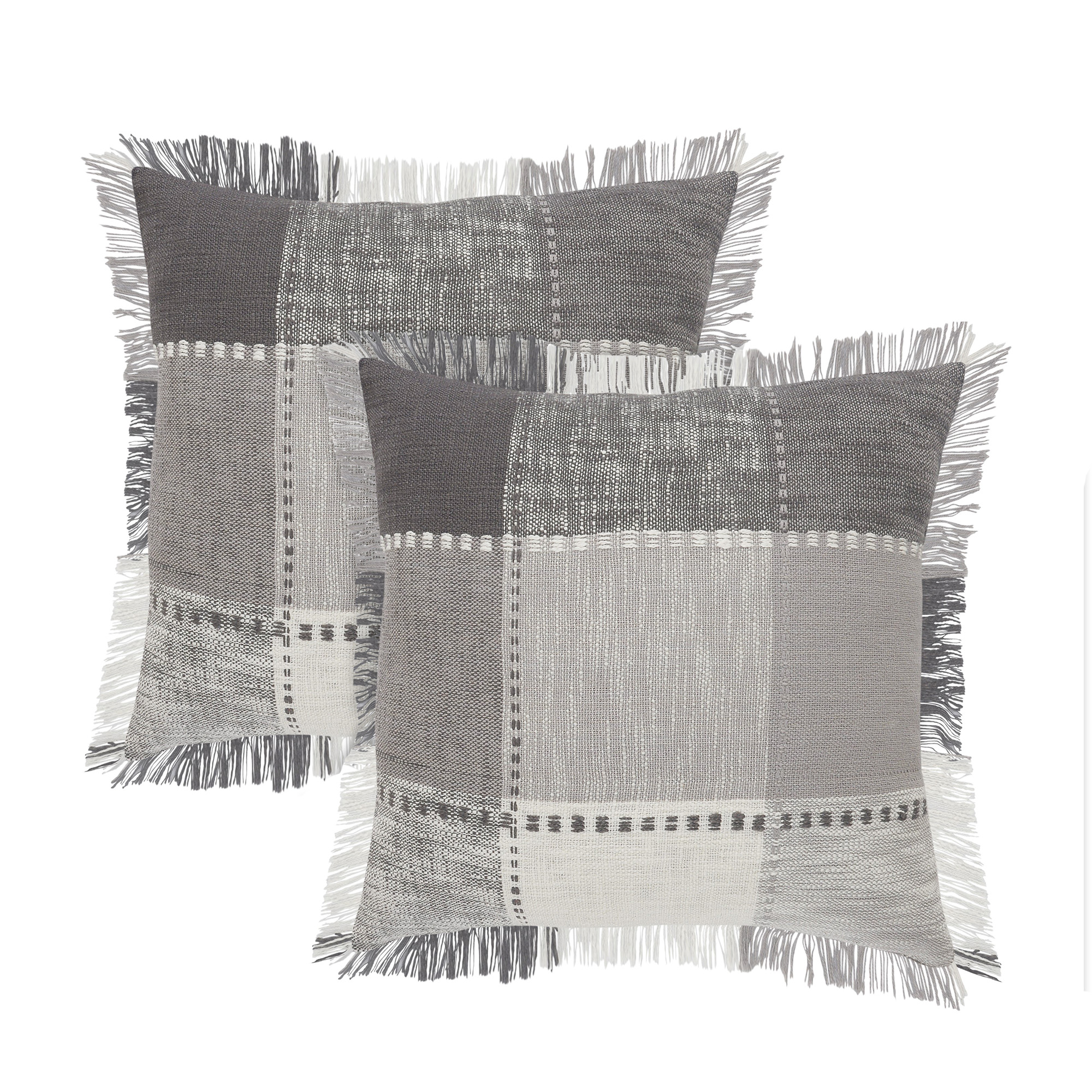 With a classic checkered tartan design, this poly-filled pillow set effortlessly enhances modern, contemporary, or transitional home decor styles. Expertly machine-made in India, the gray and ivory color palette with fringe detailing adds a sophisticated touch to any bed, couch, or bench. Designed for both style and durability, this pillow set is a versatile accent that brings comfort and charm to your living spaces.