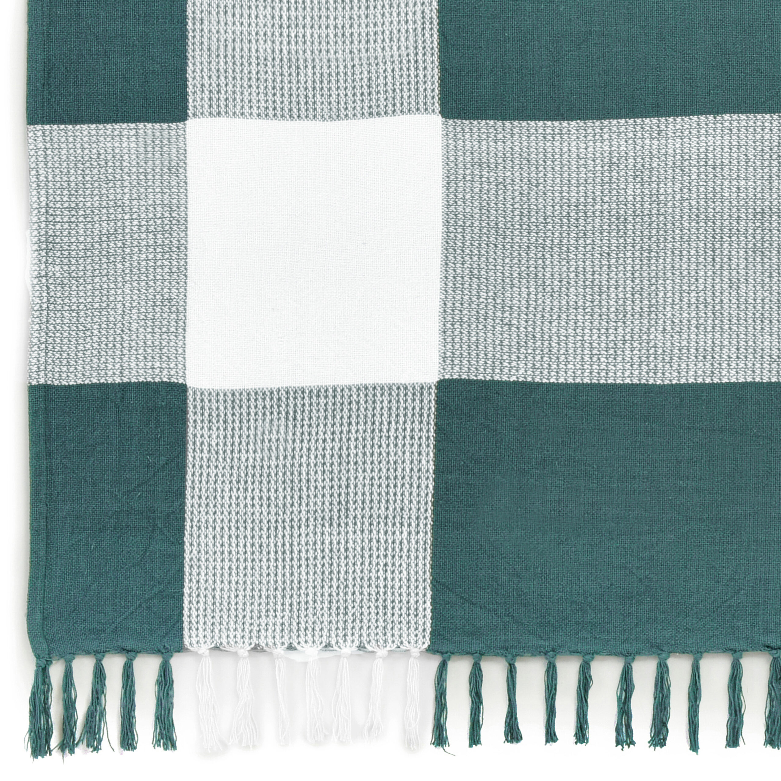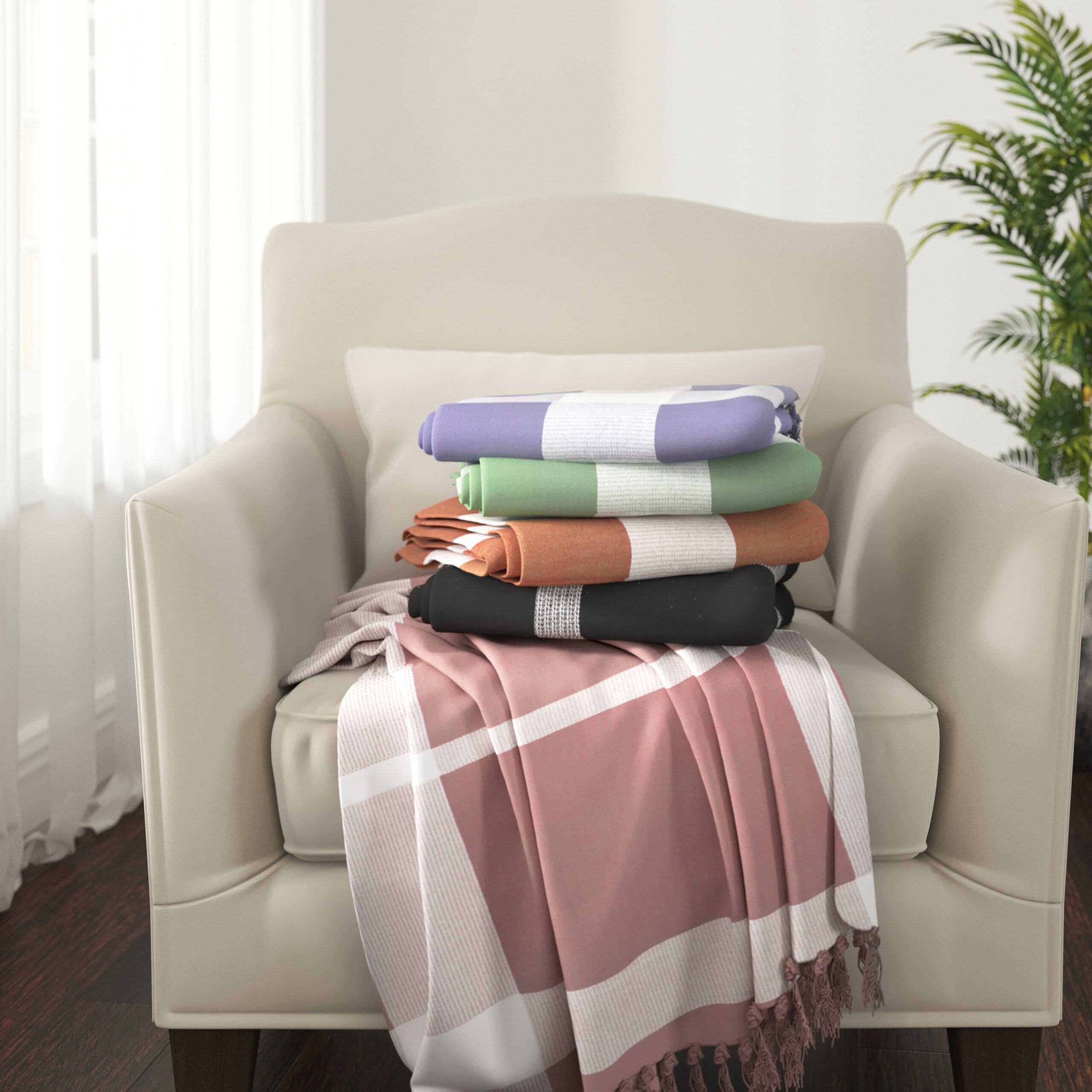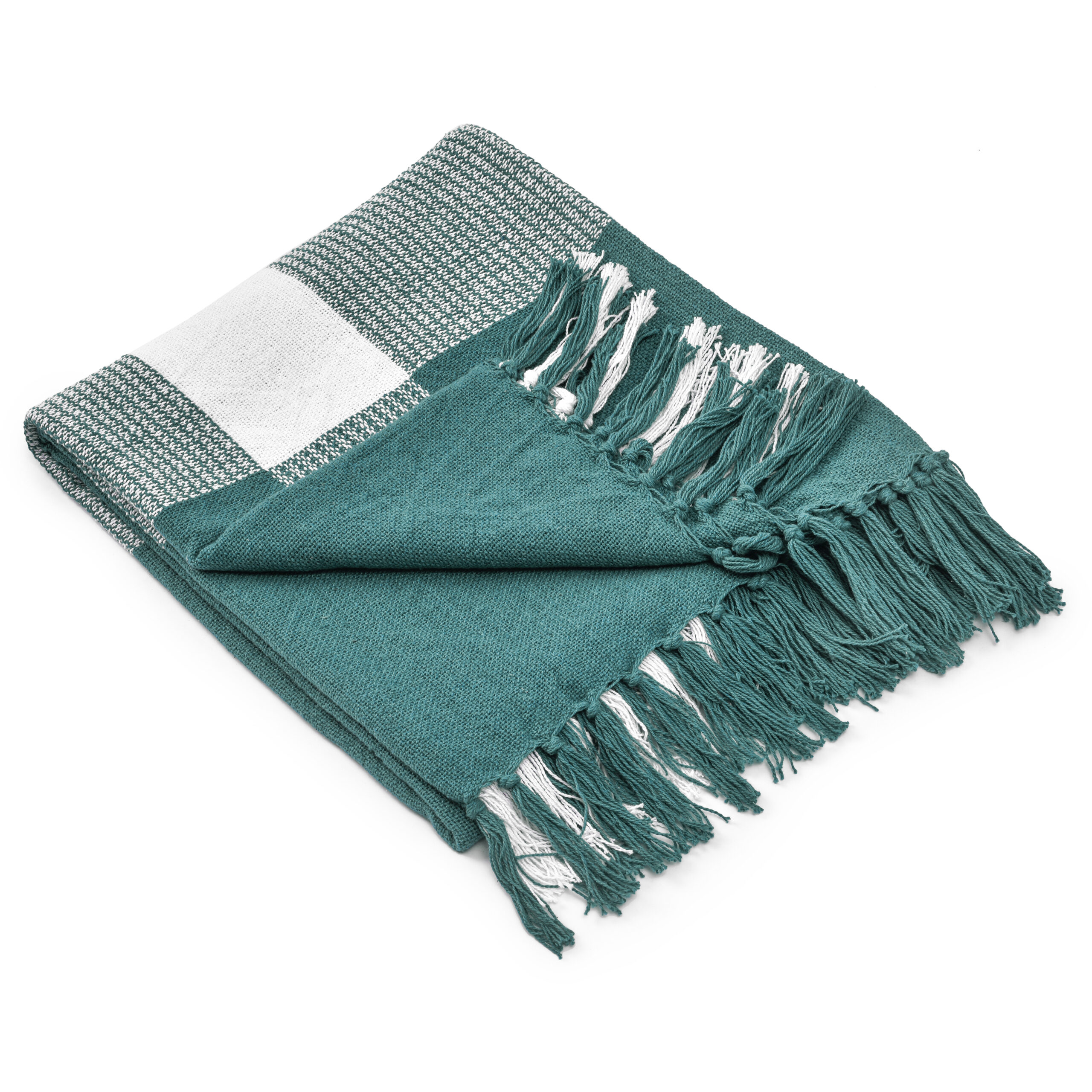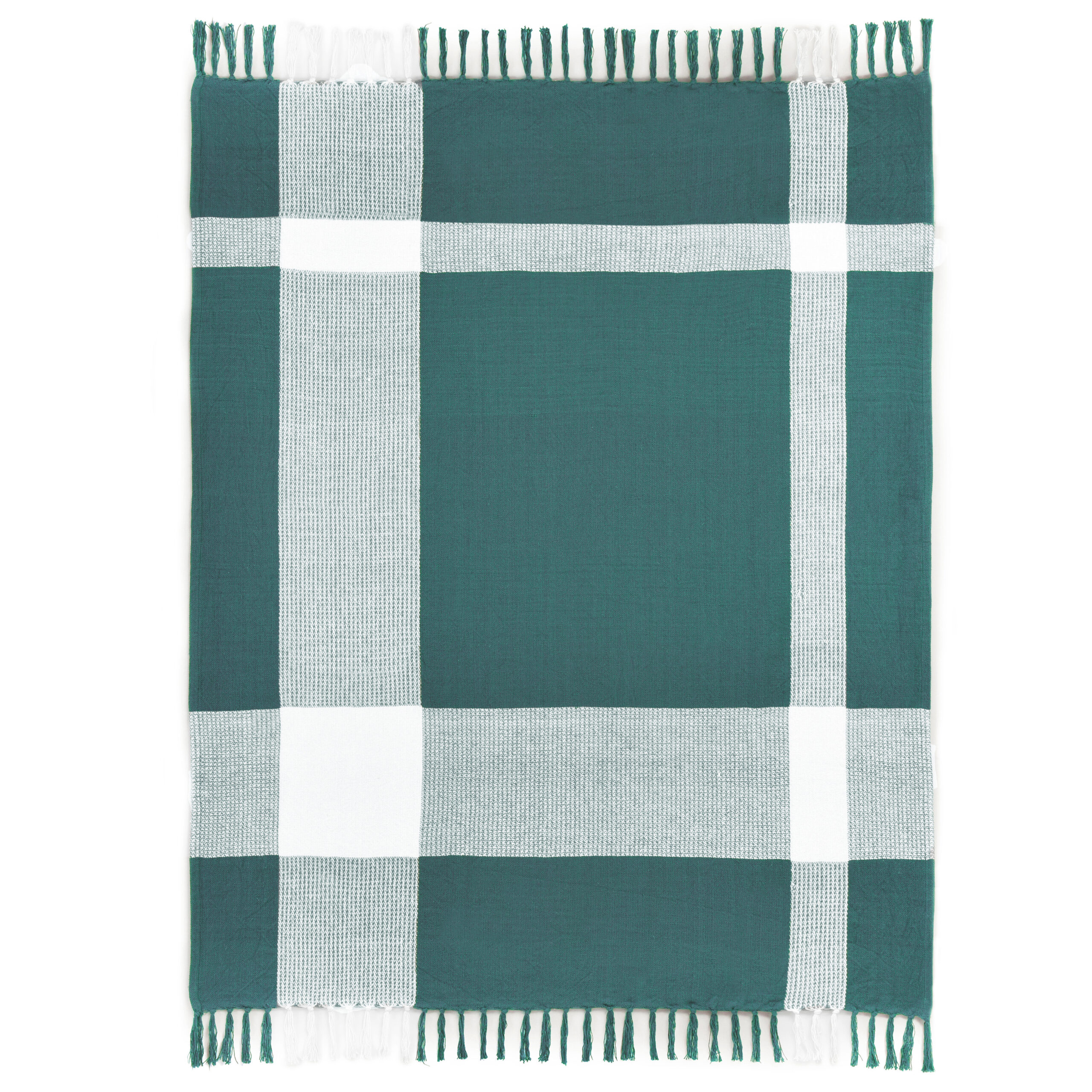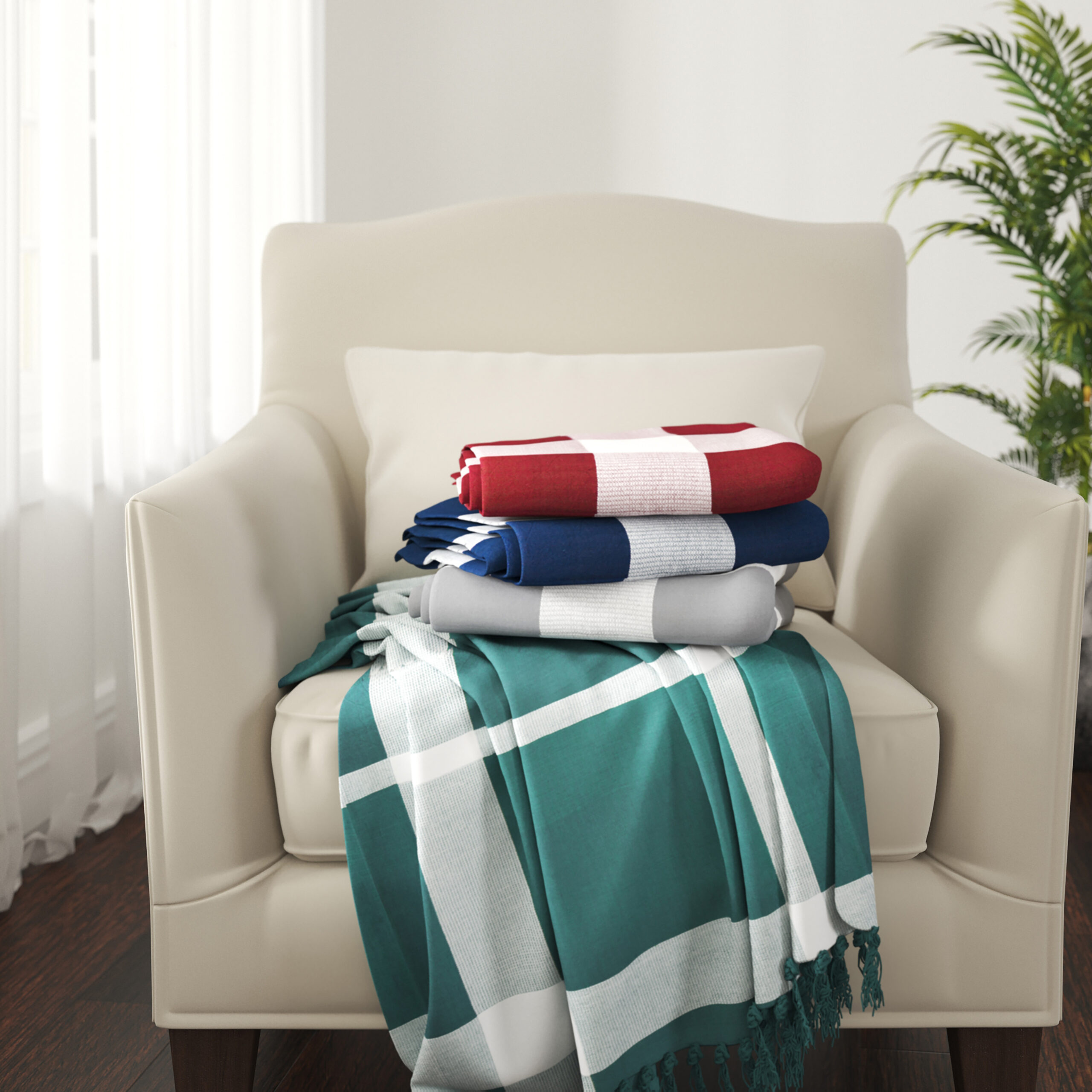 Come get cozy with this decadent cotton throw blanket. Featuring a classic, plaid design in a rich, saturated color with a comfy, broken-in feel. Self-bound edges provide durability, and added fringe gives a little extra flair. This blanket is crafted in India from all-natural, All-Natural cotton, which provides ultimate breathability and comfort that you will enjoy year-round.