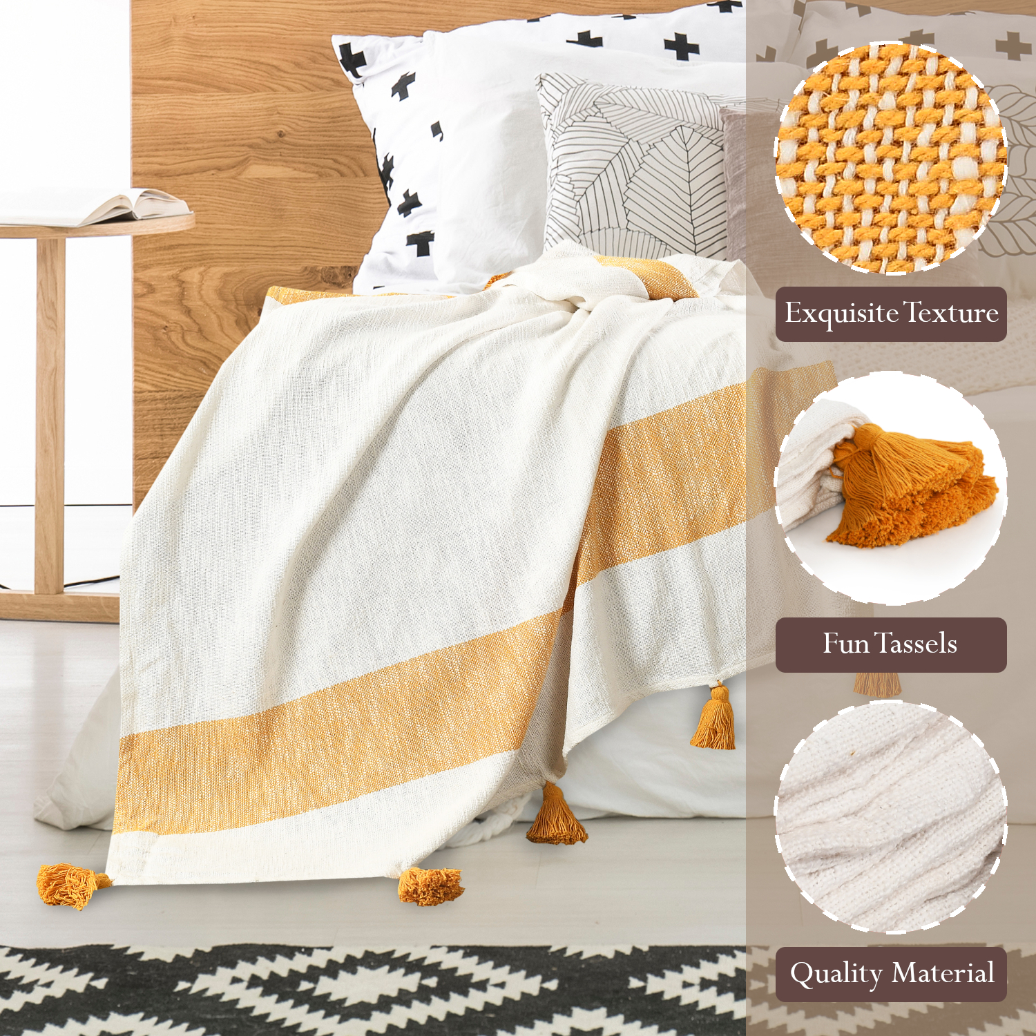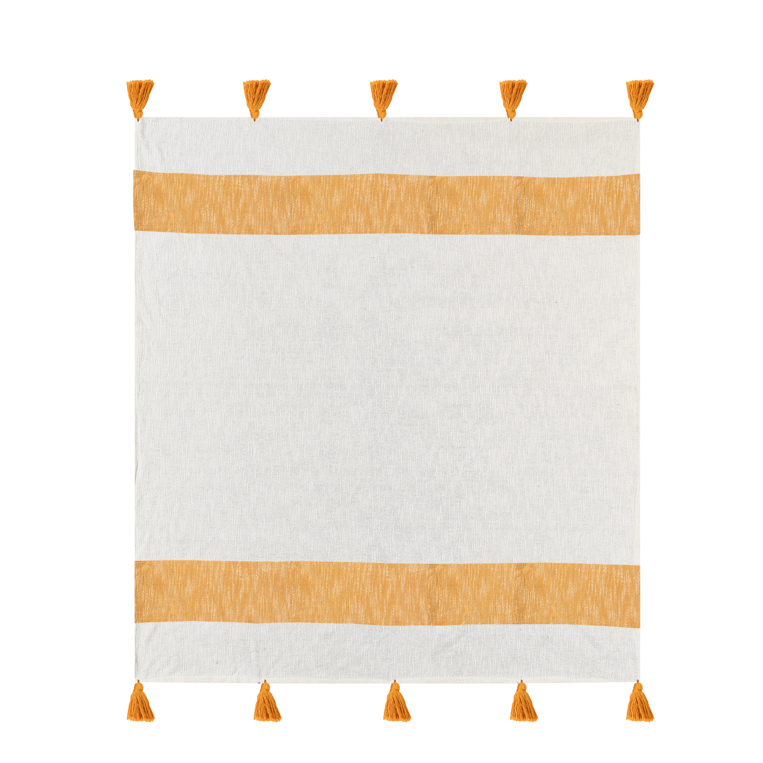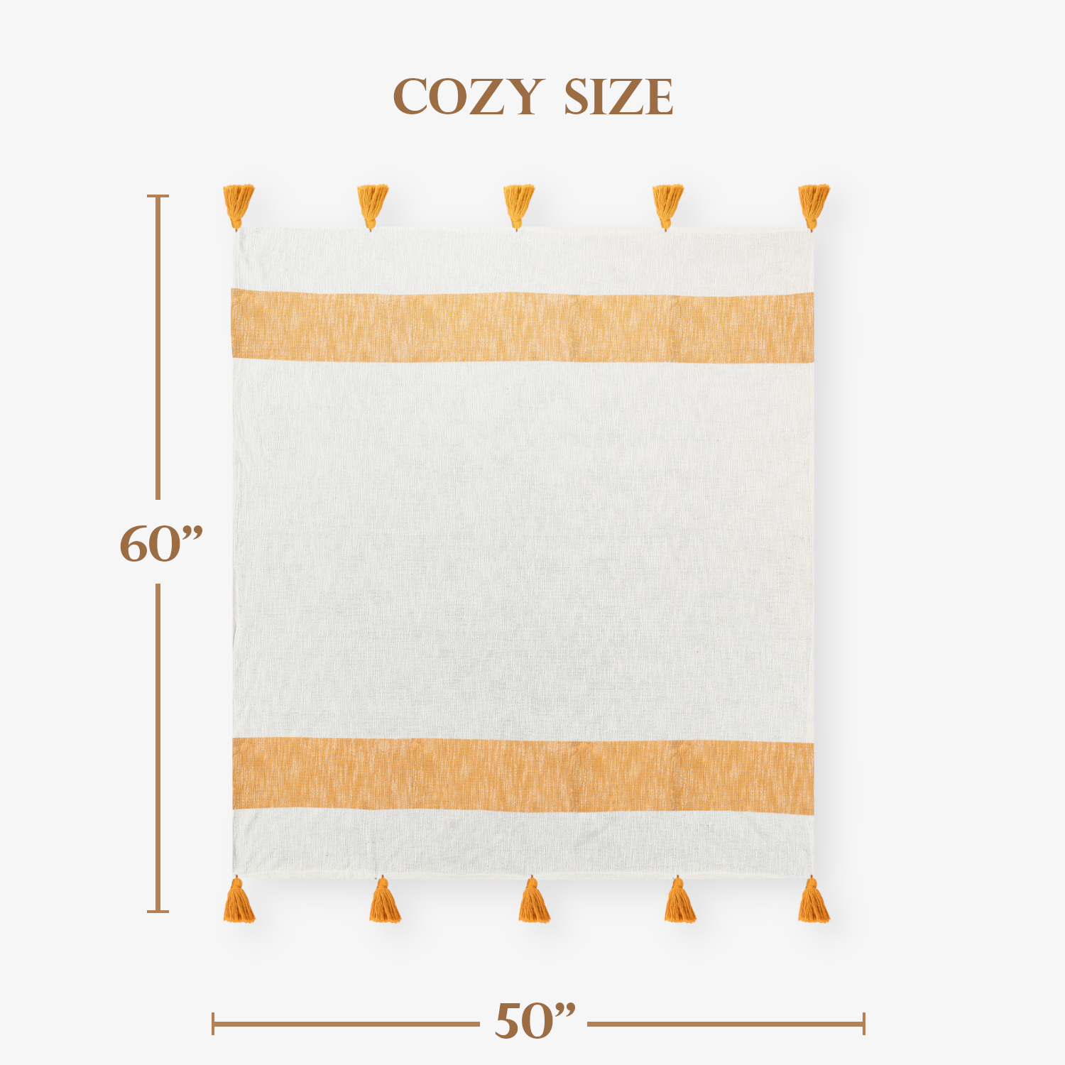 Come get cozy with this decadent cotton throw blanket. Featuring two classic, bold stripes in a heathered wash for a comfy, broken-in feel; with self-binding edges for durability, and tassles for a little extra flair. This blanket is crafted in India from all-natural, All-Natural cotton, which provides ultimate breathability and comfort that you will enjoy year-round.