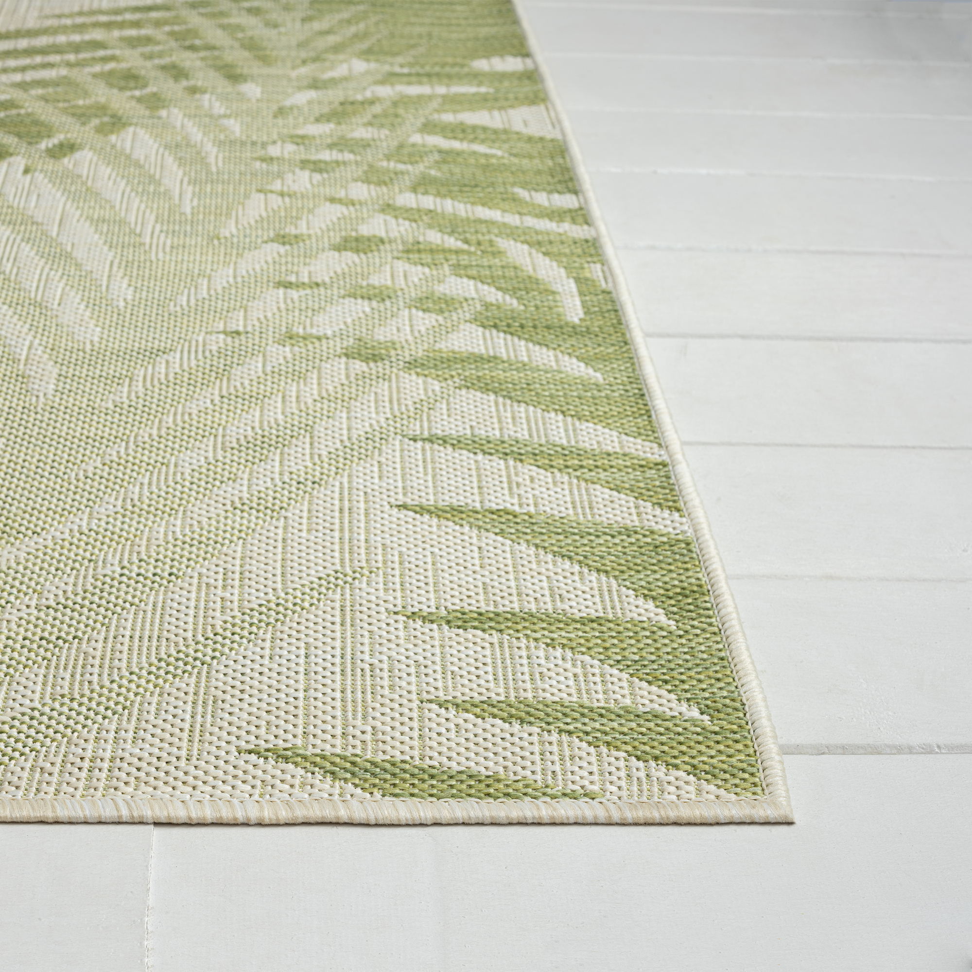 Transform any space with this versatile coastal flatweave area rug, perfect for indoor and outdoor use. Featuring a stylish green palm frond design on a beige background, it creates a striking foundation for your deck, patio, lanai, entryway, or hallway. Power loomed from durable polypropylene fibers, this rug is lightweight, comfortable underfoot, and built to last. Its fade, stain, and moisture resistant construction ensures long-lasting beauty, whether placed indoors or outdoors. Measuring 1’10” x 3’0″, it’s ideal for small spaces such as bathrooms, apartments, dorms, and entryways. Complement a wide range of décor styles from tropical to contemporary with this easy-to-maintain, high-quality rug.