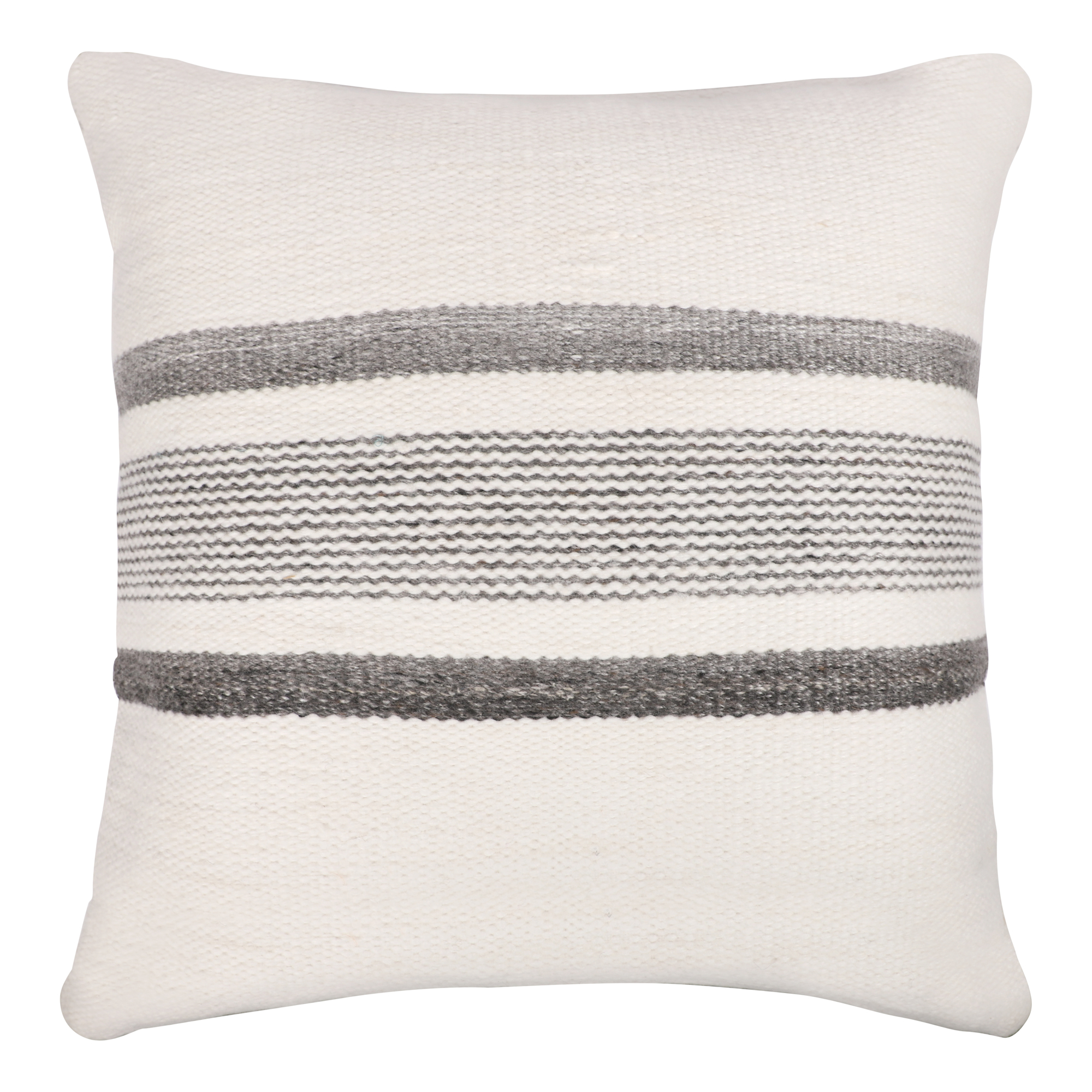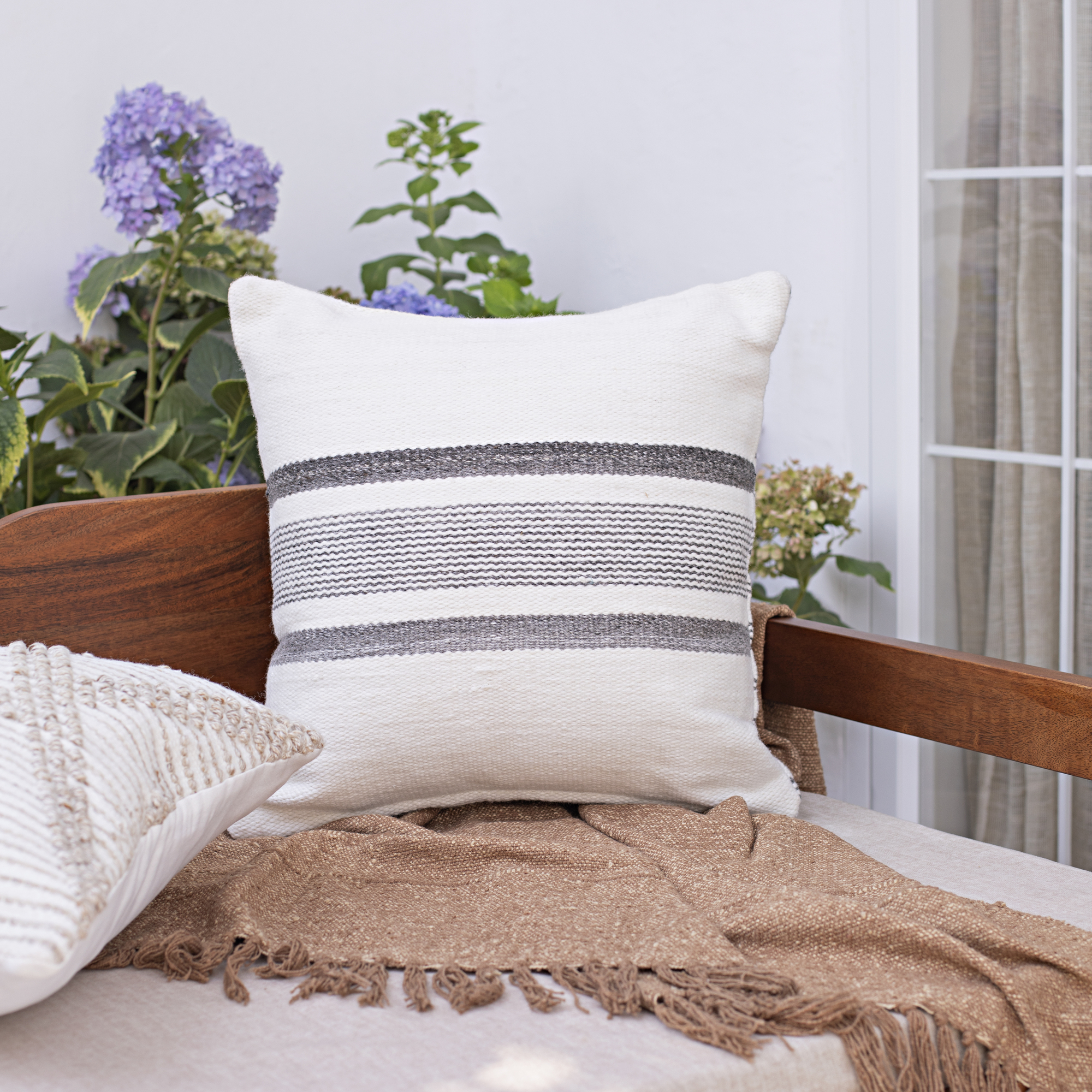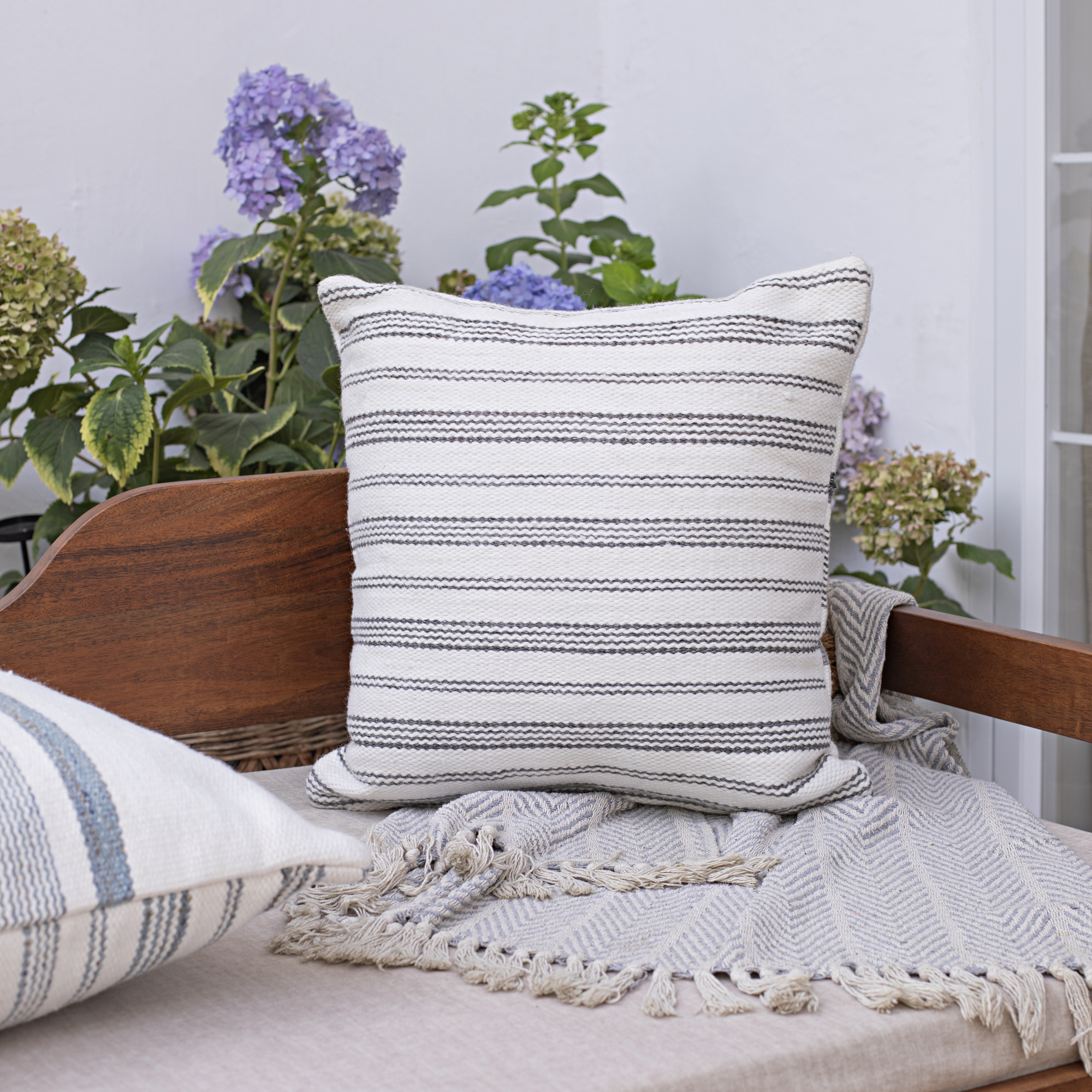 Meticulously hand-woven in India, this cover marries craftsmanship with environmental consciousness. Crafted from 100% recycled P.E.T., it not only upholds sustainable practices but also delivers a durable and weather-resistant solution for indoor and outdoor spaces. The striped design in charcoal and white hues effortlessly merges farmhouse and coastal aesthetics, offering a stylish touch to your decor. This versatile throw pillow cover serves as a decorative and accent piece, enhancing the appeal of any space. Originating from India, each thread of this hand-woven cover reflects a commitment to both artistry and sustainability.
