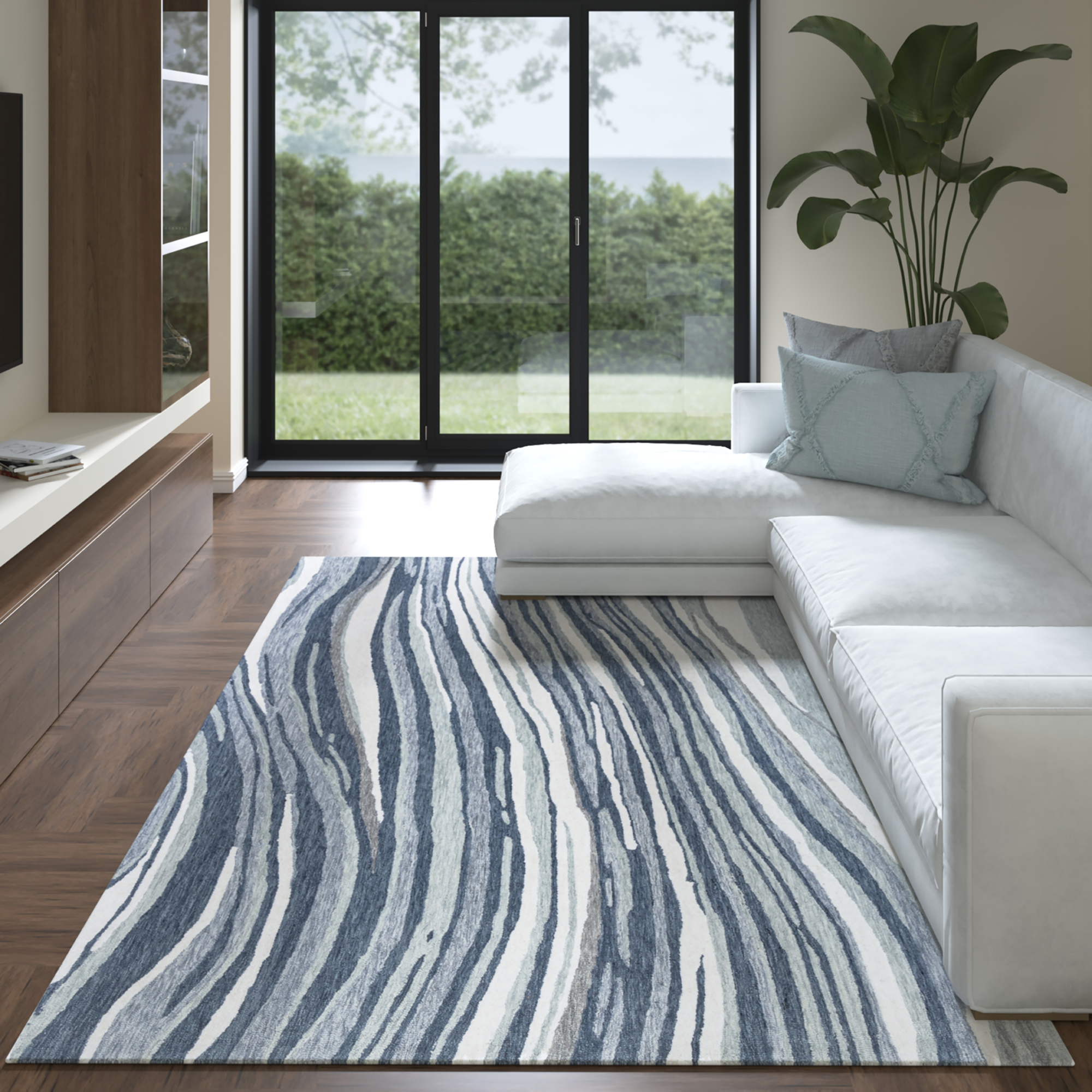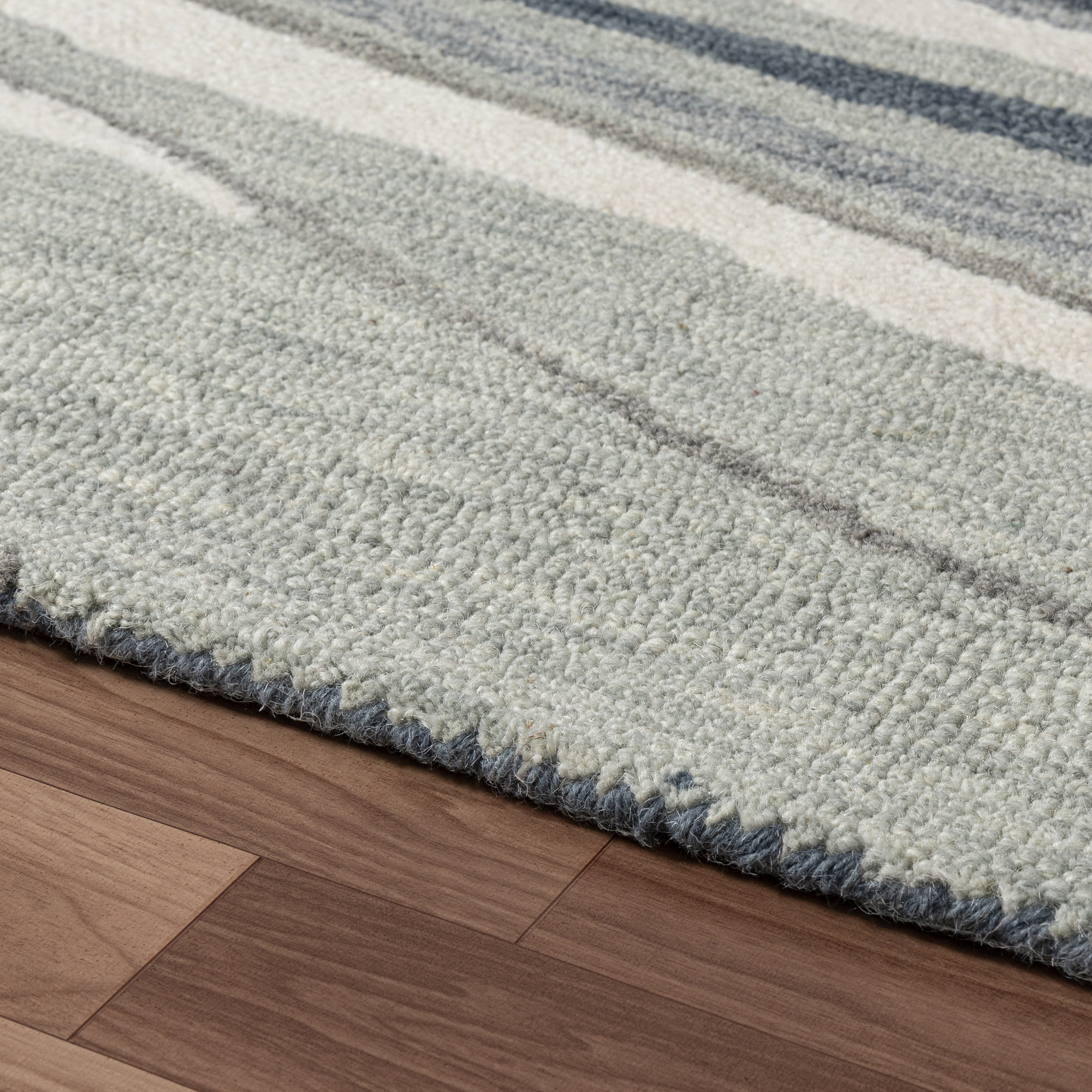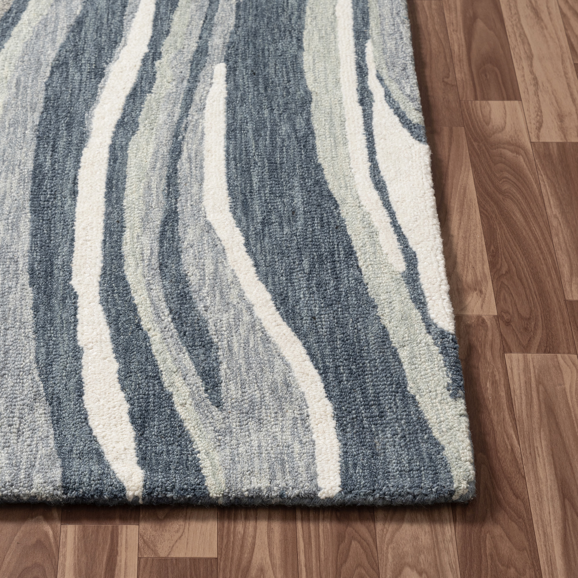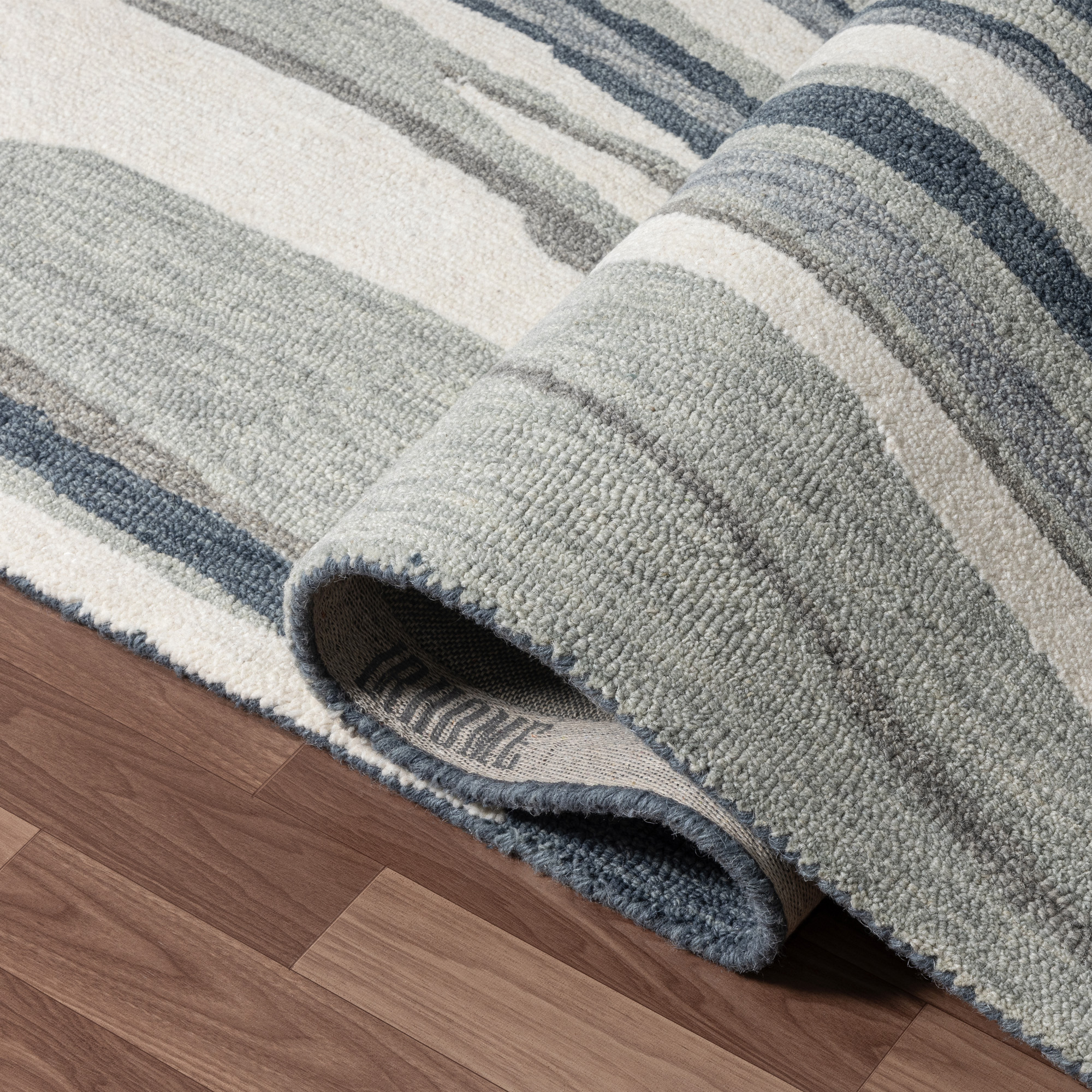 Introducing the Myrtle Contemporary Striped Wool Area Rug, a stunning addition to any contemporary or transitional space. Expertly handmade in India, this hand-tufted rug combines wool on a cotton backing for a durable and luxurious feel. The abstract striped pattern in soothing blue, gray, and ivory tones adds a modern touch to your decor. With its cotton backing and hand-tufted craftsmanship, this rug is designed for easy maintenance- simply wipe it with a damp cloth to keep it looking fresh. Perfect for casual living rooms or stylish offices, this versatile area rug merges beauty with practicality. Elevate your interior with this exquisite, handmade wool rug.
