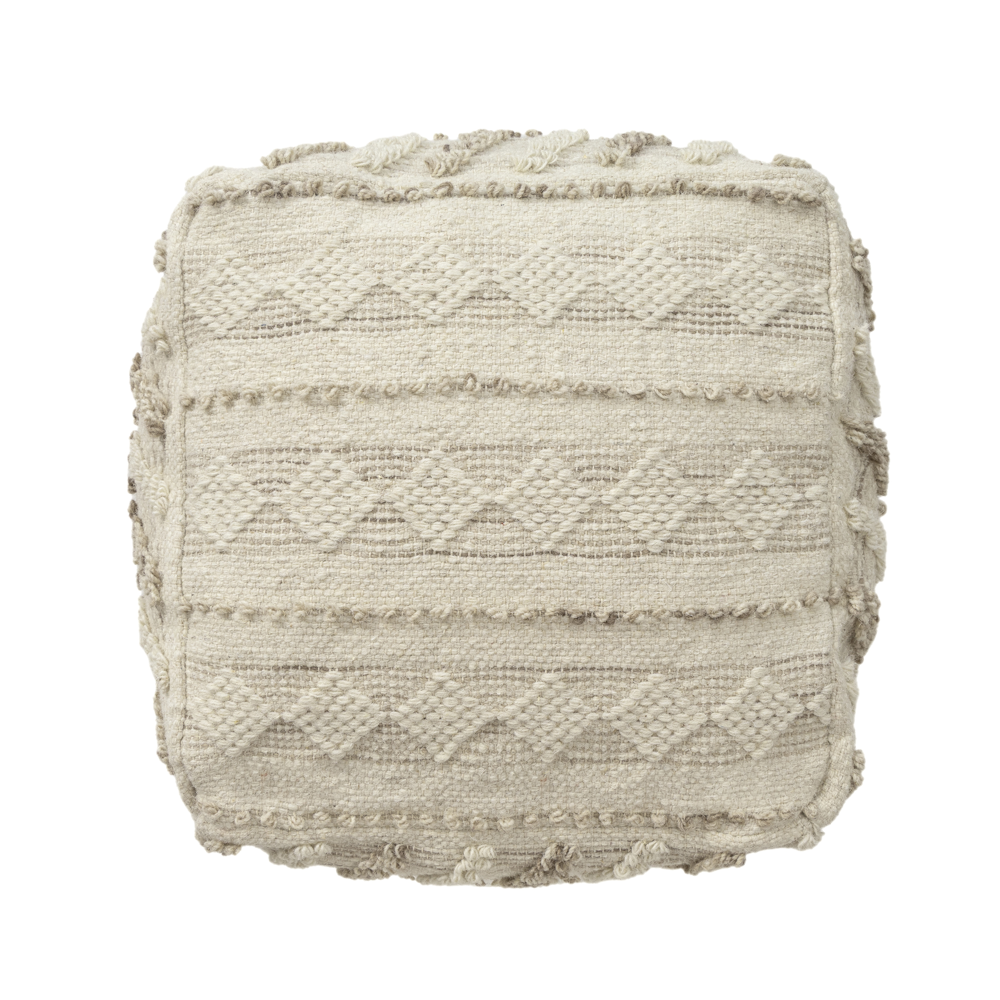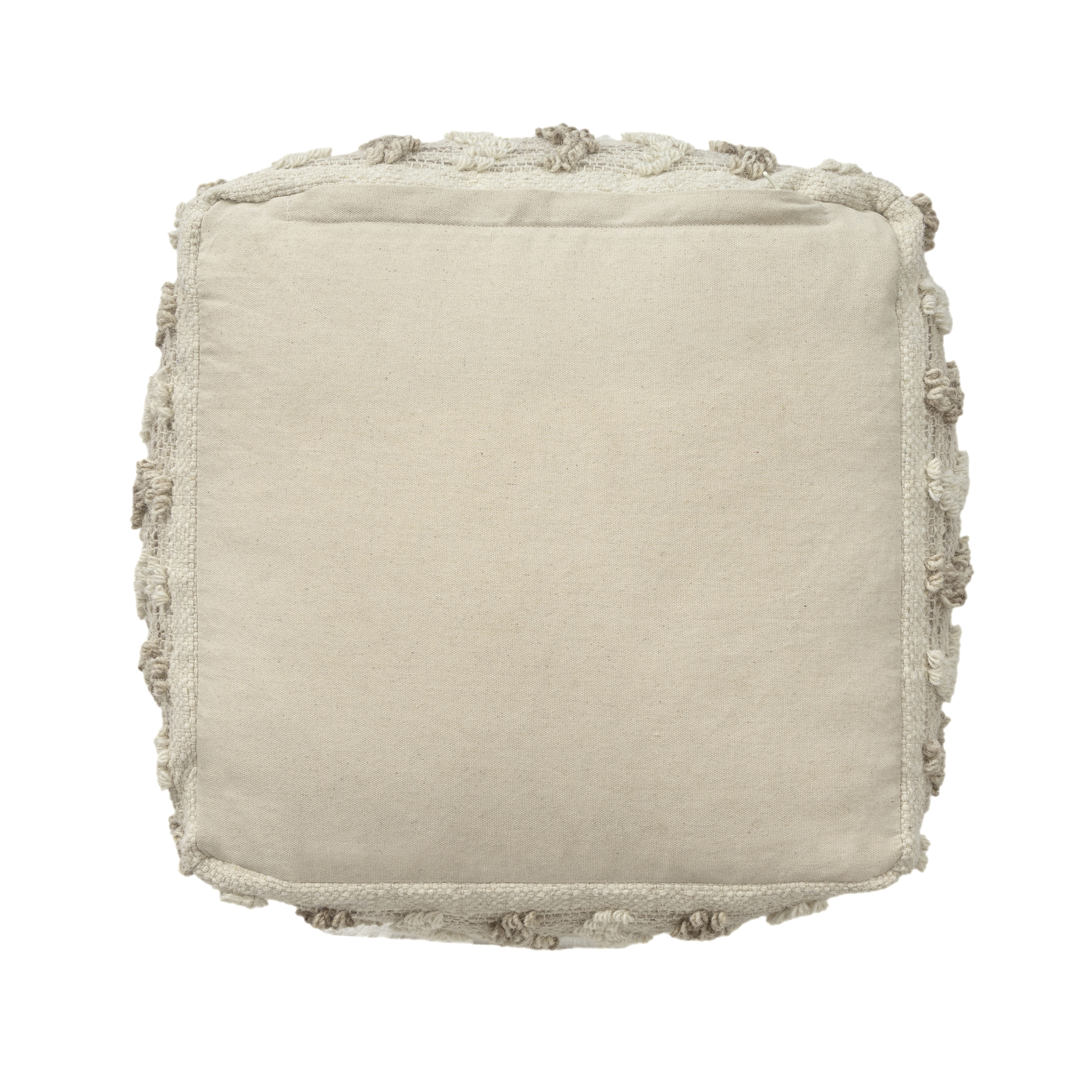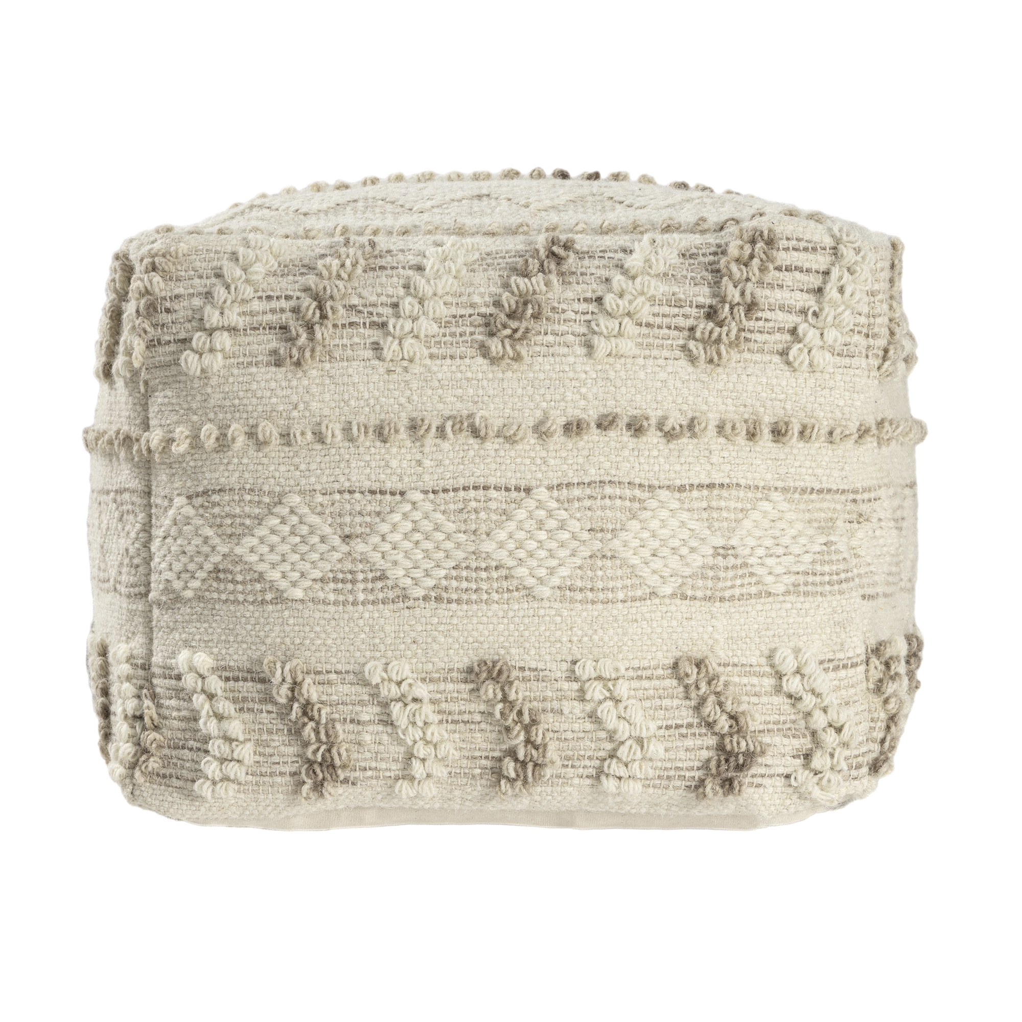 Bring warmth, texture, and functionality into your home with this handmade wool blend pouf ottoman. Featuring a beautifully woven wool and cotton cover with textured accents, this versatile square pouf delivers both comfort and style. Measuring 18 inches wide x 14 inches high, it’s the perfect size for small spaces yet large enough to serve multiple purposes. Use it as a cozy footrest, extra seating for guests, or a side table by adding a tray. The neutral taupe and ivory color coordinates easily with any interior – whether you™re going for boho chic, farmhouse charm, or modern minimalism. Ideal for: living rooms, bedrooms, reading nooks, nurseries, and entryways. Lightweight and portable so you can move it wherever you need extra comfort or style.