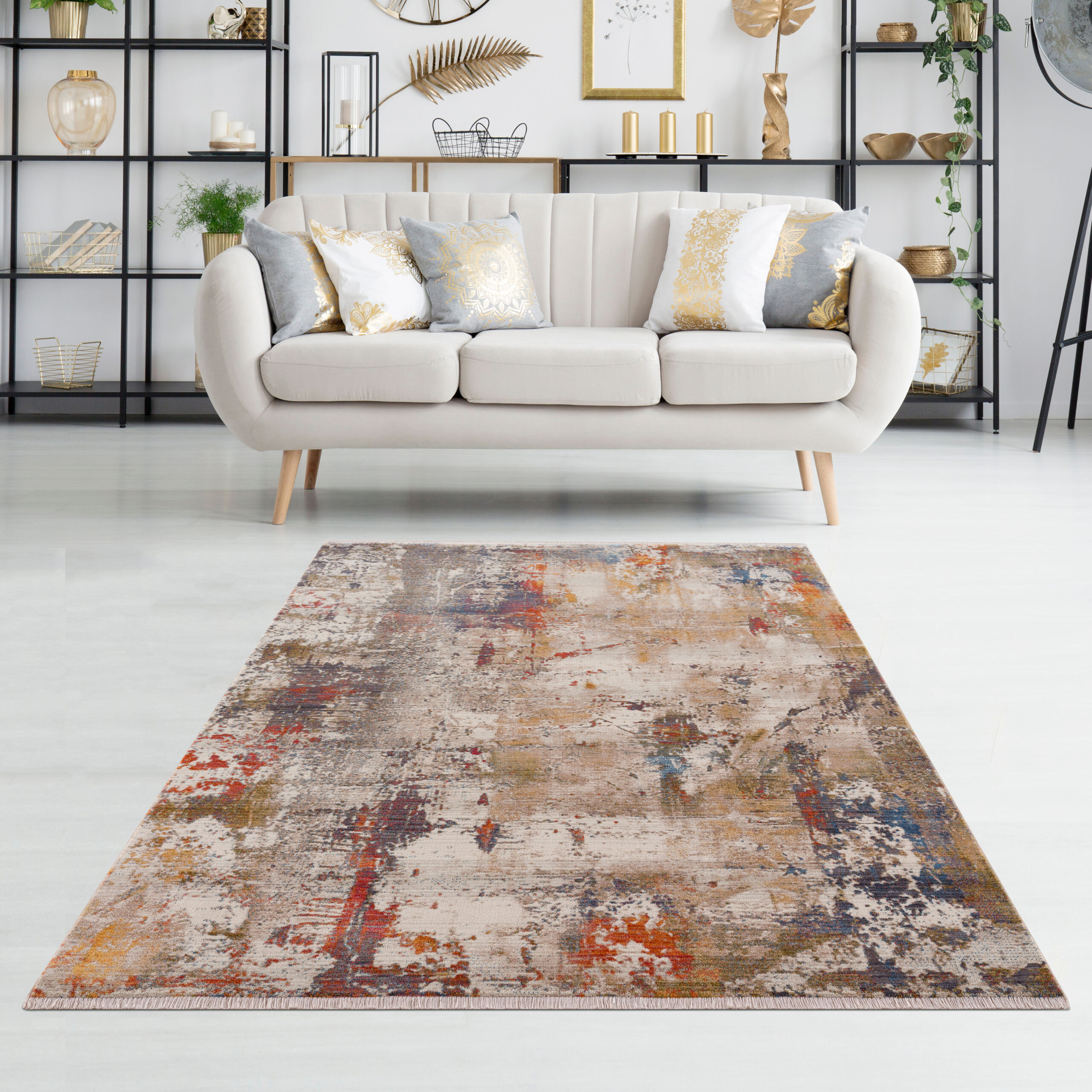 This distressed modern abstract area rug showcases a muted design with brilliant pops of color. Finished with delicate fringe, this area rug adds an extra touch of texture to your flooring. The distressed display of multiple hues in white, gray, blue, and golden yellow-orange gives this area rug a rustic-chic appeal. This power-loomed rug is perfect for busy homes and high traffic areas with its easy-to-clean features and durable construction.