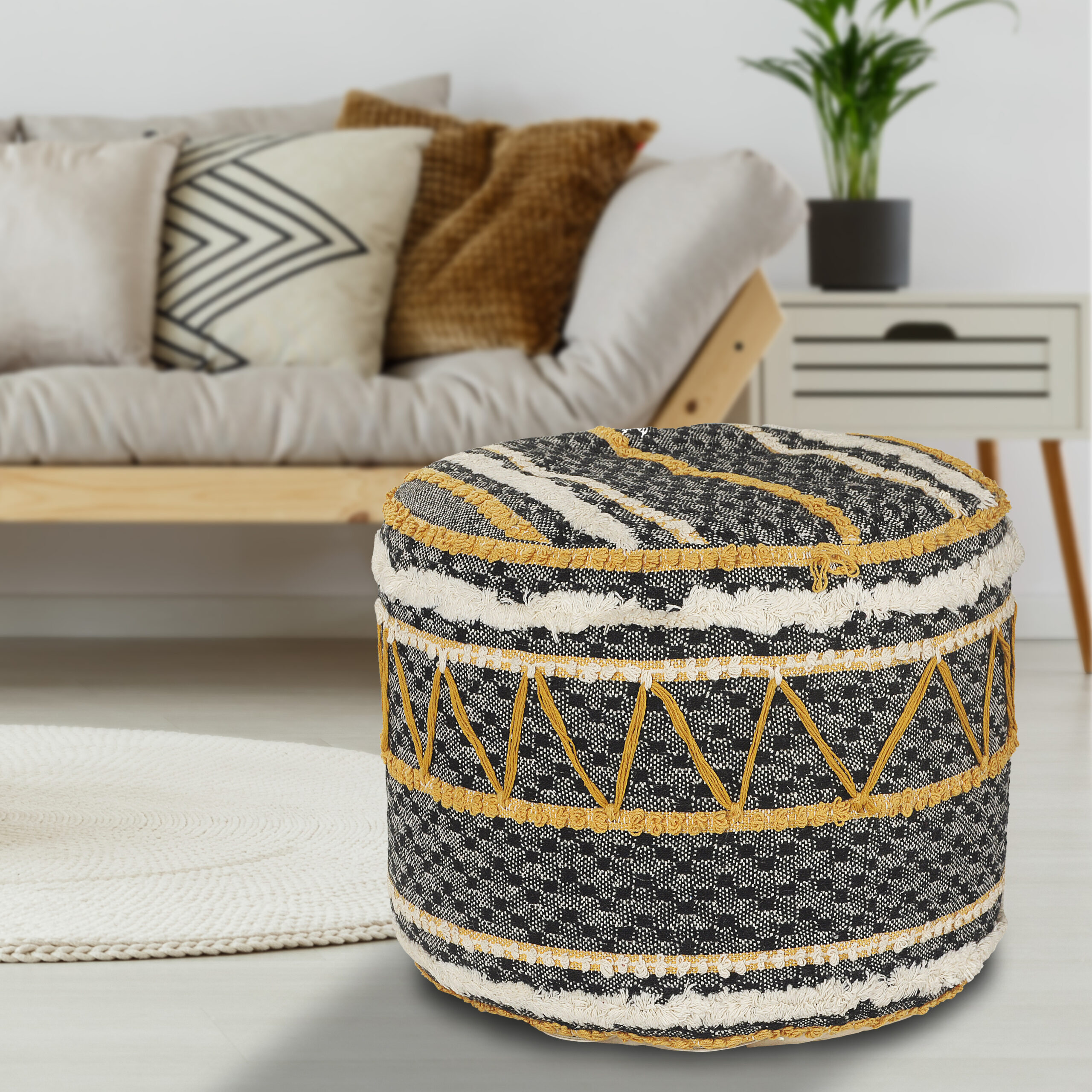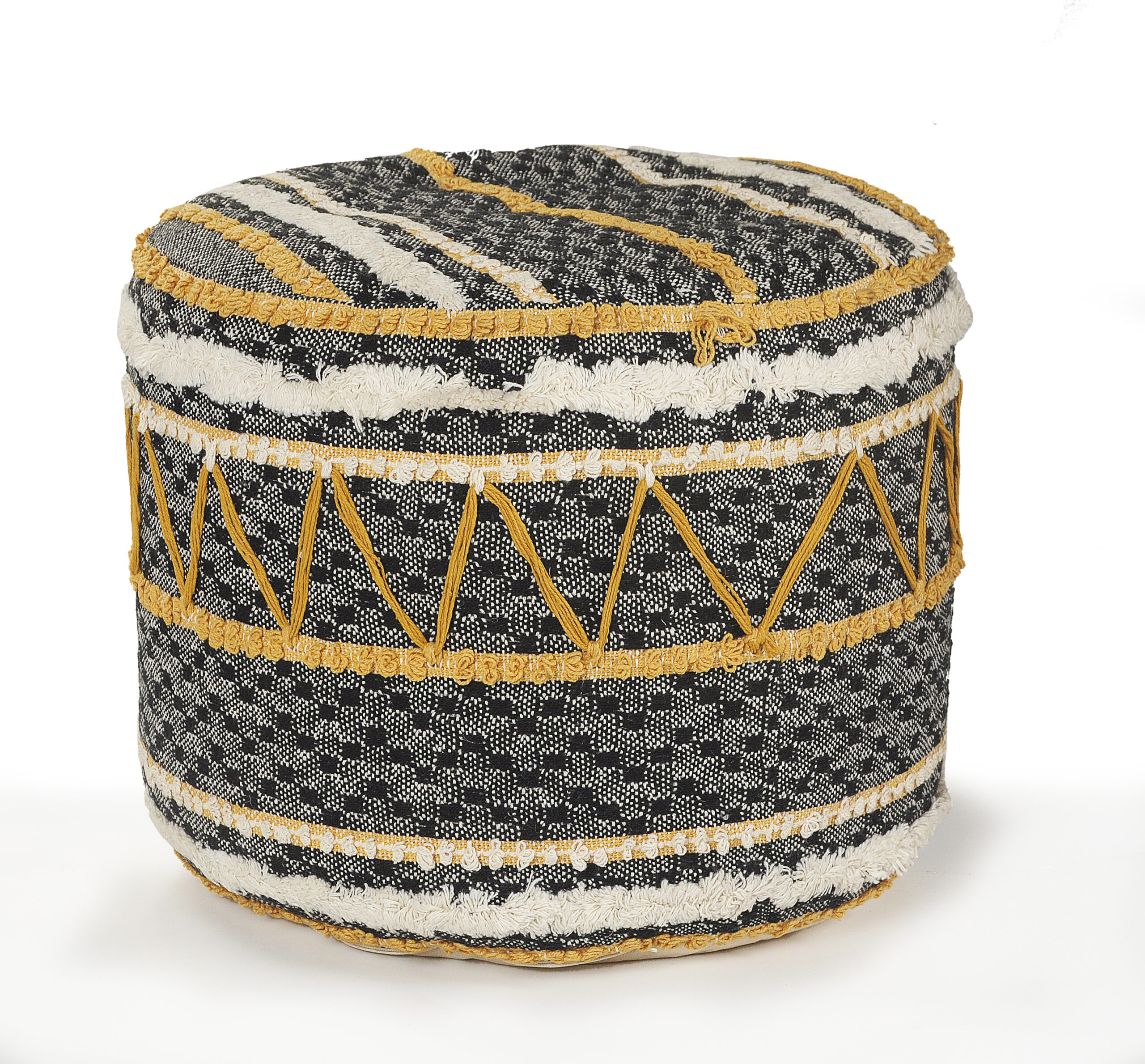 This charming, round pouf is a versatile and stylish piece that will enhance any room in your home. Handmade in India using 100% cotton, it features a unique and eye-catching pattern that adds character and appeal. Filled with EPS balls, it also provides the perfect balance of support and comfort, making it ideal for use as a seat or a footrest. Its high-quality materials and superior construction ensure that this decorative pouf will last for years to come.
