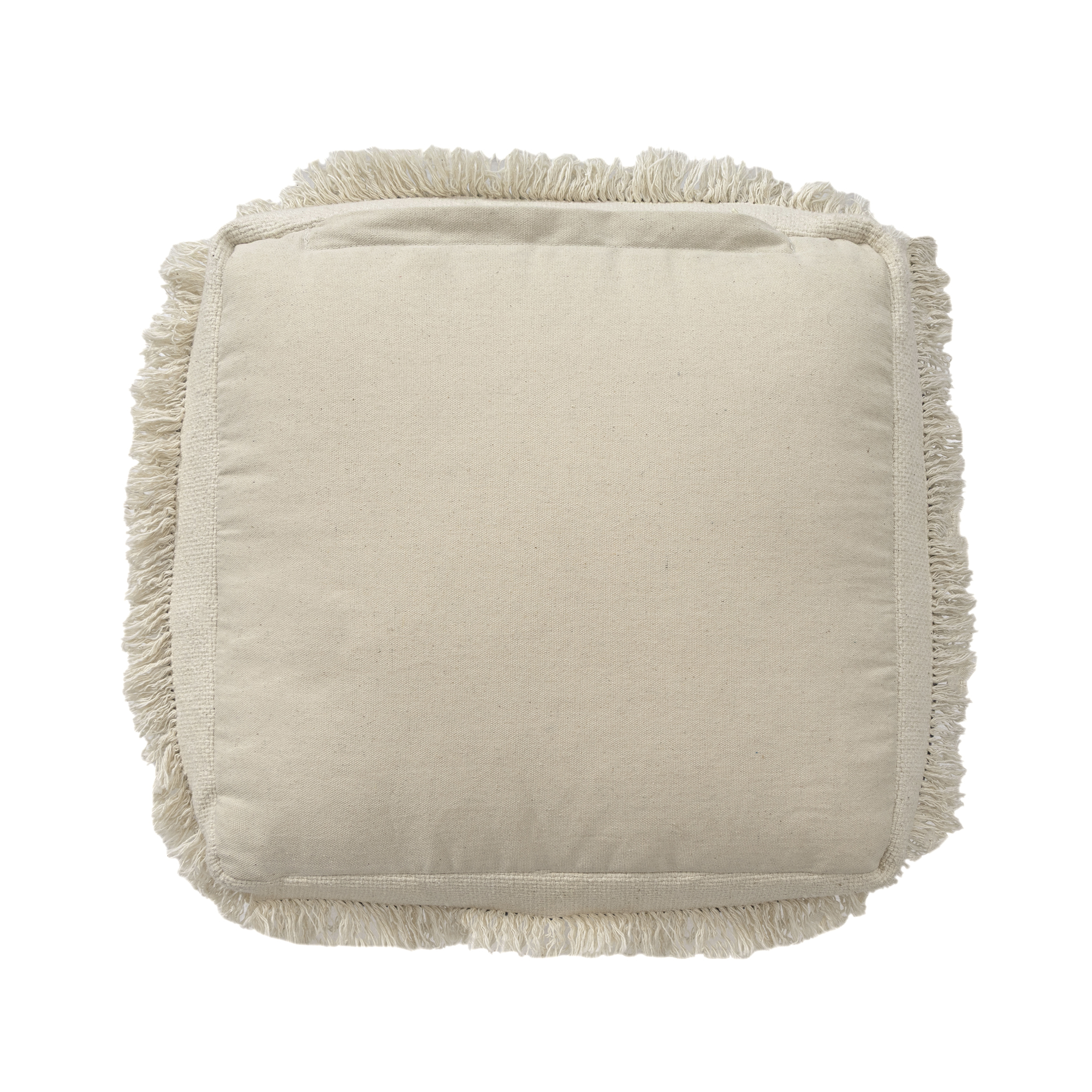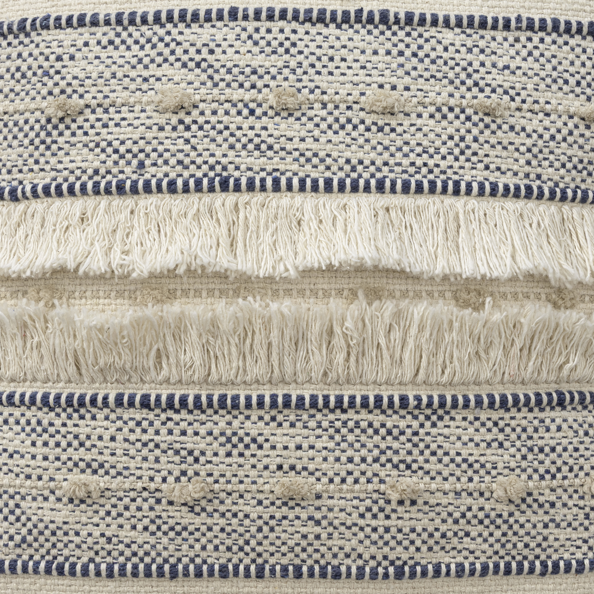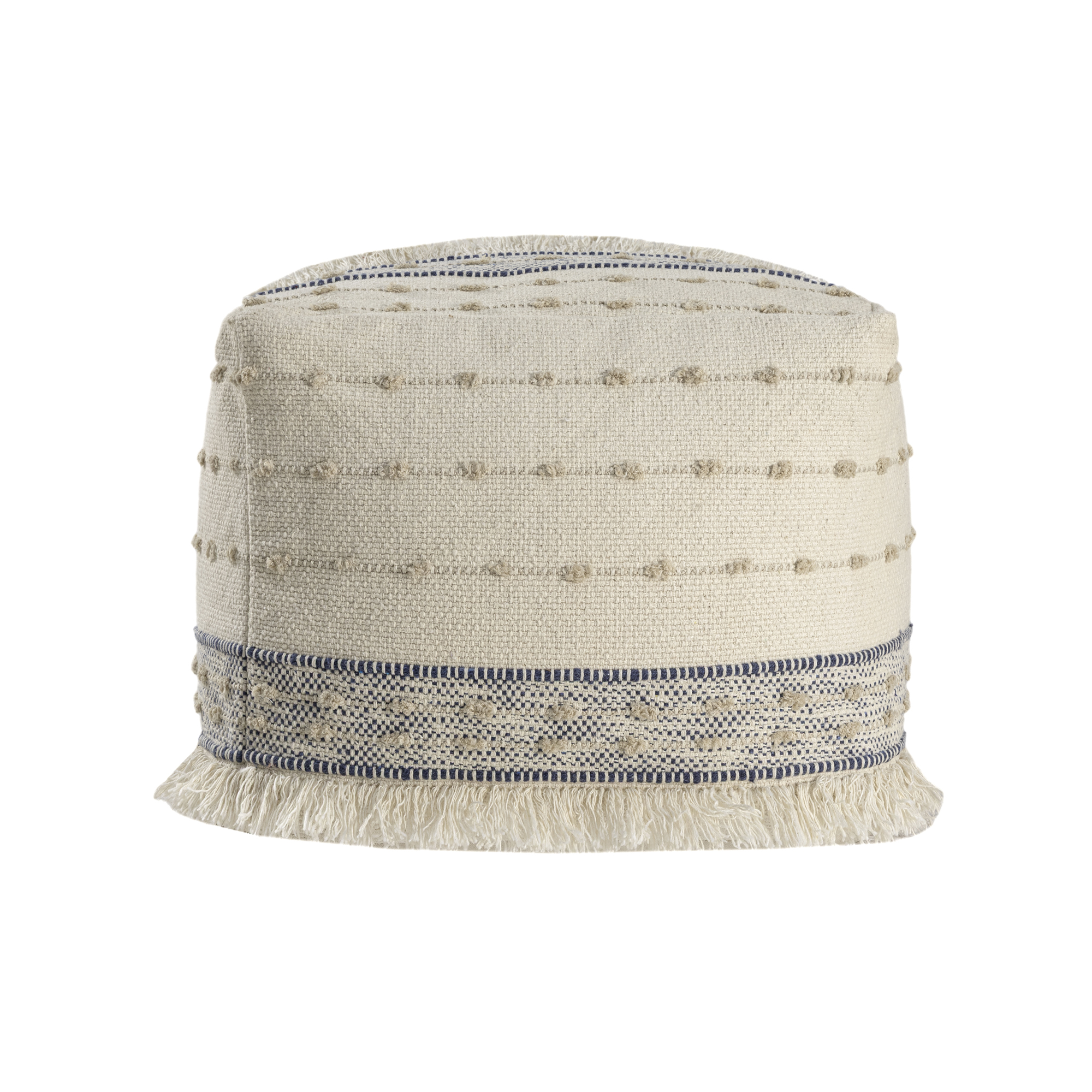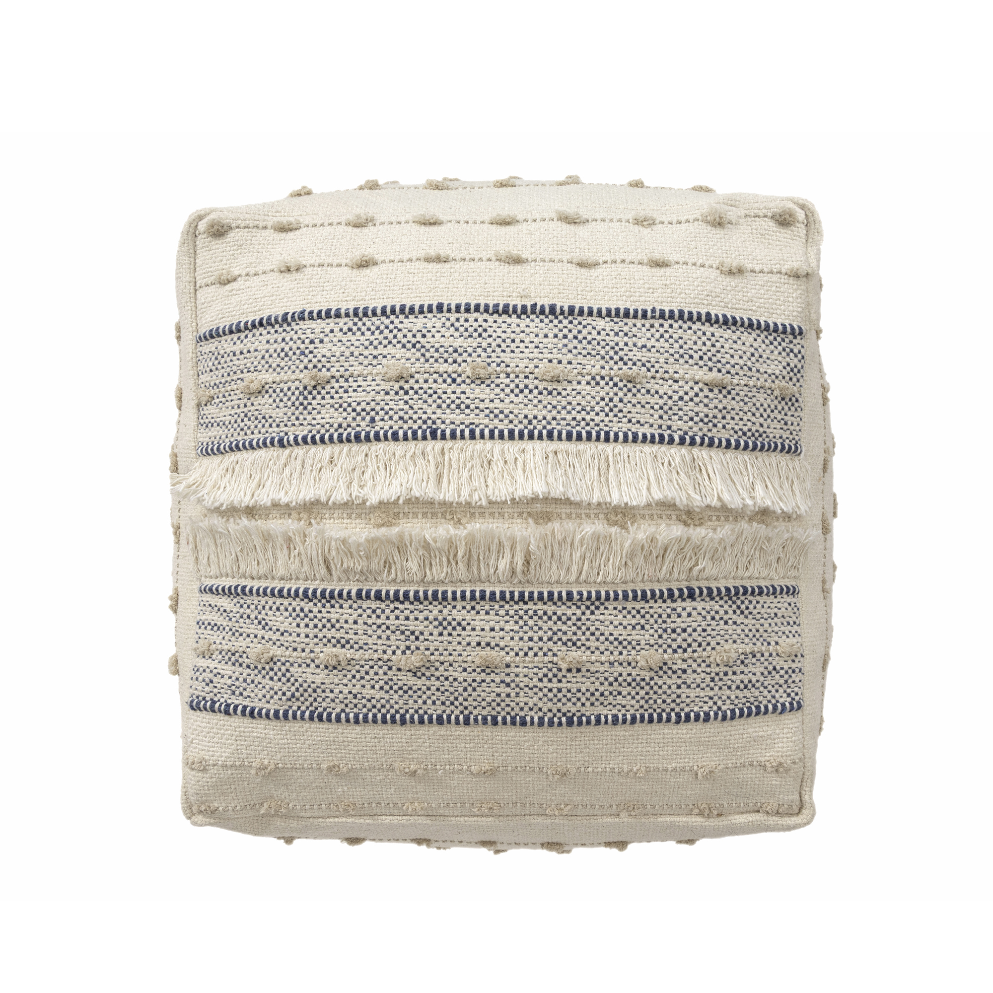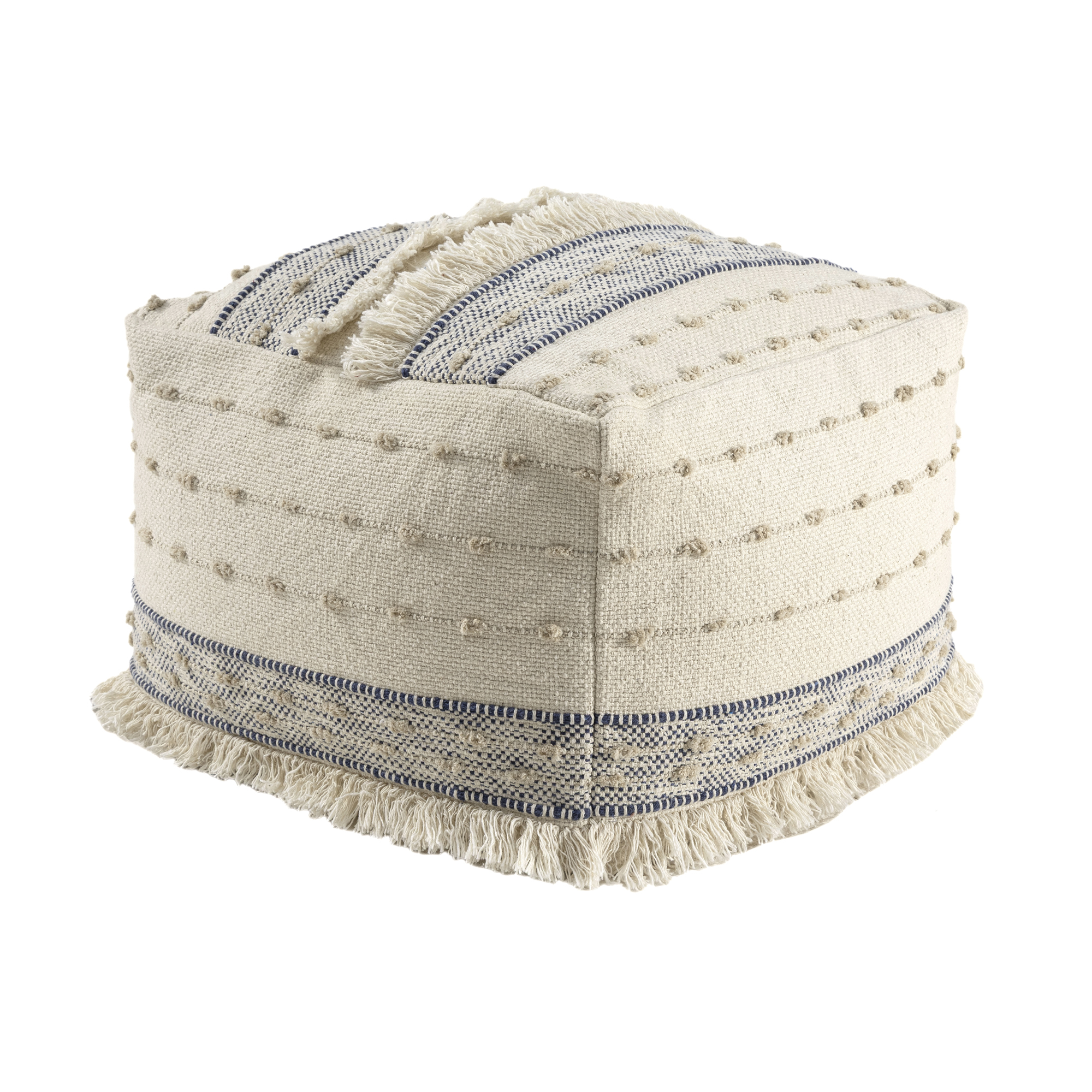 Bring warmth, texture, and functionality into your home with this handmade cotton pouf ottoman. Featuring a beautifully woven cotton cover with textured accents and fringe, this versatile square pouf delivers both comfort and style. Measuring 18 inches wide x 14 inches high, it’s the perfect size for small spaces yet large enough to serve multiple purposes. Use it as a cozy footrest, extra seating for guests, or a side table by adding a tray. The neutral blue and ivory color coordinates easily with any interior – whether you™re going for boho chic, farmhouse charm, or modern minimalism. Ideal for: living rooms, bedrooms, reading nooks, nurseries, and entryways. Lightweight and portable so you can move it wherever you need extra comfort or style.