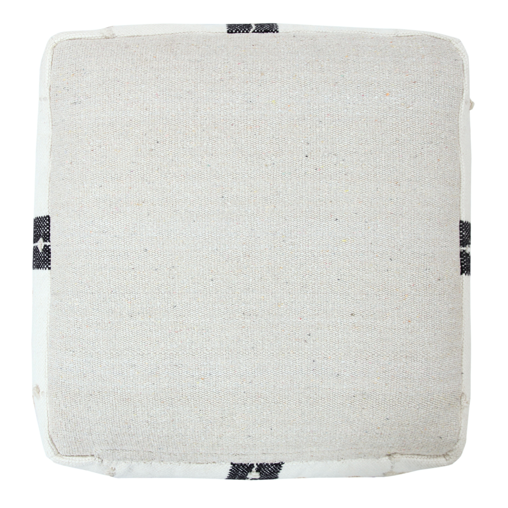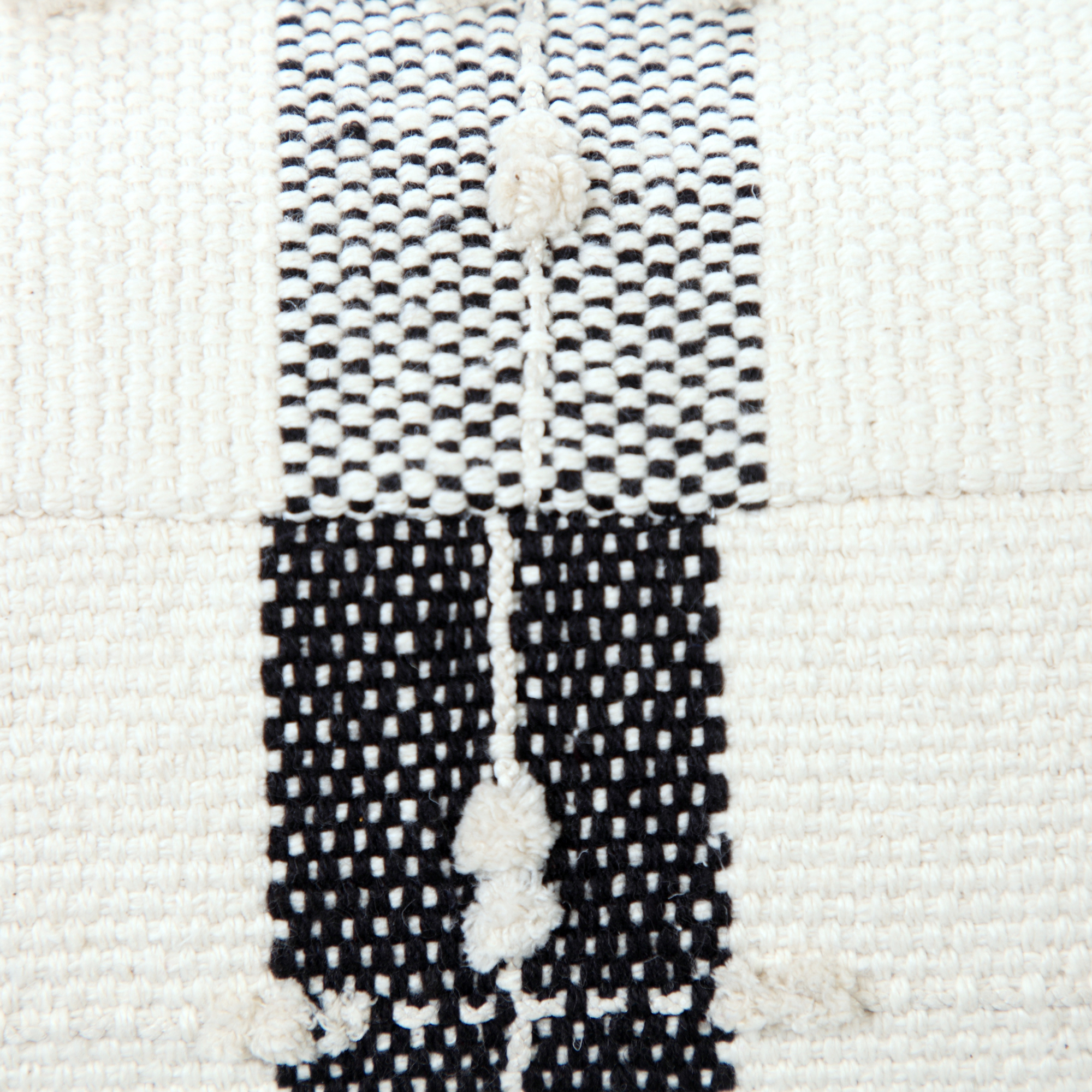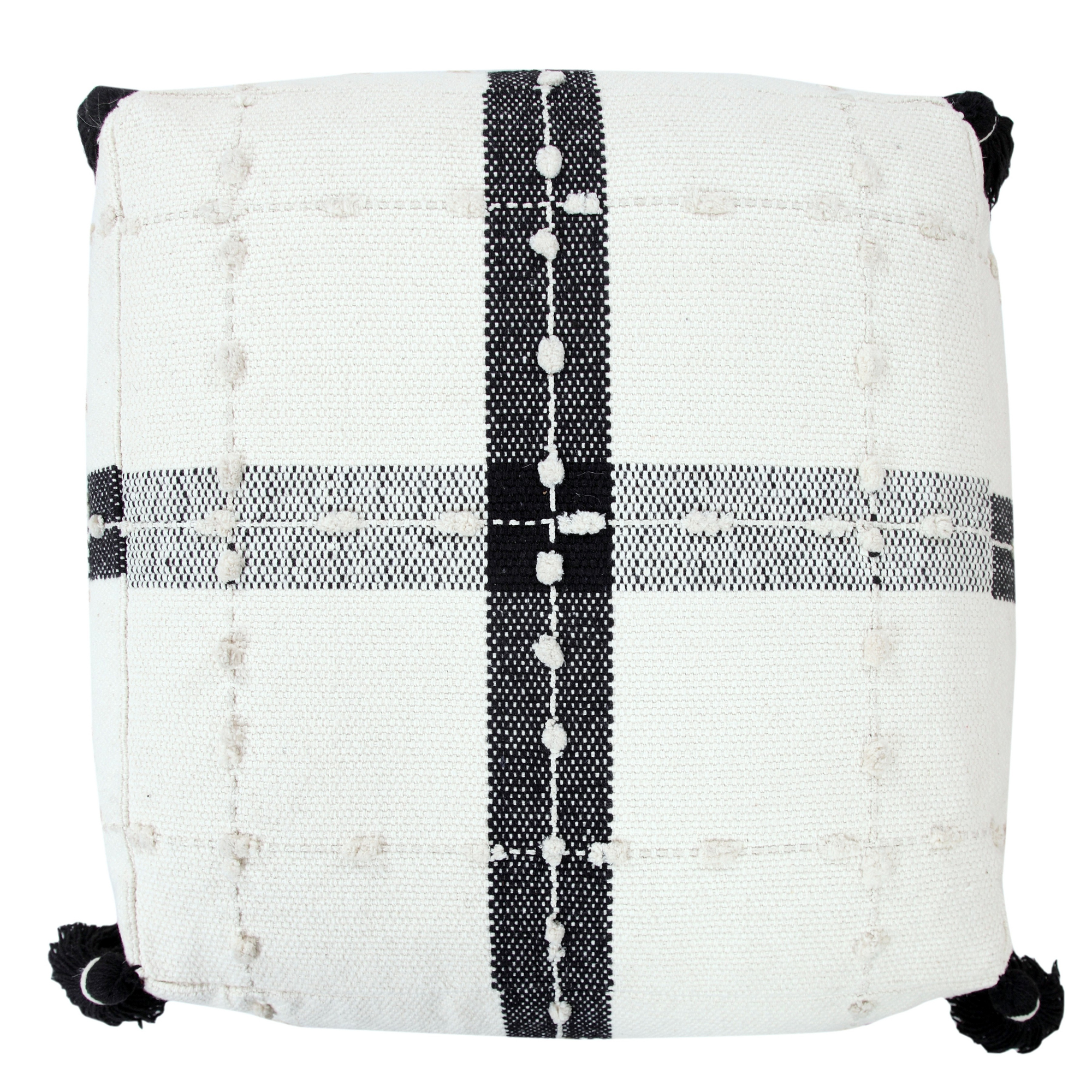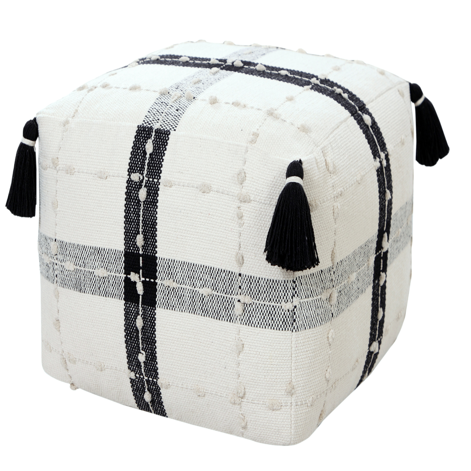 Providing form, function, and fashion all in one charming package, this pouf features a neutral black and ivory color palette with a simple geometric plaid design to go with any style from modern to transitional to farmhouse. Combining an irresistibly touchable texture with corner tassels and all-around detailed dot dimension, this design brings out all the flair to breathe fresh style into your room. Easily tucked away or toted to another room in your home, use this all-in-one object as an additional seat, footrest, stool, ottoman, side table, or just stylish decor. The possibilities are endless!