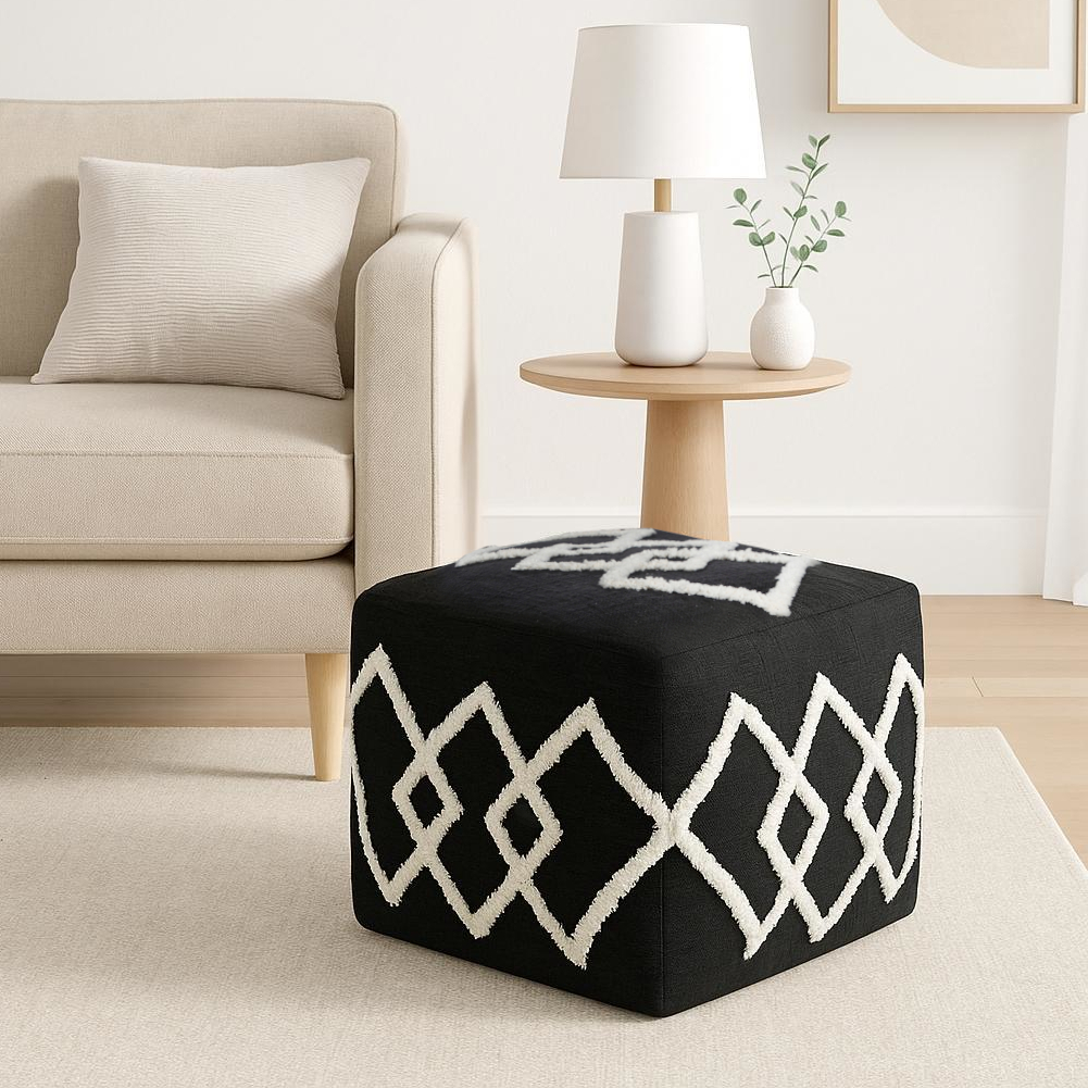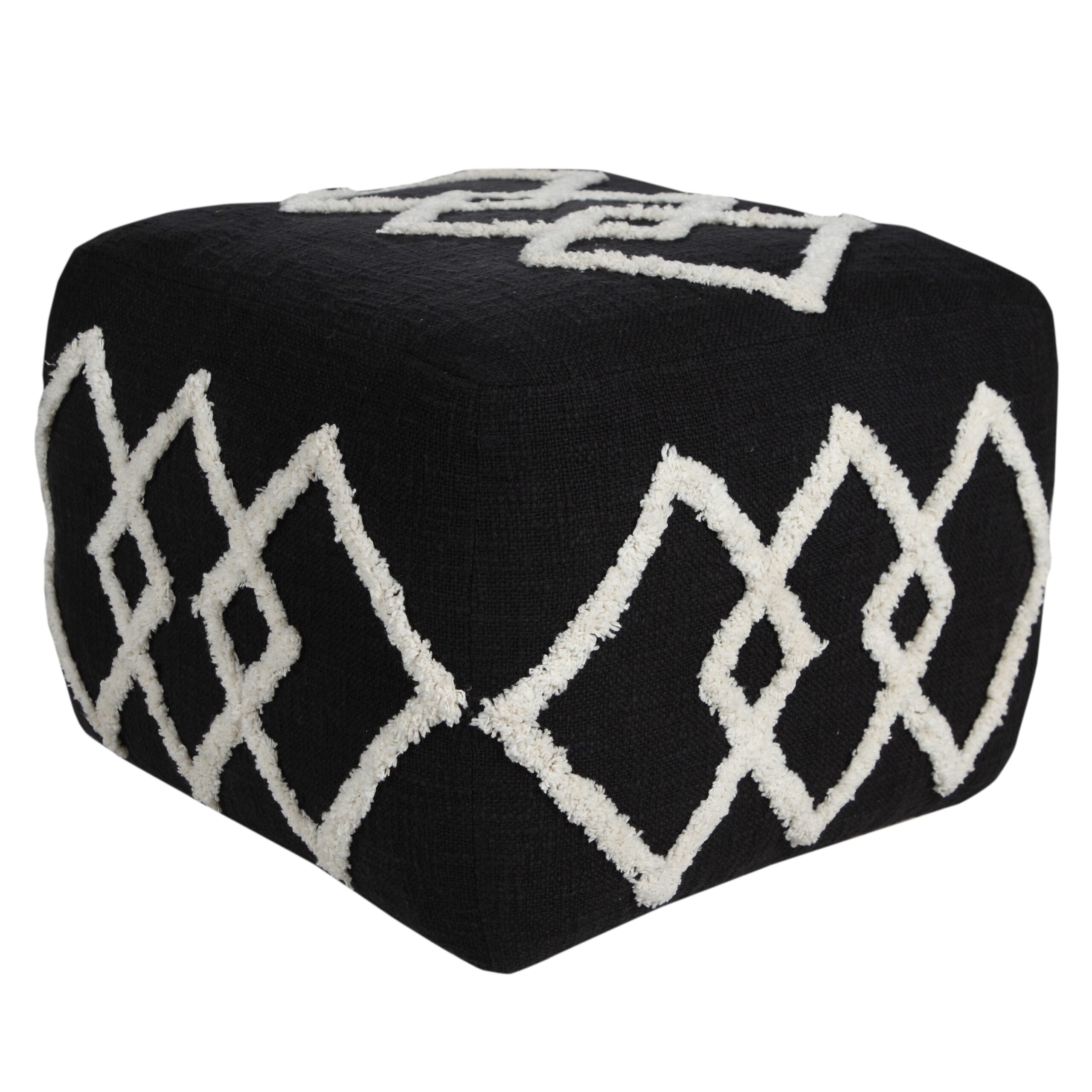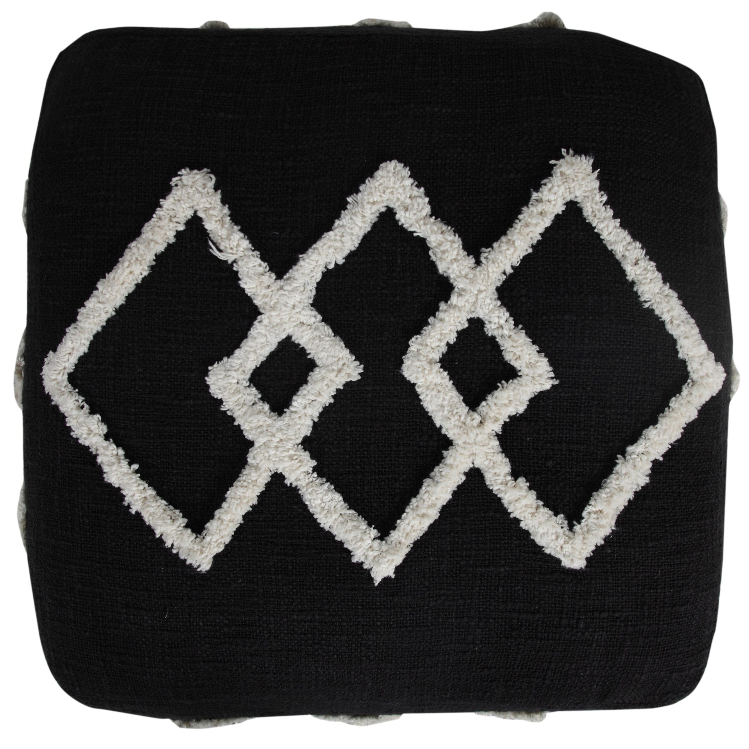 Providing form, function, and fashion all in one charming package, this pouf features a neutral modern motif to go with any style from contemporary to transitional to glam. Combining classic black and white tones with an overlapping diamond design, this piece brings rich textured tufting and dynamic features into your space. Easily tucked away or toted to another room in your home, use this all-in-one object as an additional seat, footrest, stool, ottoman, side table, or just stylish decor. The possibilities are endless!