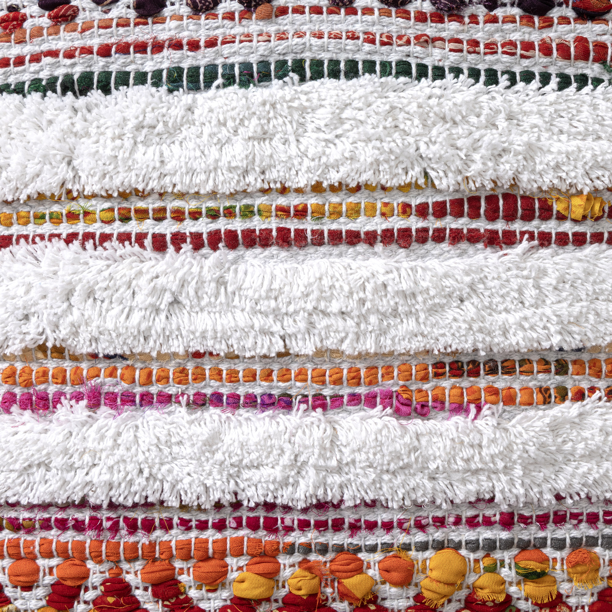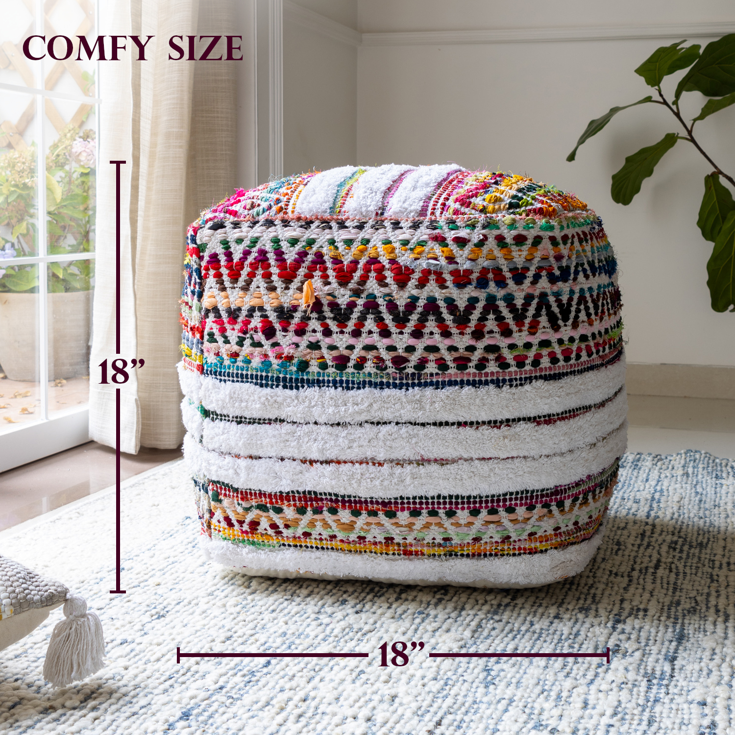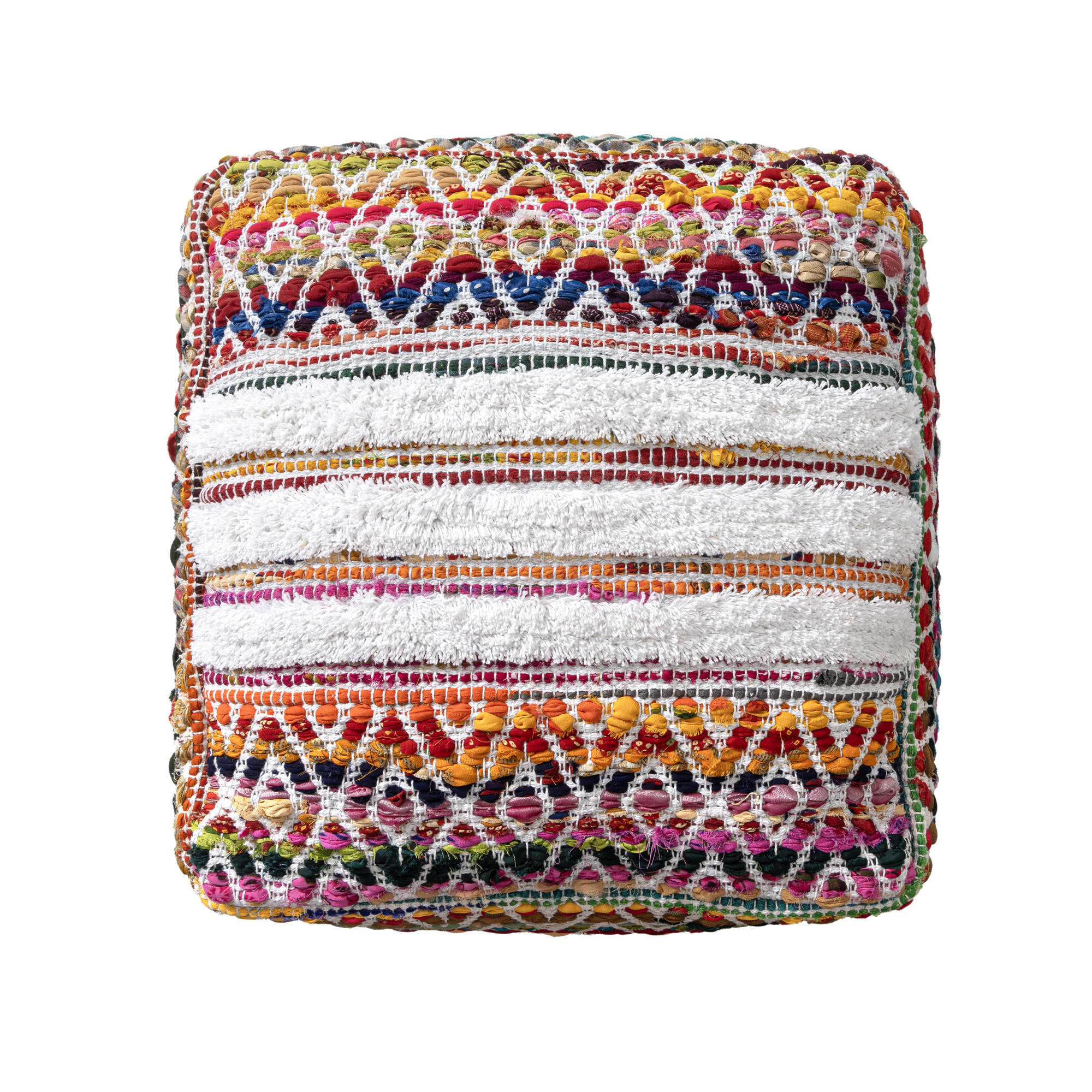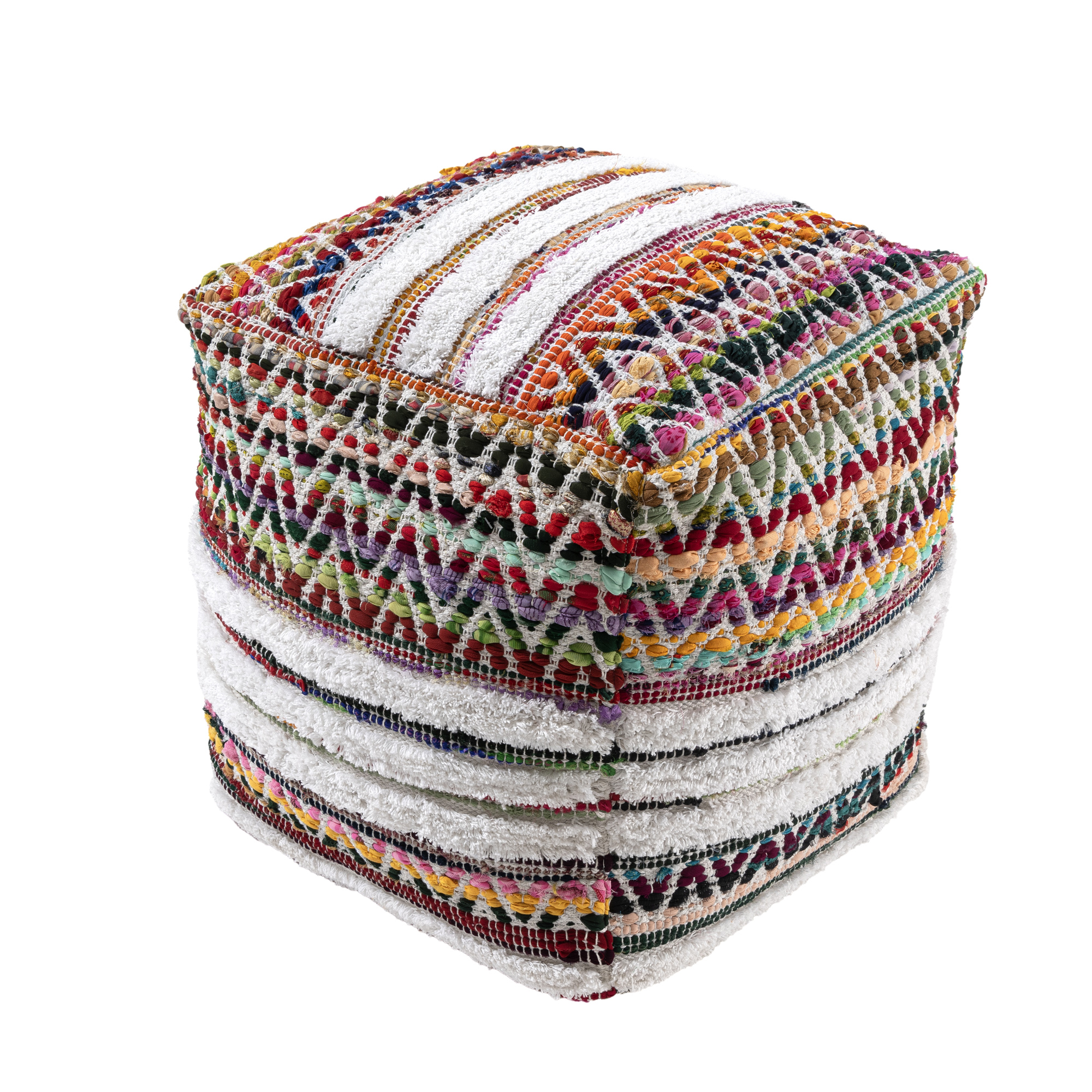 Transform your space with a versatile square pouf, perfect for adding style and functionality to your home. Handmade in India from a durable blend of cotton and polyester, this pouf offers both comfort and long-lasting use. Its chevron and striped pattern with a bohemian-inspired design brings casual elegance to any room. Ideal for use as extra seating, an ottoman, or a decorative accent, this pouf features a tufted texture and multicolor design for visual interest, while the EPS ball filling provides a soft and supportive feel.